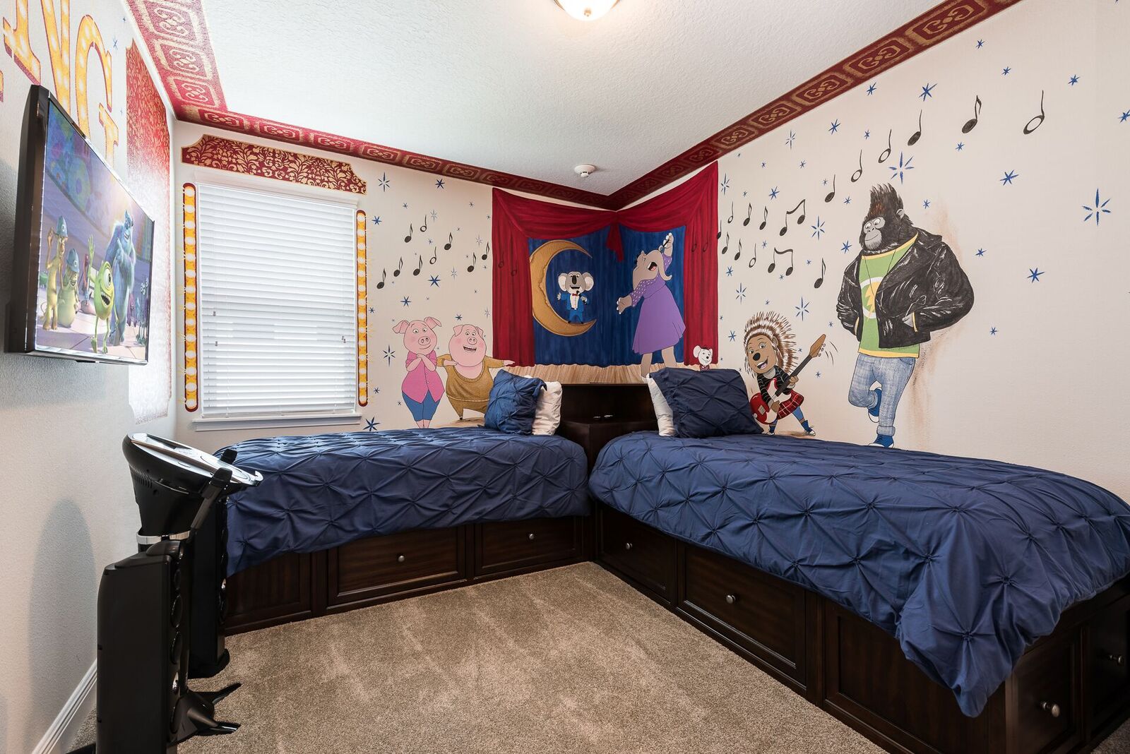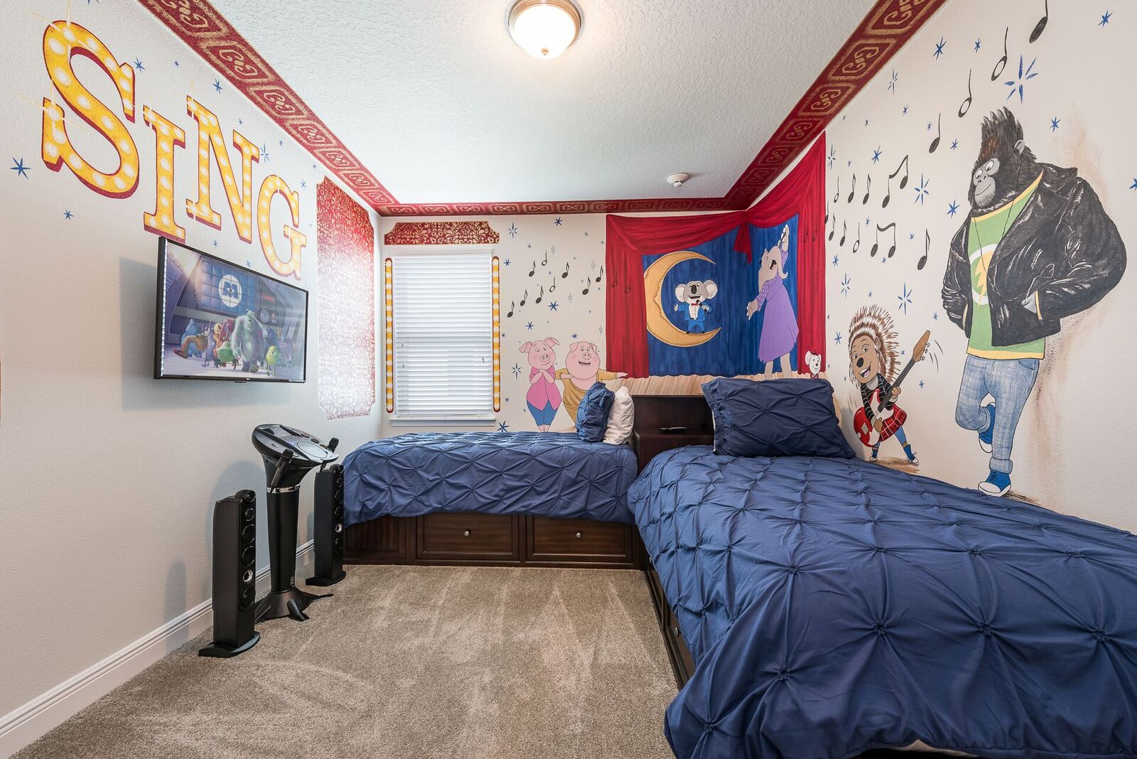 'Sing' themed bedroom with 2x Twin sized beds, en suite (shower/bath combo), and karaoke machine