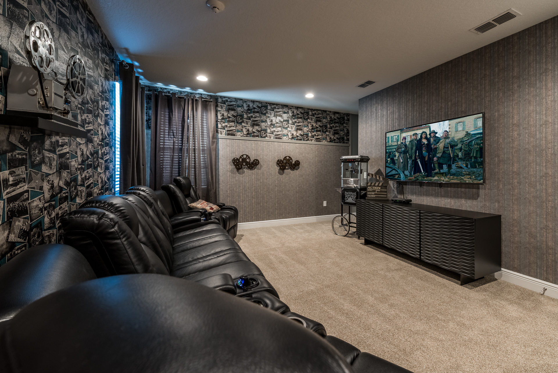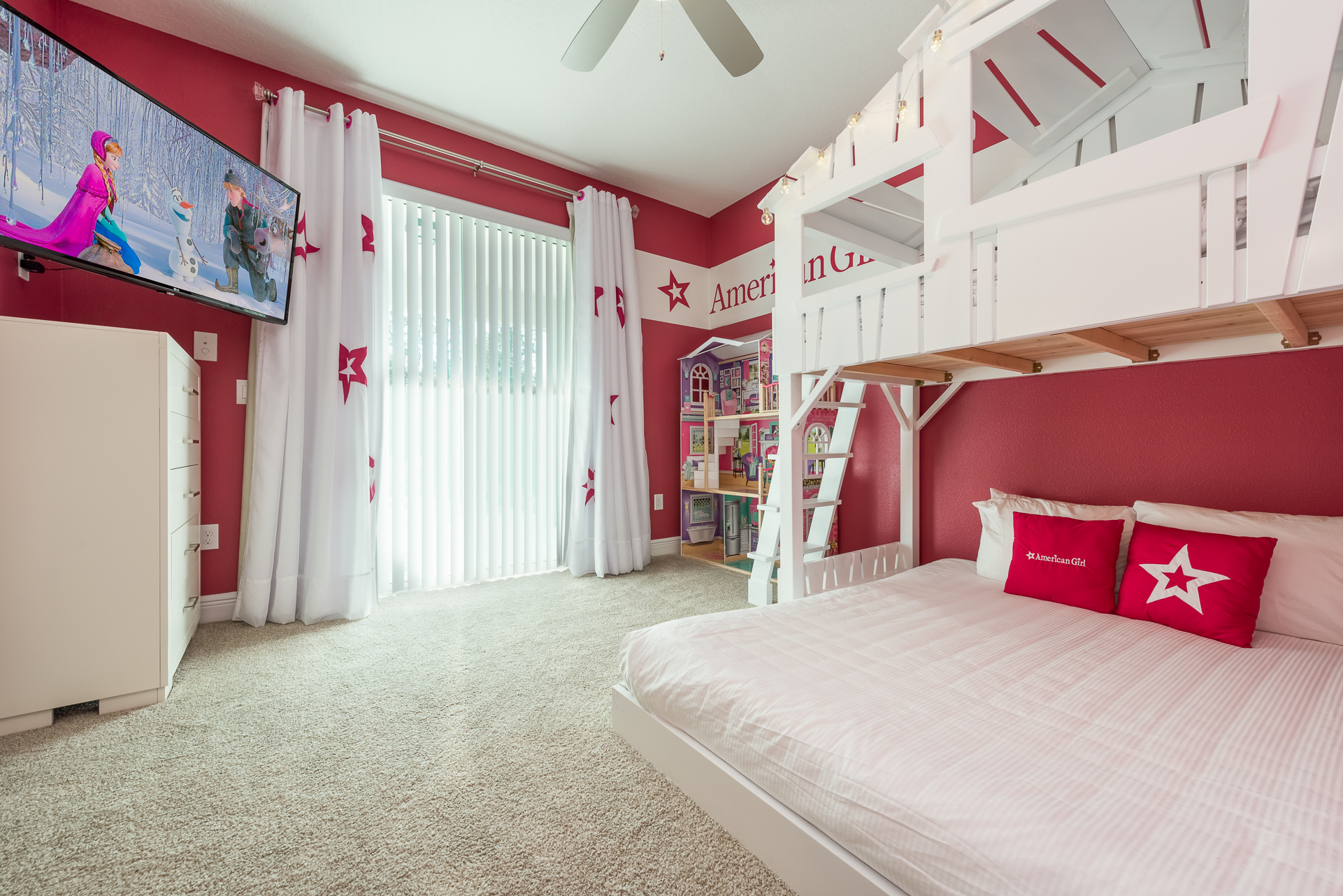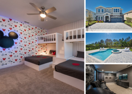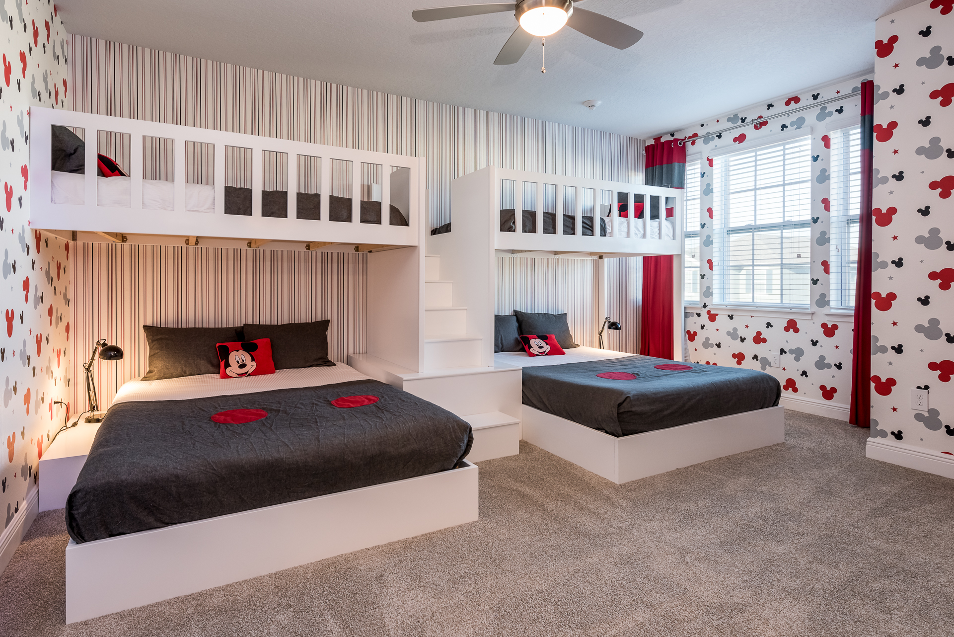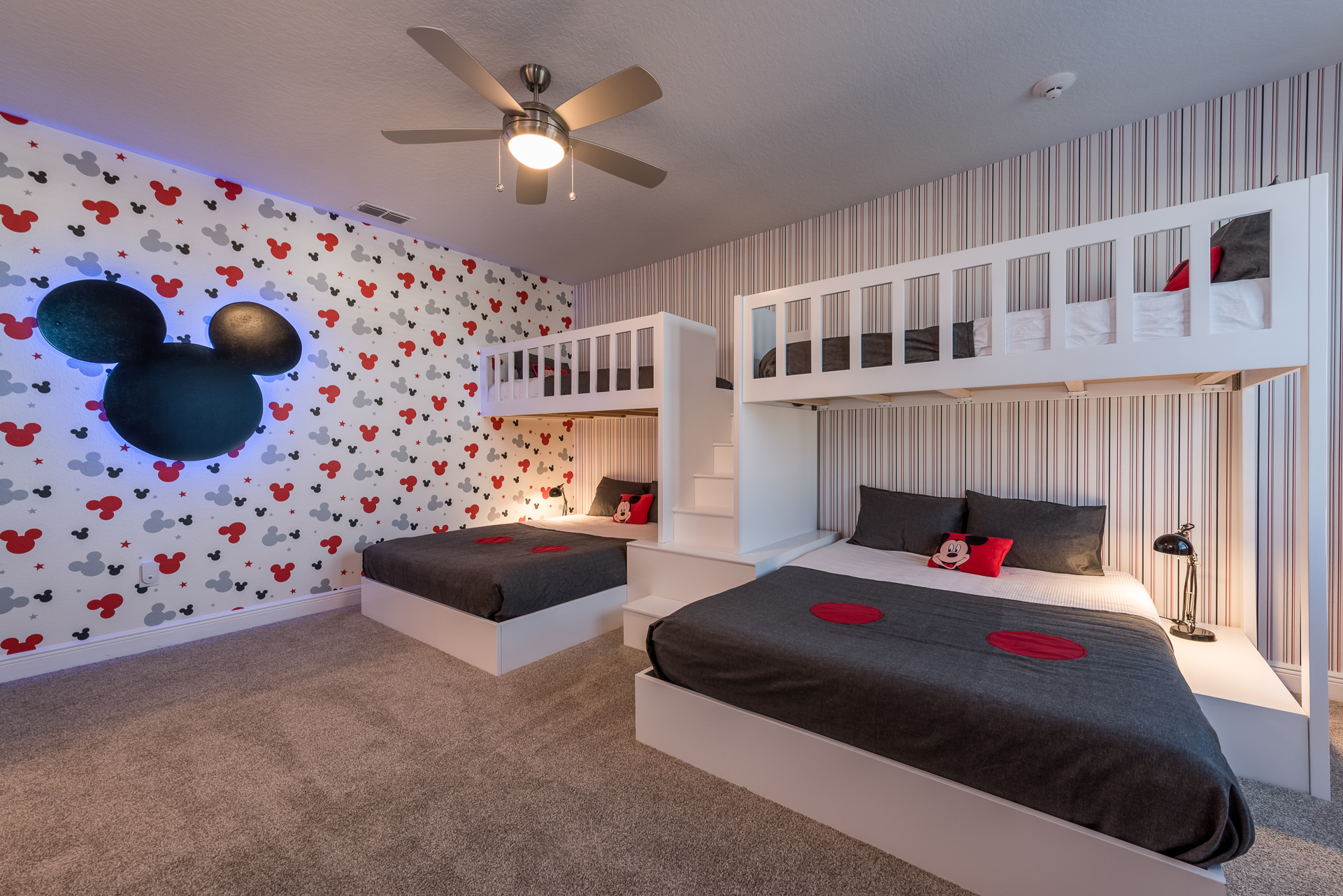 Sleeping up to 18 people, EC225 has bedrooms across both floors including 2 children's themed bedrooms! The upper floor loft area is equipped with a PS4 video game console as well as the home theater has a large projection screen for all your favorite movies , so the fun does not have to end at the theme parks!