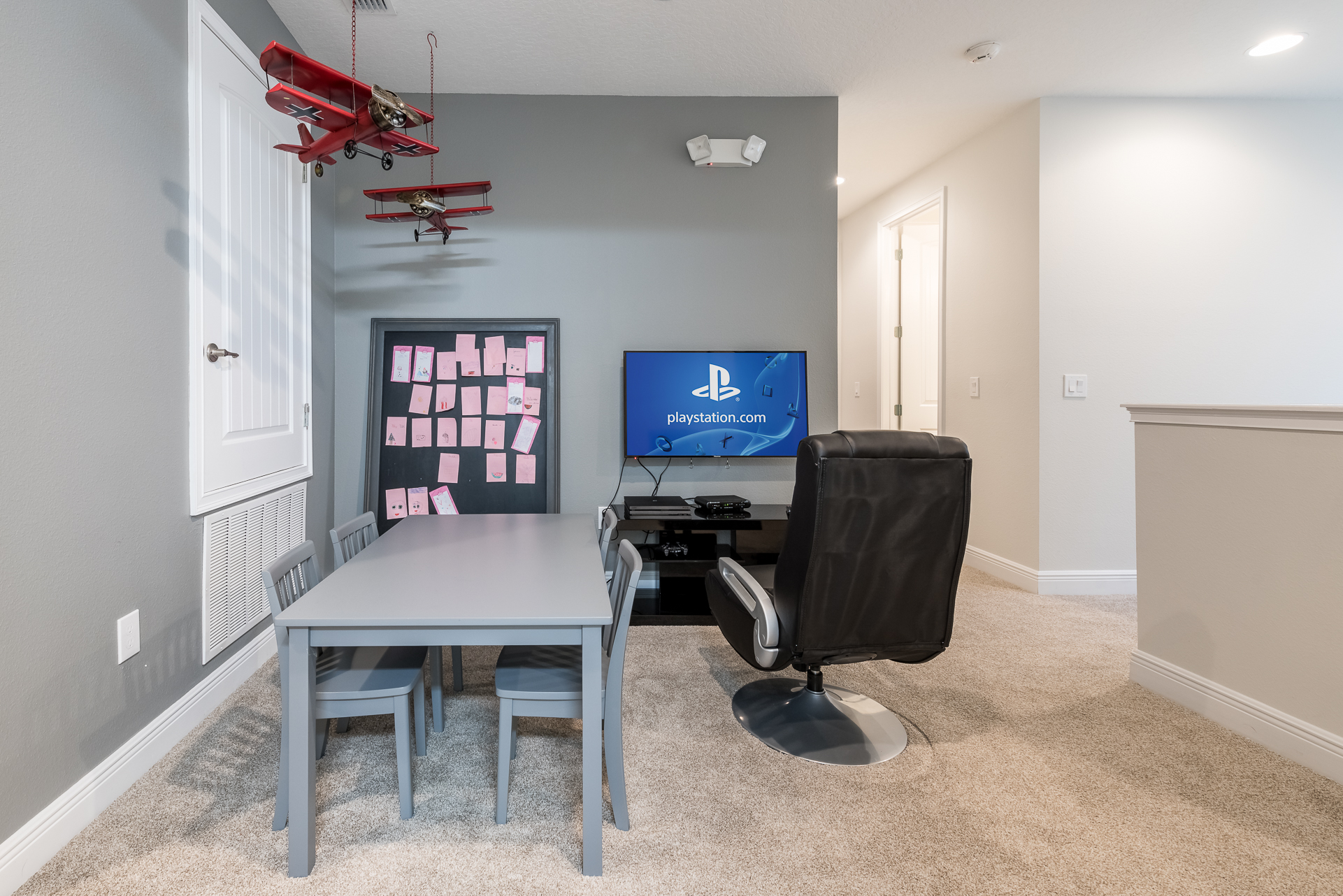 Upper floor loft area has a 4 seat kid's table, large flat screen TV with PS4 video game console, video game chair