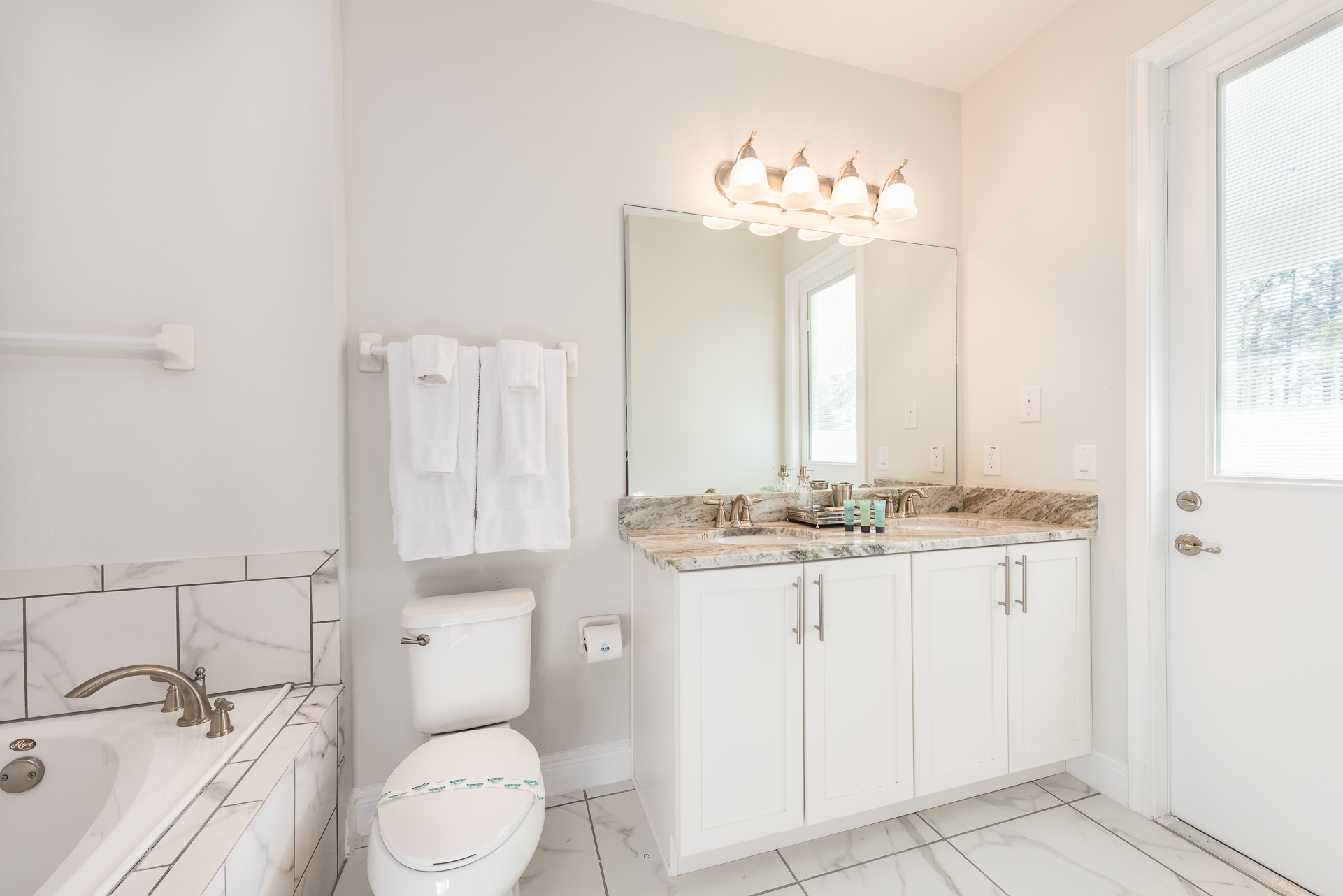 Themed bedroom with bunkbeds (Full/Twin sized beds), en suite (shower, tub, twin vanities) and patio access