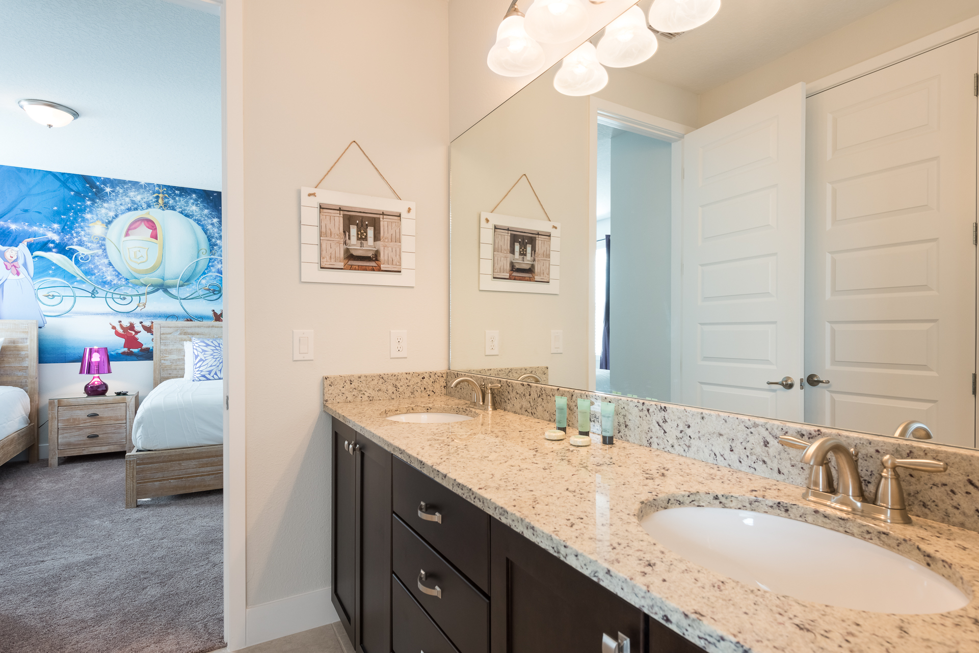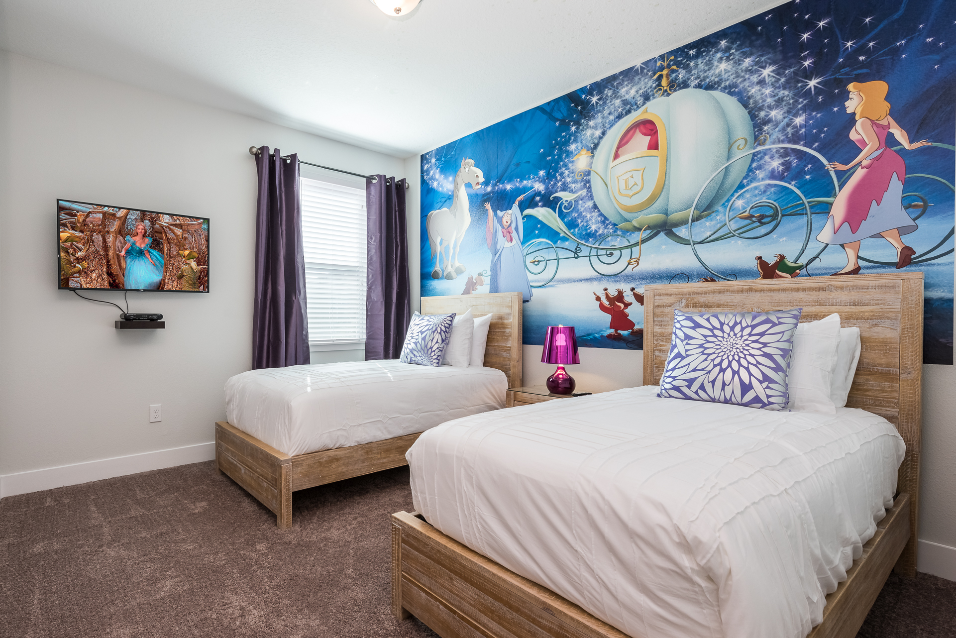 'Cinderella' themed bedroom with 2x Twin sized beds and an en suite (Jack/Jill style-shower/bath combo, twin vanities) conencting to a Queen sized bedroom with a private balcony over the front of the home