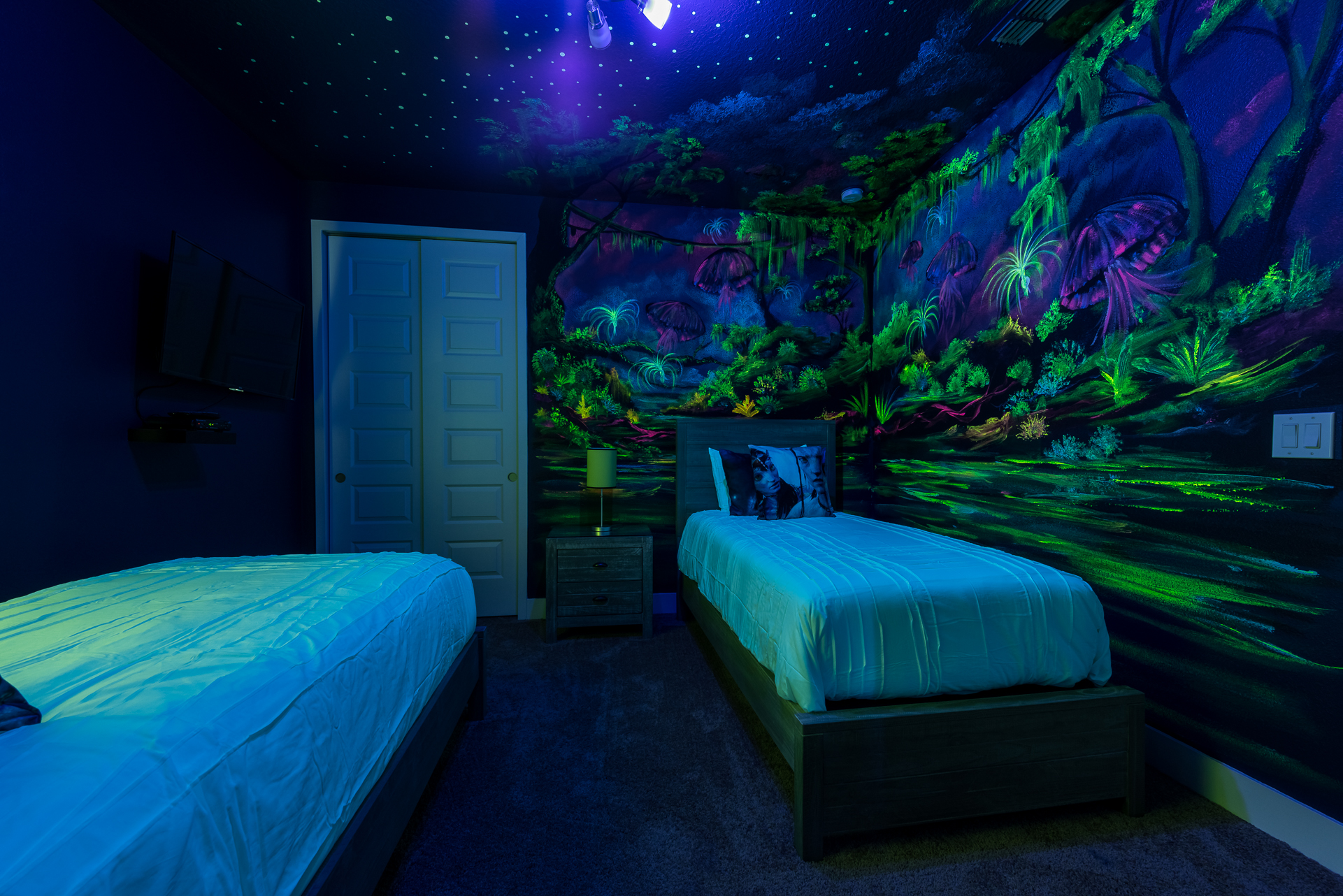 'Avatar' themed bedroom with 2x Twin sized beds and an en suite (shower), blacklight features