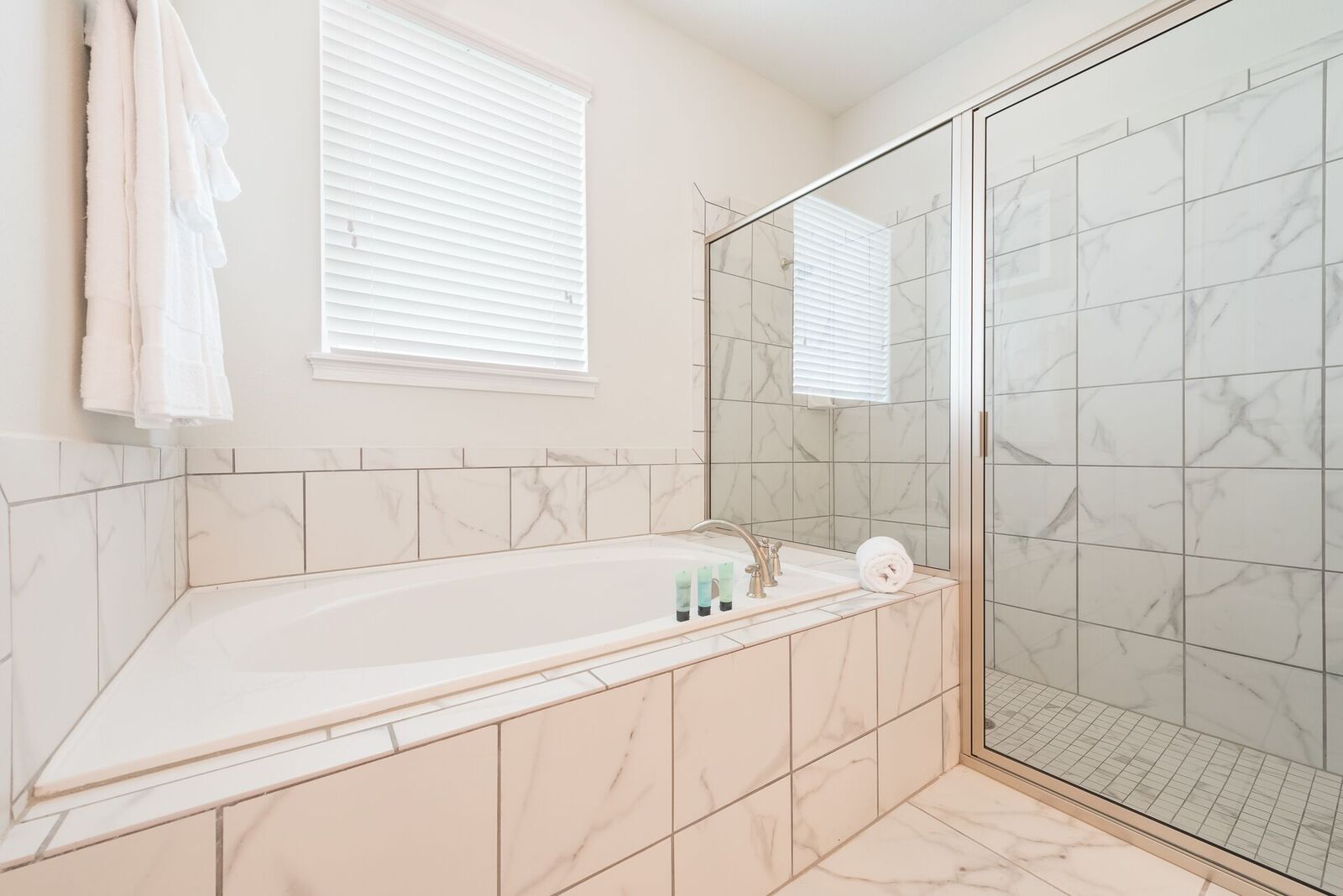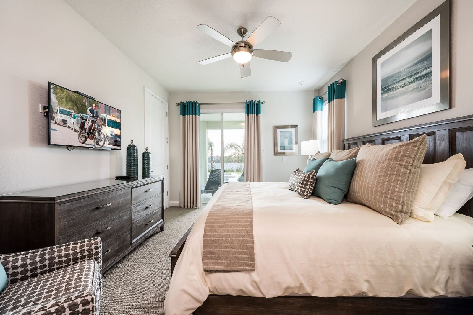 King sized Master with en suite (shower, tub, twin vanities), an accent chair, and patio access