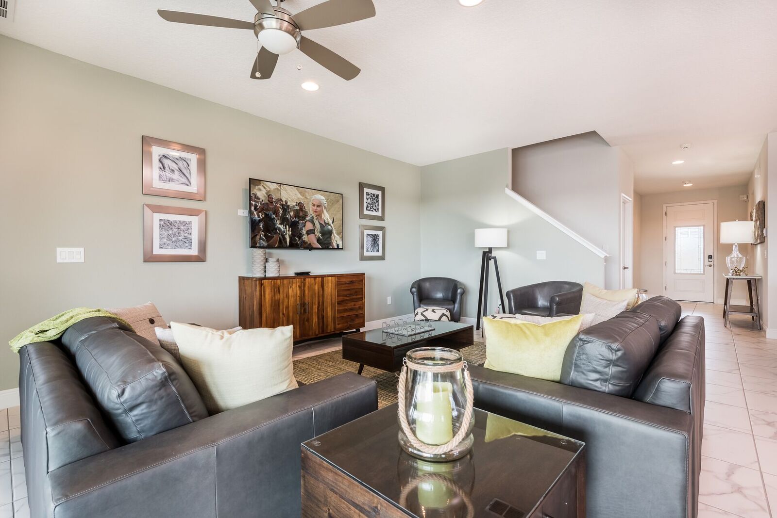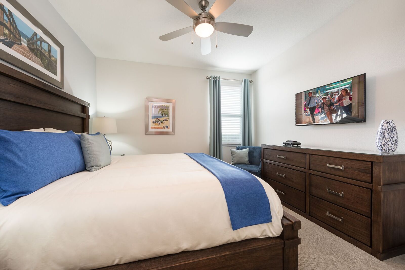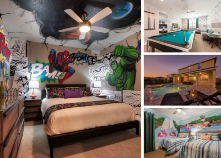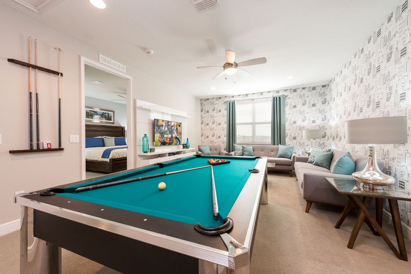 Sleeping up to 16 people, EC233 has bedrooms across both floors including 3 children's themed bedrooms and is furnished with a contemporary twist! The upper floor loft area is equipped with a pool table as well as 2 PS4 video game consoles so the fun does not have to end at the theme parks!
