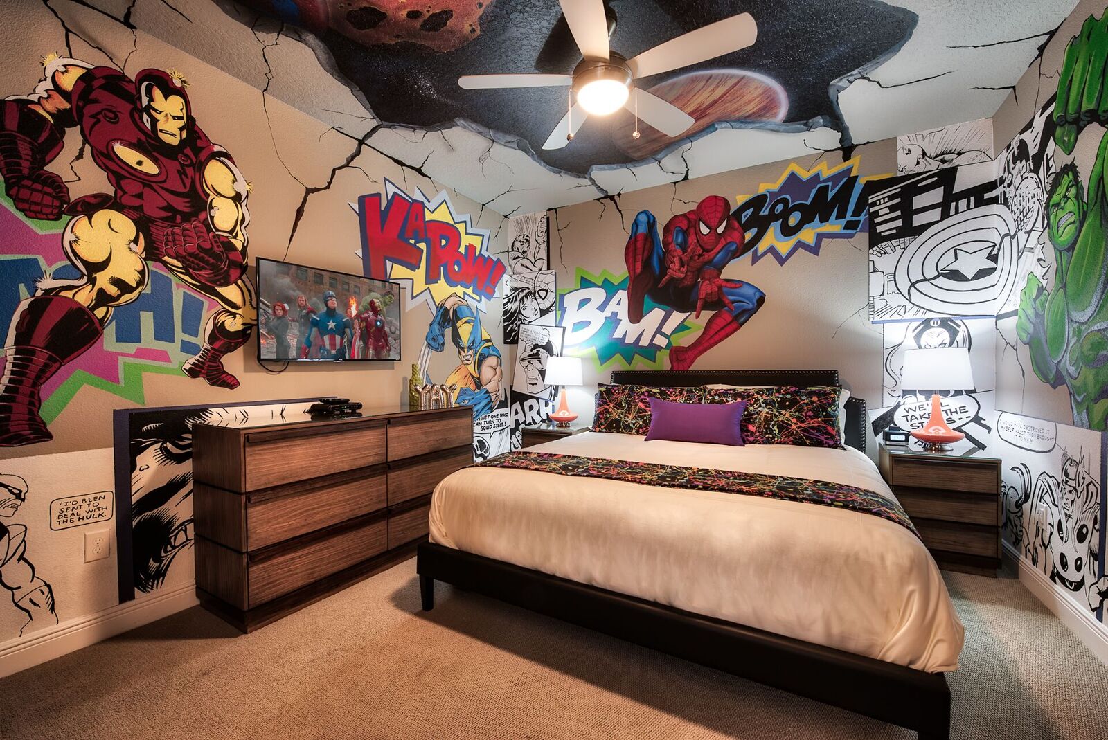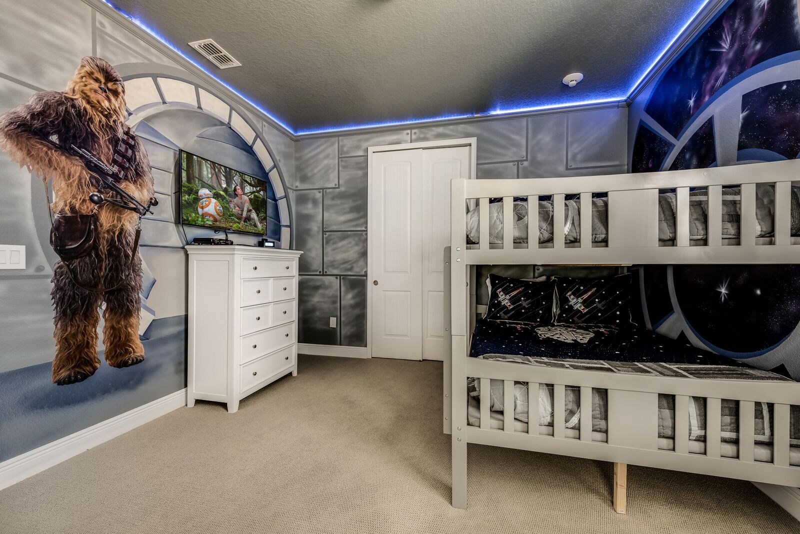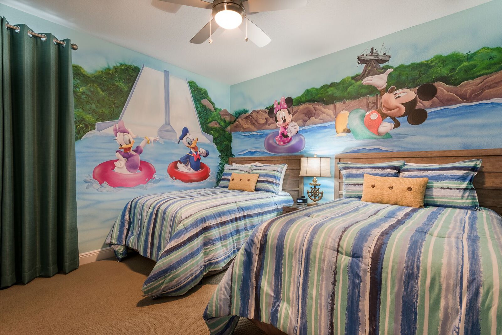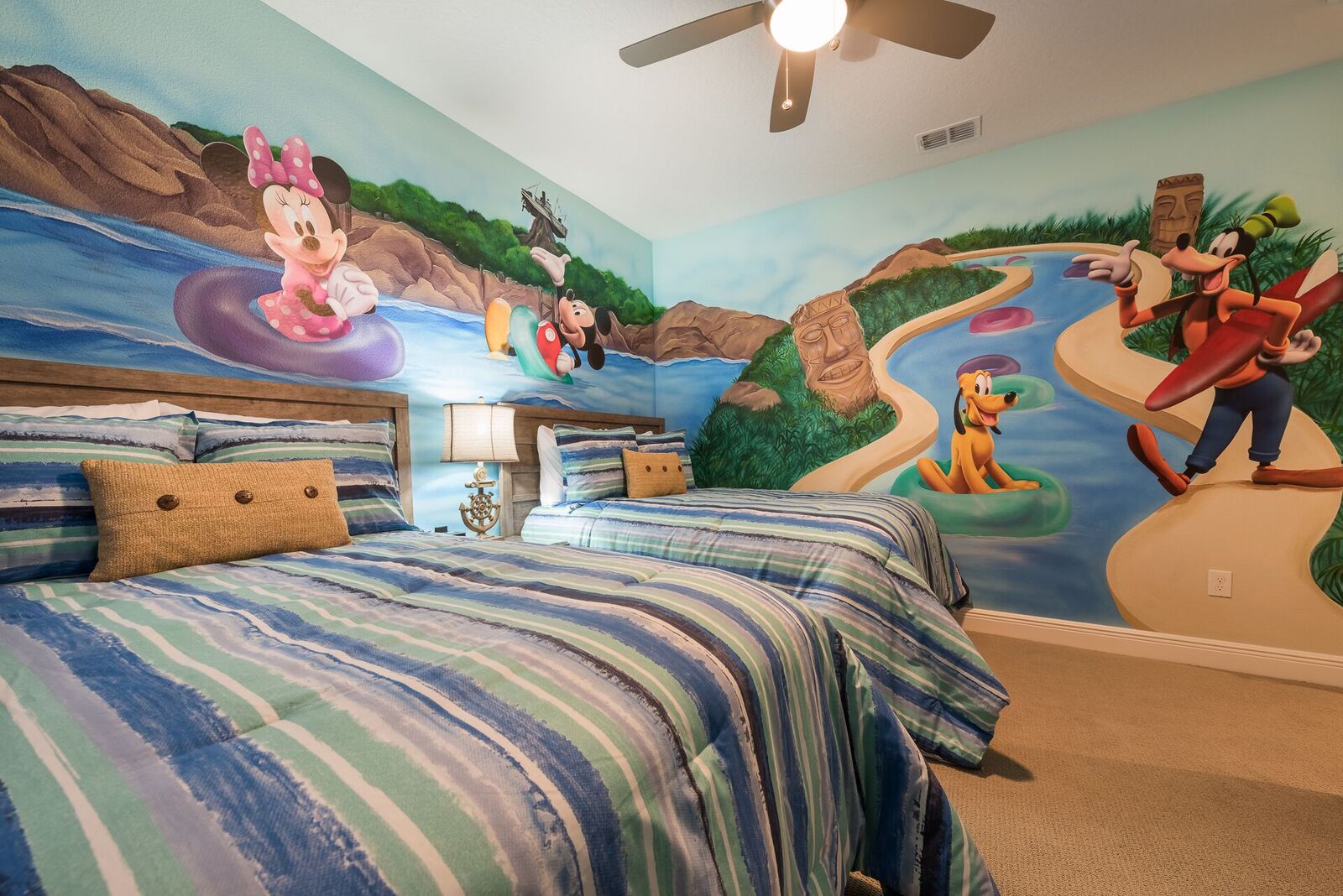 Themed bedroom with 2x Full sized beds and an en suite (Jack/Jill style-shower/bath combo, 2 separate sinks) connecting to another themed bedroom with a King sized bed