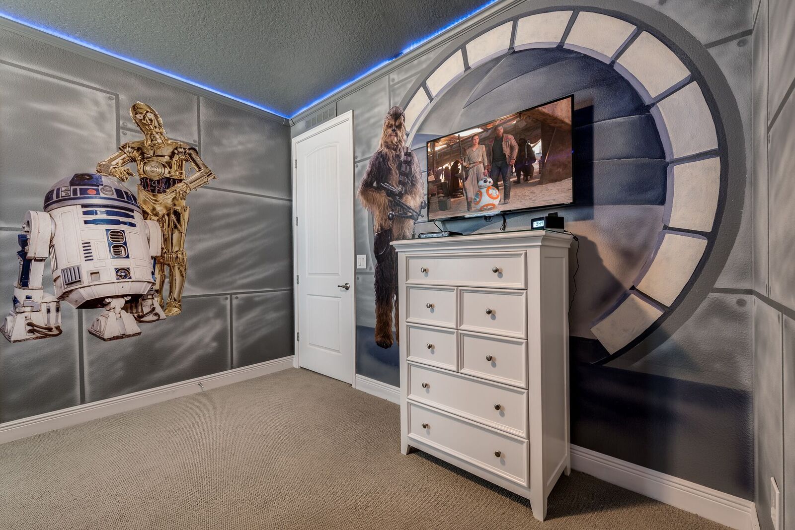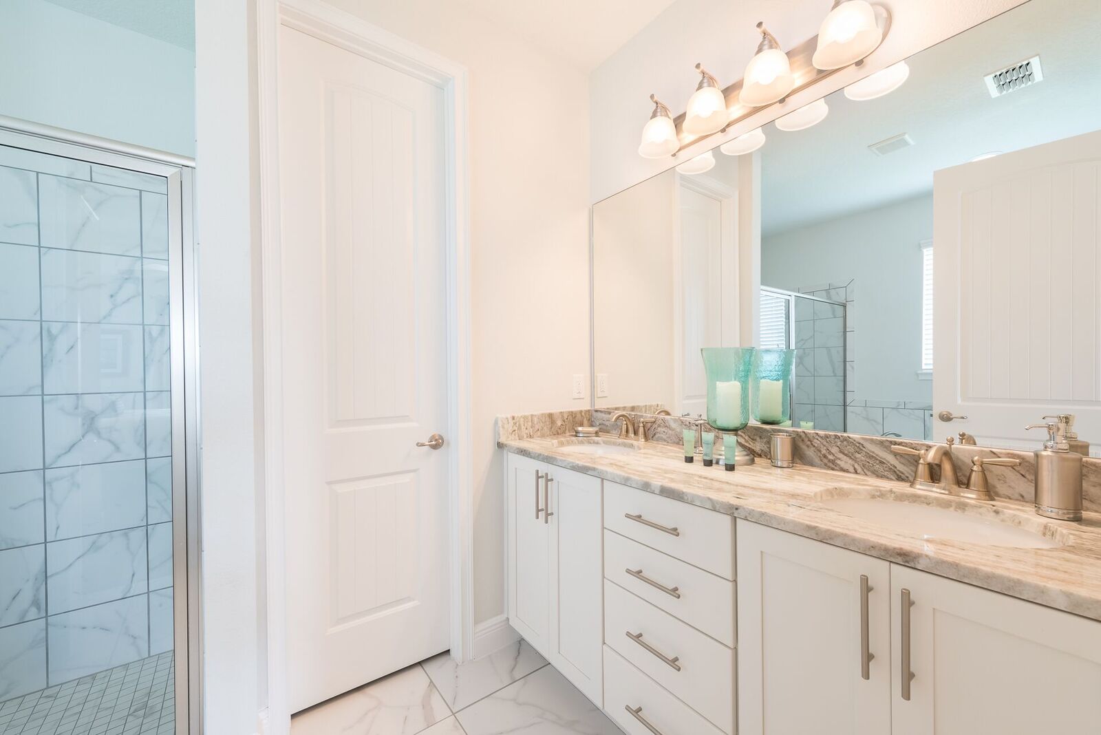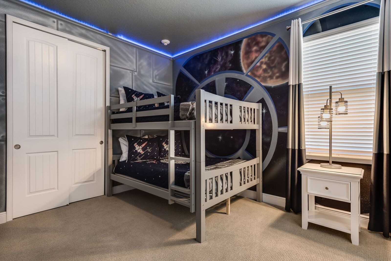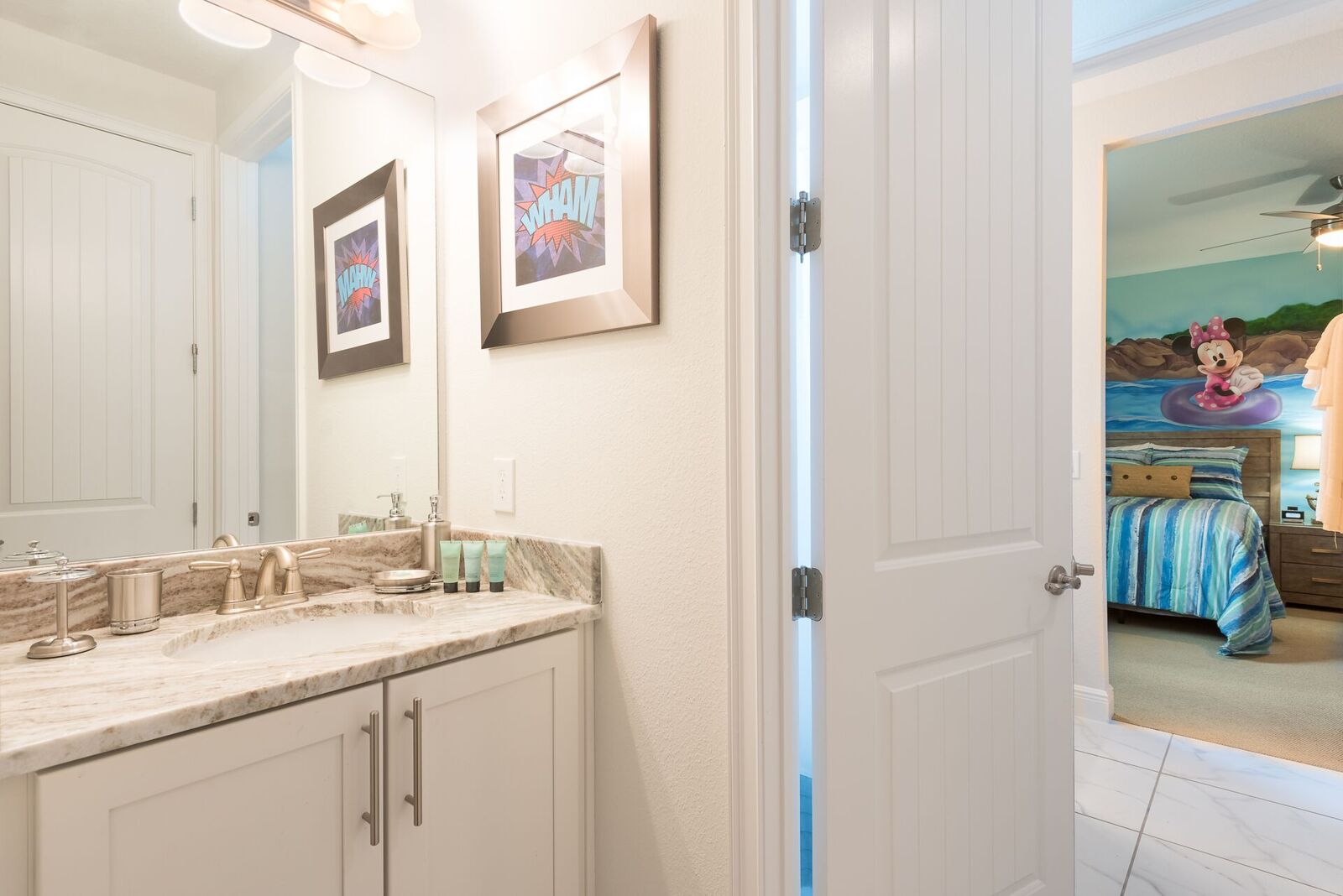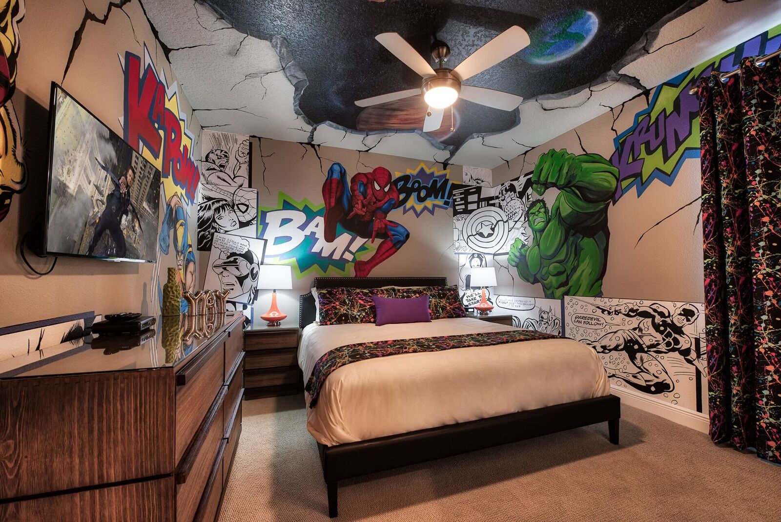 Themed bedroom with 2x Full sized beds and an en suite (Jack/Jill style-shower/bath combo, 2 separate sinks) connecting to another themed bedroom with a King sized bed