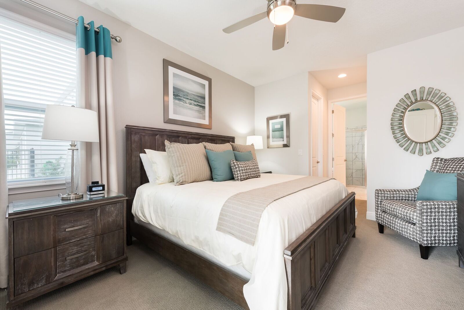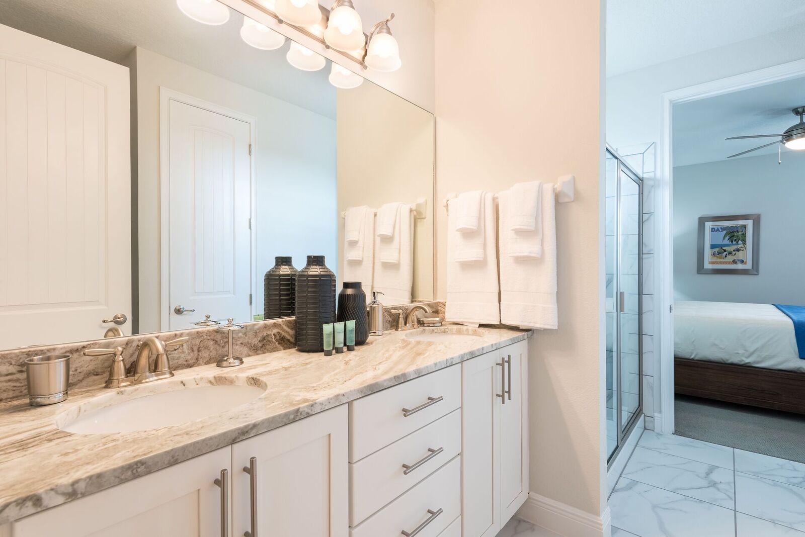 King sized bedroom with an accent chair and en suite (Jack/Jill style-shower, twin vanities) connecting to a themed bedroom with bunkbeds (2x Full sized beds)