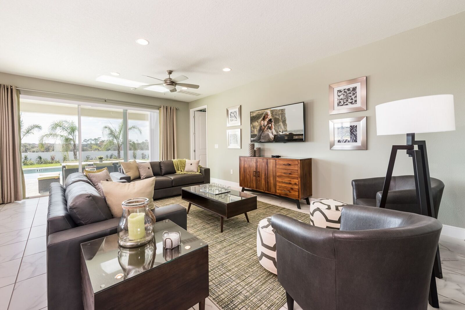 Spacious comfortable seating area with 2x leather sofas and 2x leather accent chairs overlooking the private pool deck through sliding glass doors