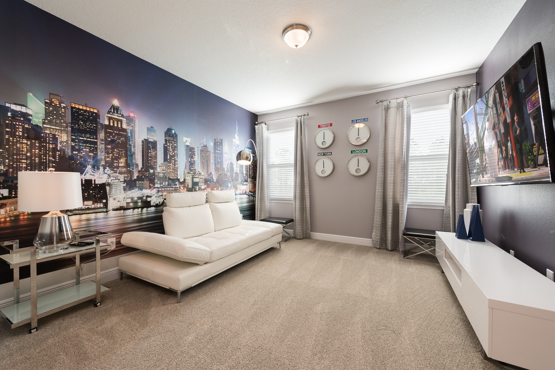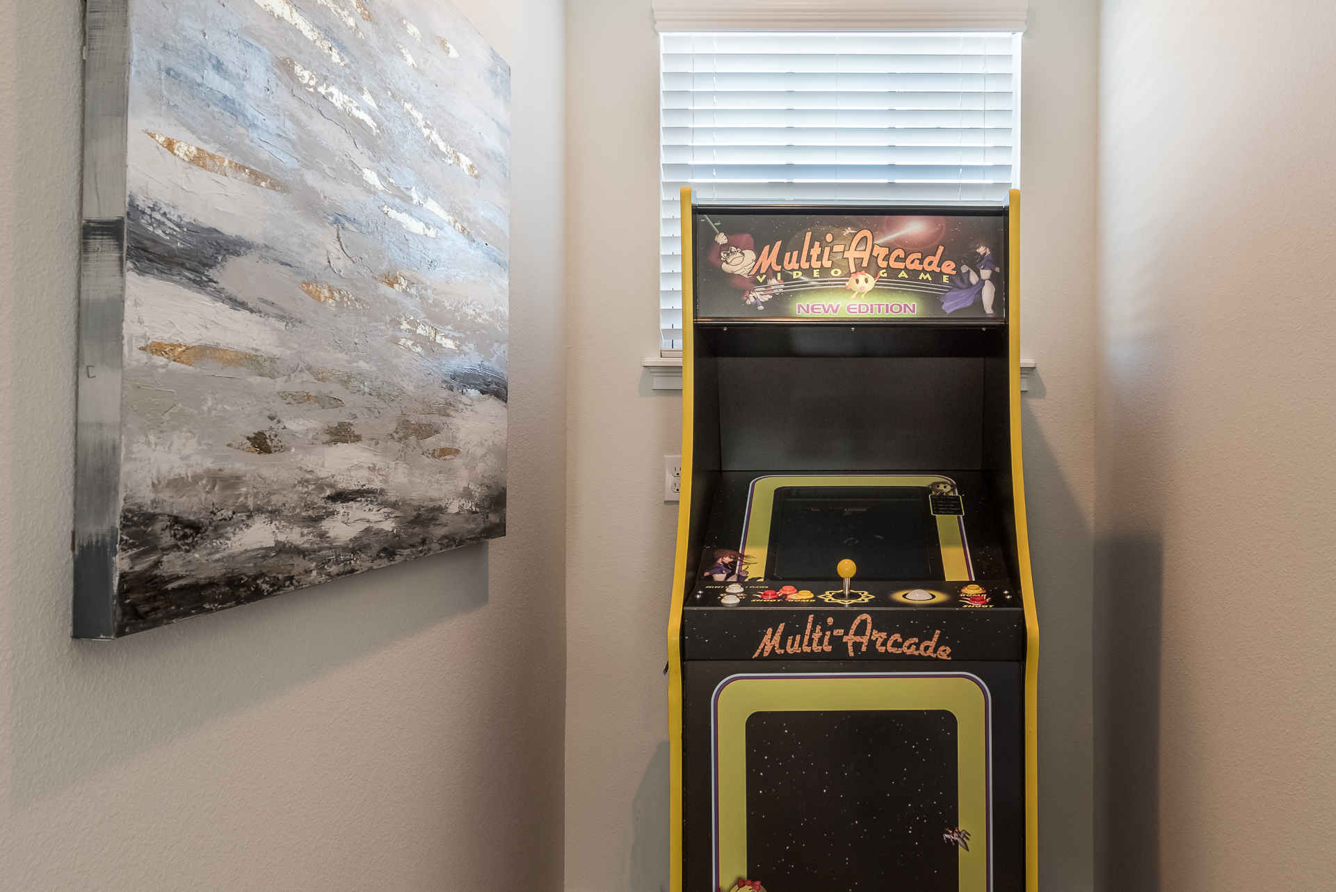 Upper floor loft area has a large flat screen TV, leather sofa, and an arcade video game