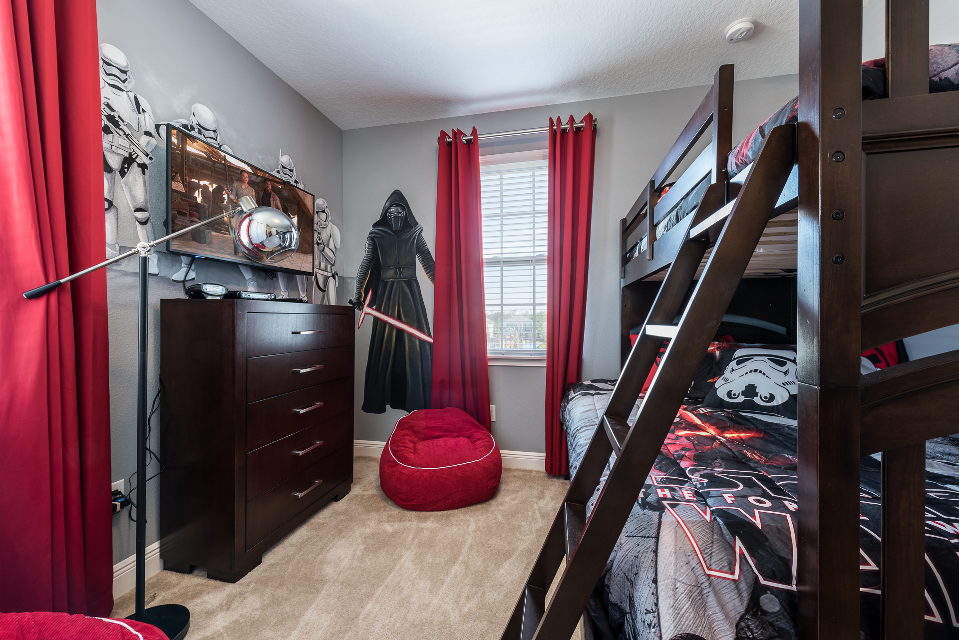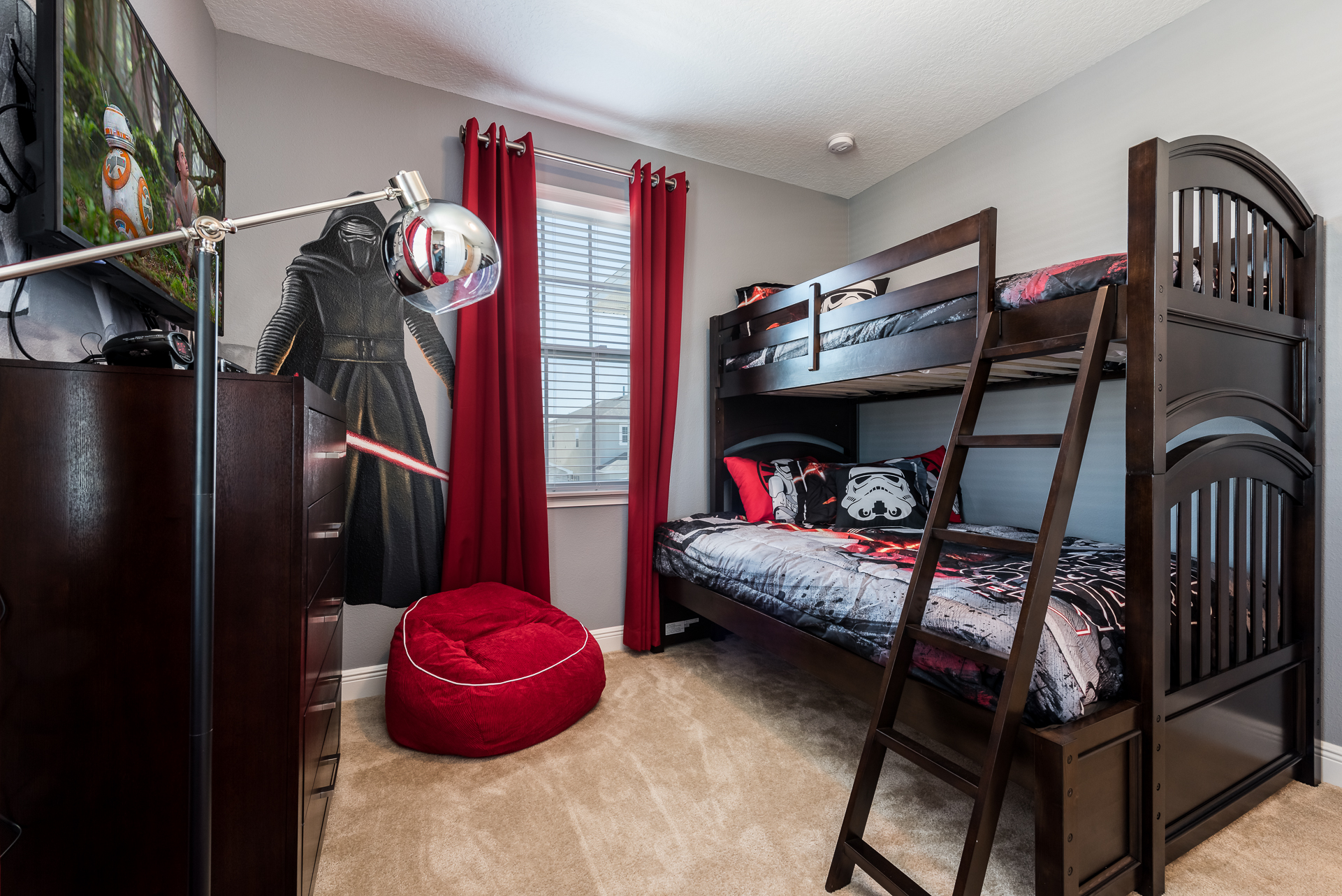 Themed bedroom with bunkbeds (Twin/Full sized bed) and an en suite (shower), 2x bean bag chairs