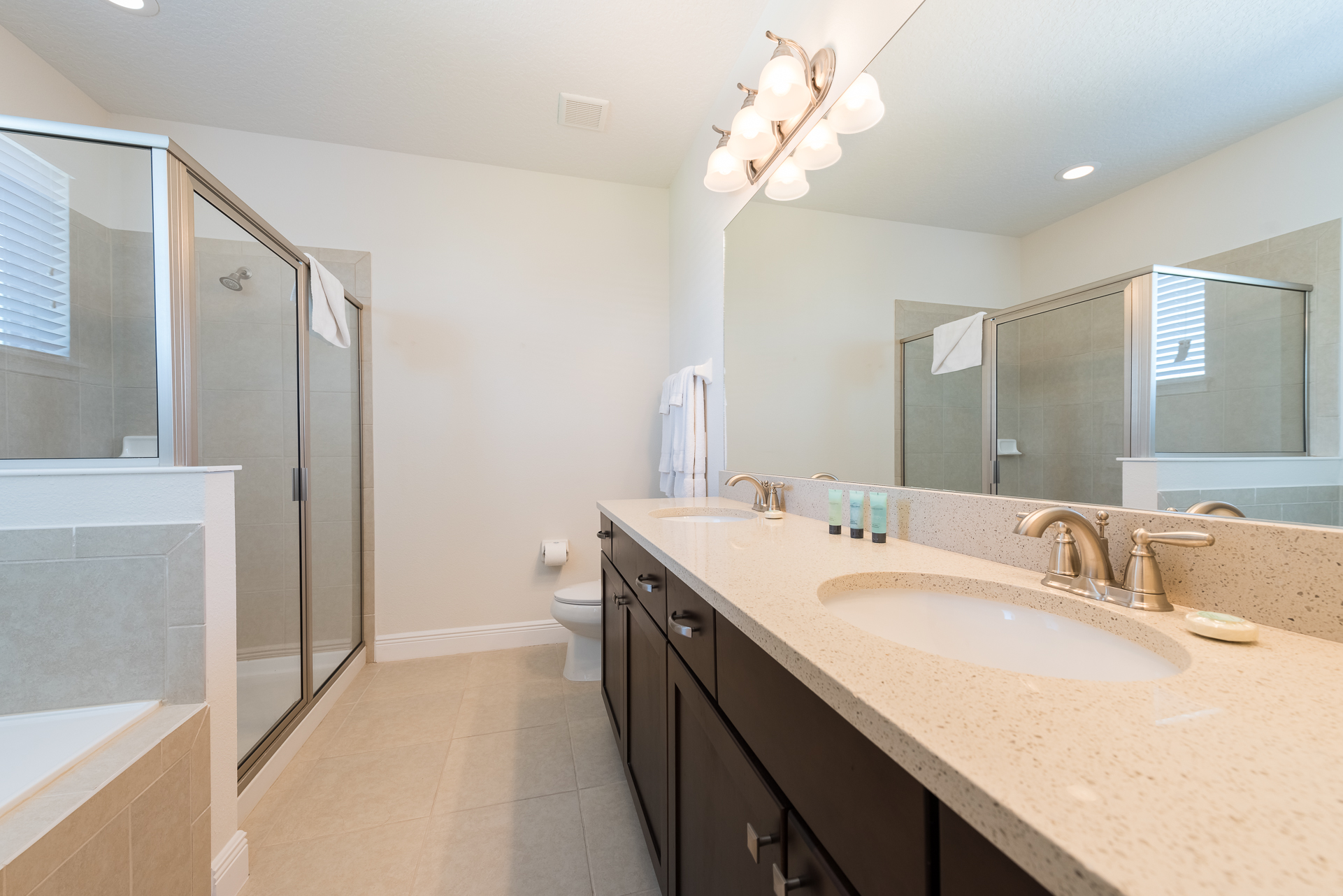 King sized Master with en suite (shower, tub, twin vanities) and patio access