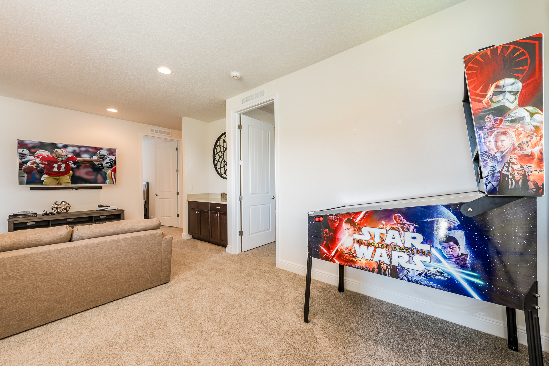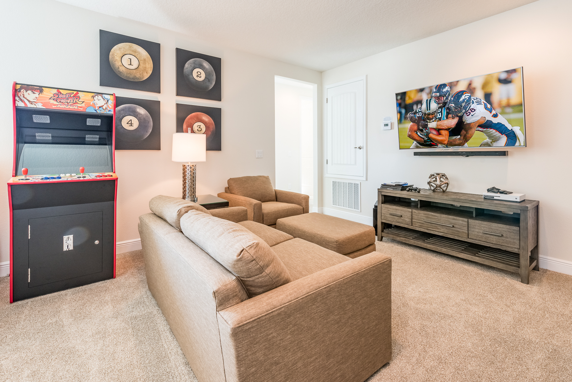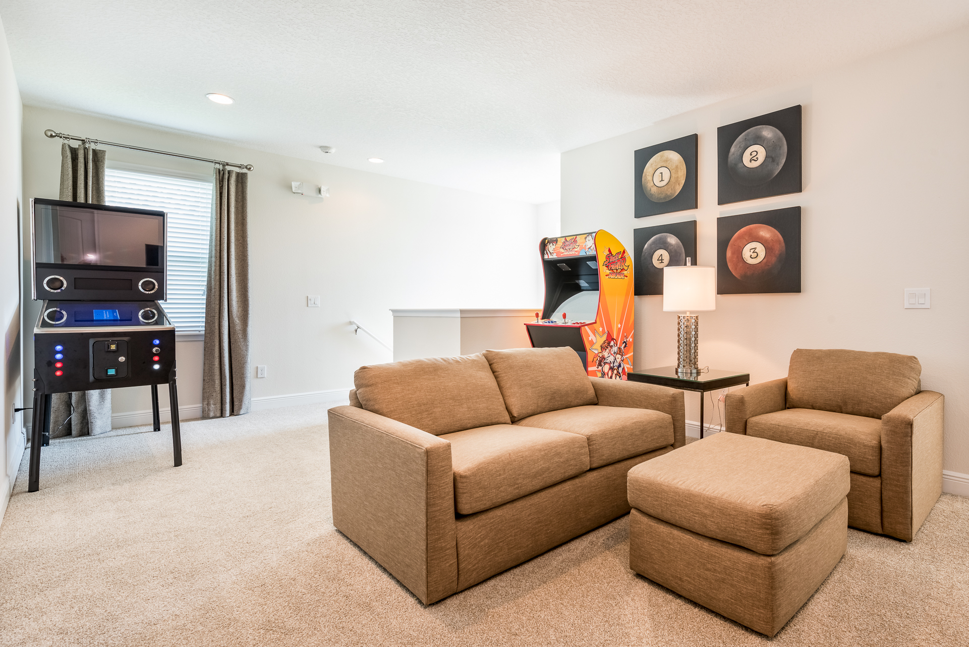 Upper floor loft area has a large flat screen TV with an X-Box and PS4 video game console, sofa, accent chair, 2x arcade video games including 2000 retro games and an electronic pinball machine with over 400 games