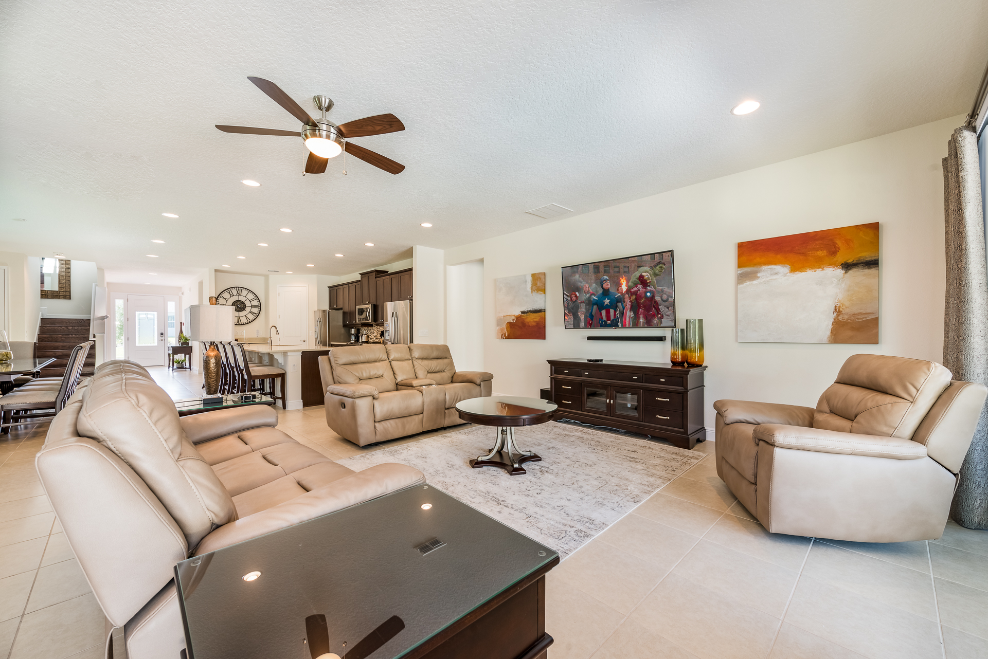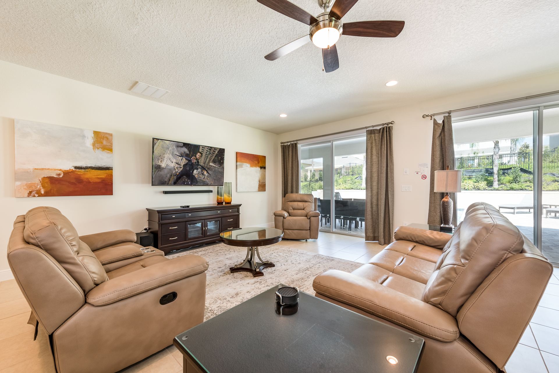 Spacious comfortable seating area with 2x leather reclining sofas and a leather reclining accent chair overlooking the private pool deck through sliding glass doors
