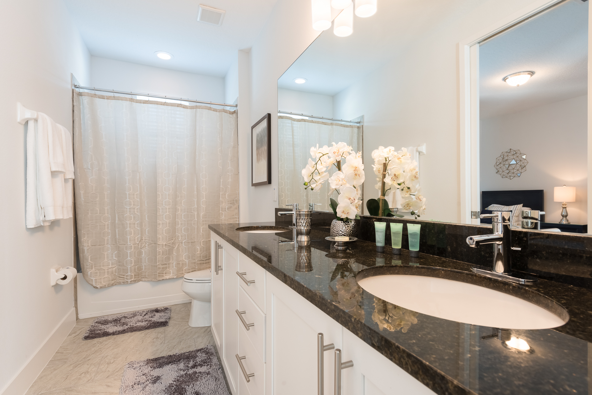 A bedroom with 2x Twin sized beds and an en suite/family bathroom (shower/bath combo, twin vanities)