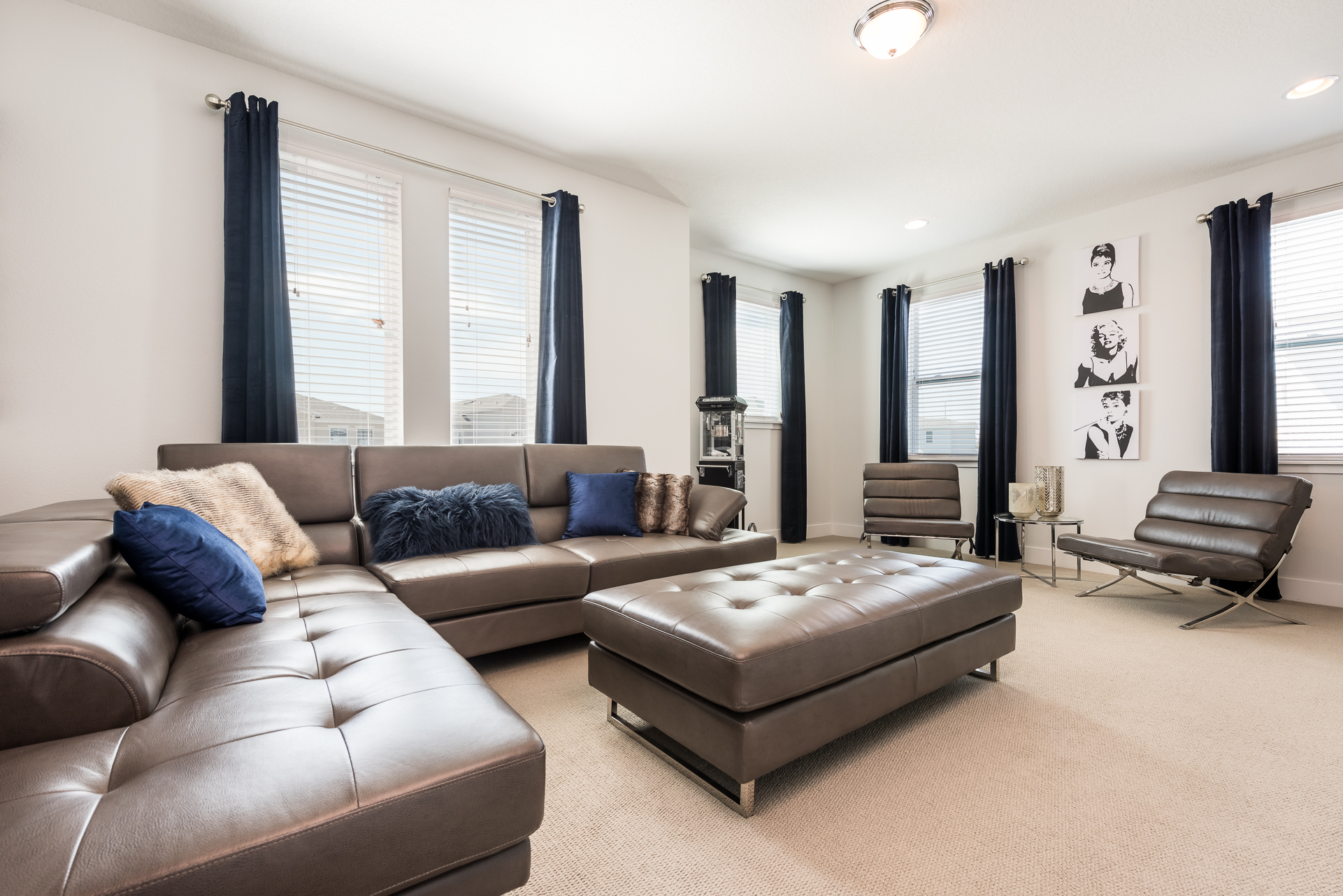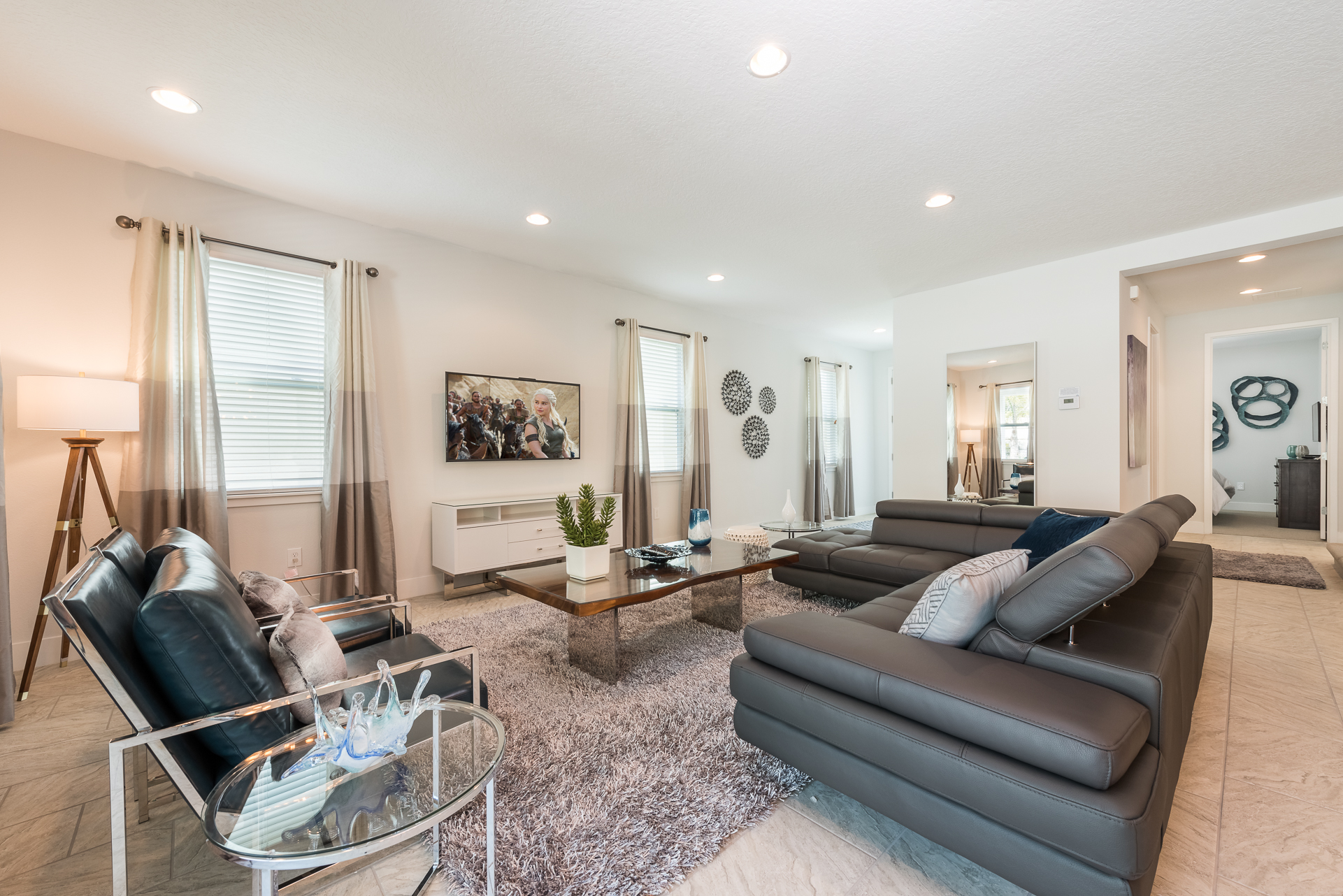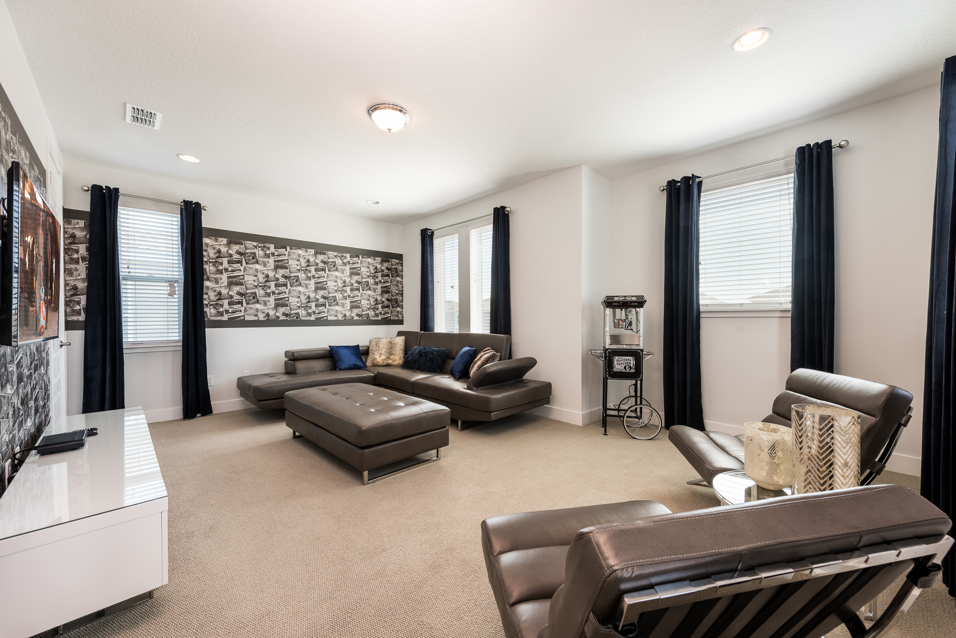 Upper floor loft area has a large flat screen TV, leather sectional, and 2x accent chairs