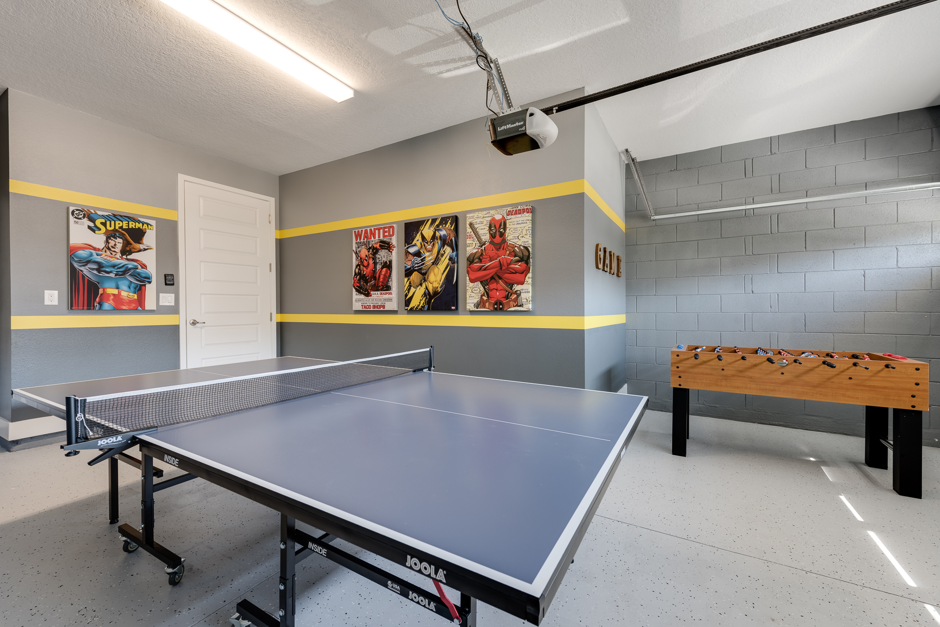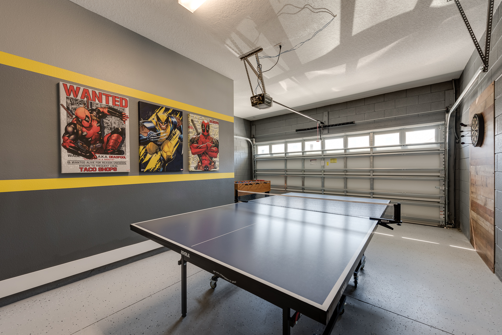 Games room has a foosball and ping pong table as well as a dart board