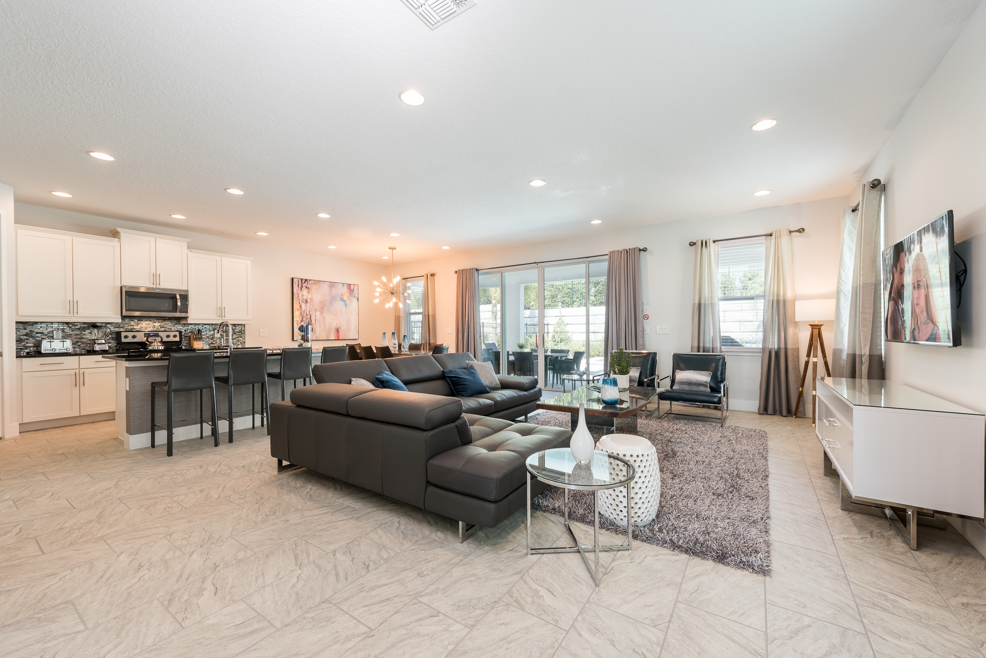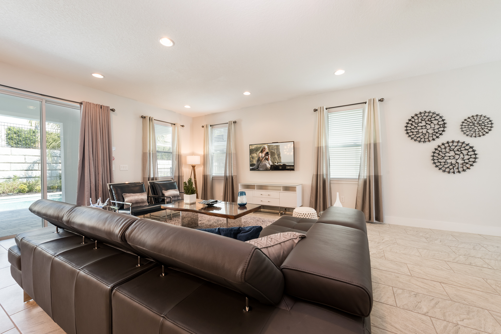 Spacious comfortable seating area with a leather sectional and 2x accent chairs overlooking the private pool deck through sliding glass doors