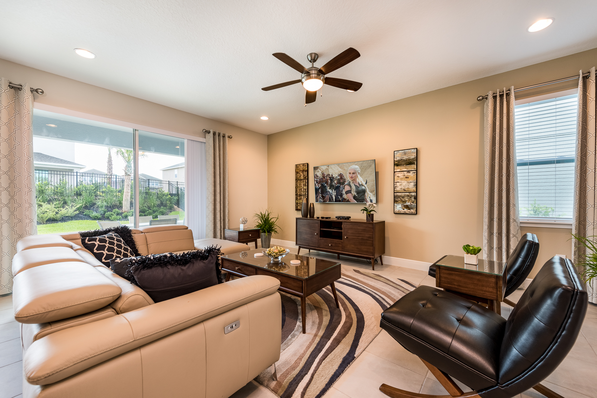 Spacious comfortable seating area with a leather sectional and 2x accent chairs overlooking the private pool deck through sliding glass doors