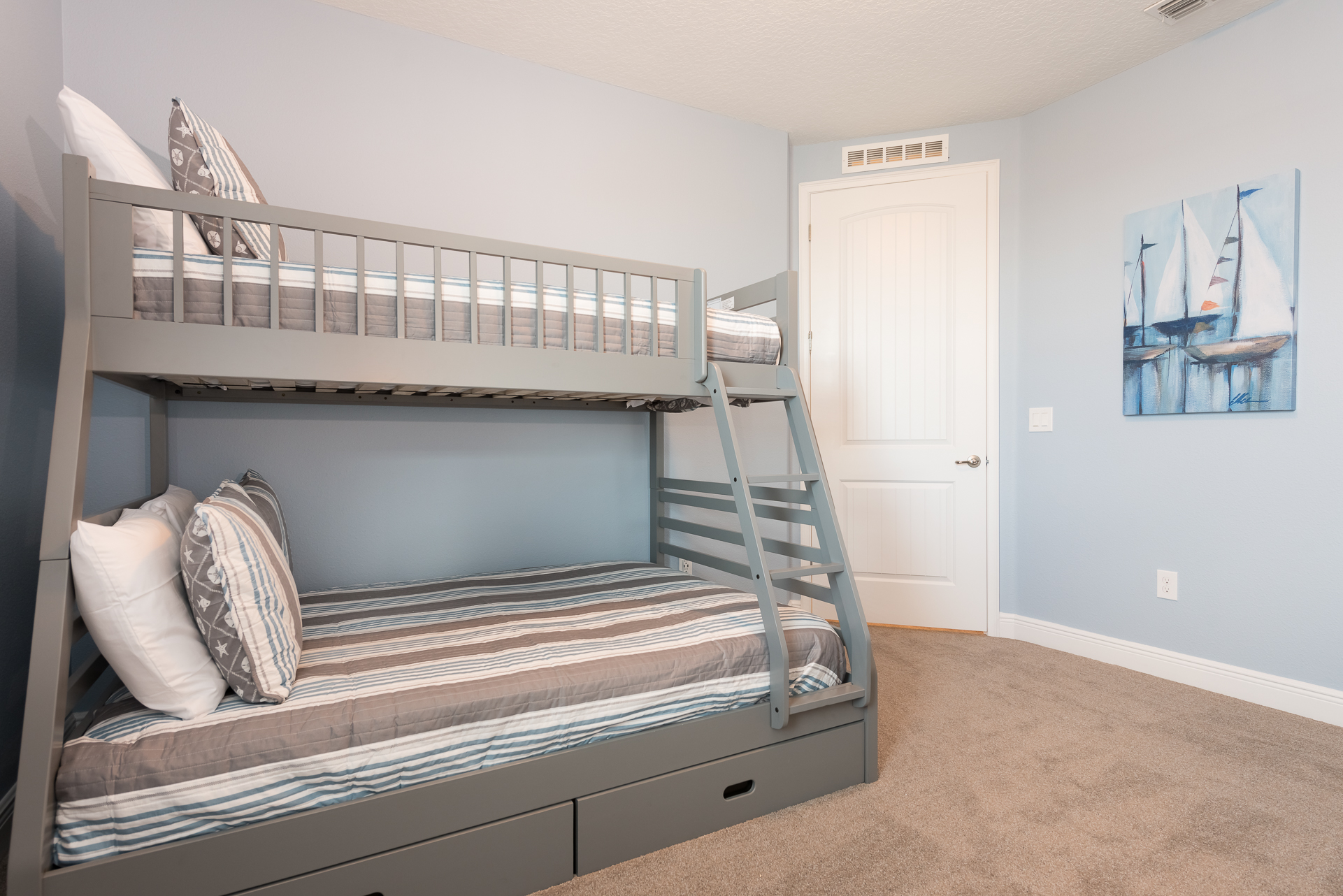 A bedroom with bunk beds (Twin/Full sized bed and an additional Twin sized bed underneath), en suite (shower)