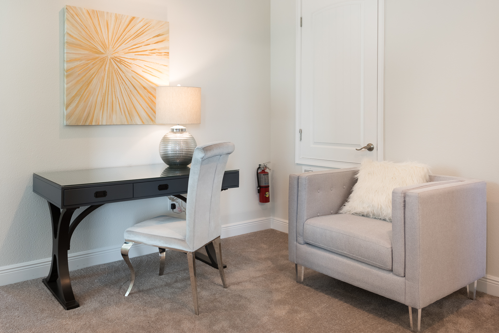 Upper floor loft area has a work station (desk with chair) and an accent chair