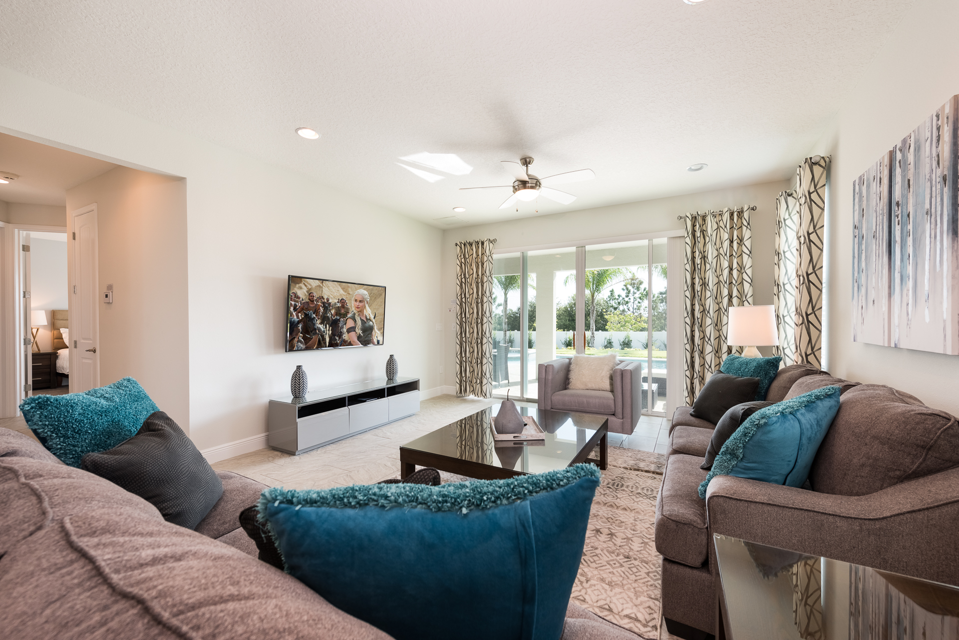 Spacious comfortable seating area with 2x sofas and an accent chair overlooking the private pool deck through sliding glass doors
