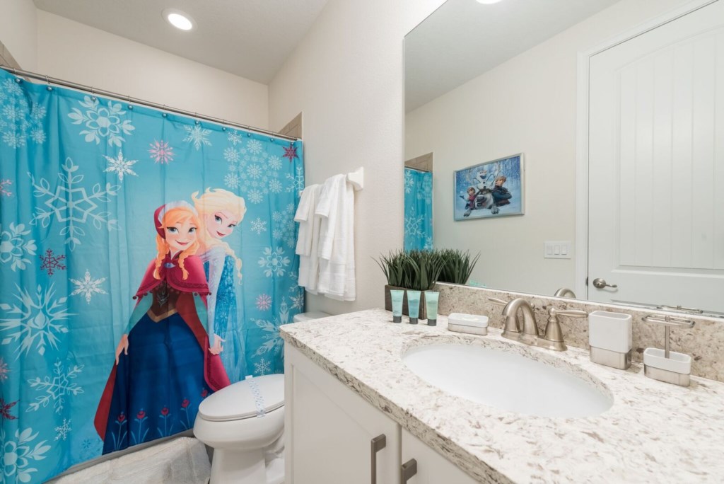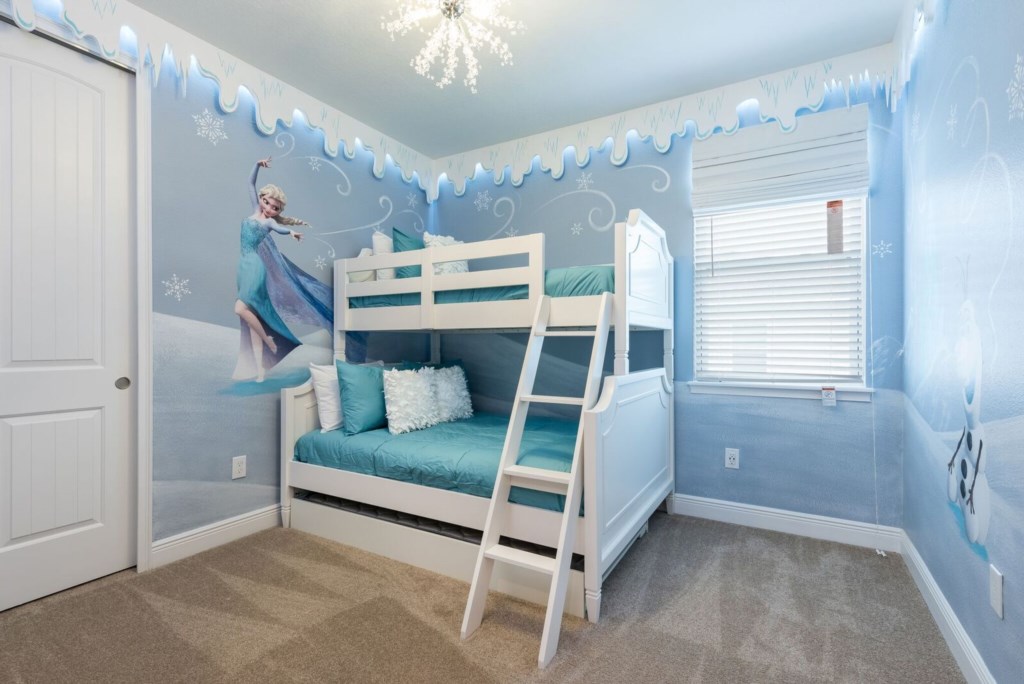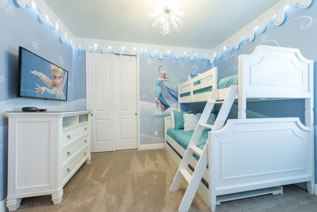 'Frozen' themed bedroom with bunk beds (Twin/Full sized beds, extra Twin sized bed underneath) and an en suite (shower/bath combo)