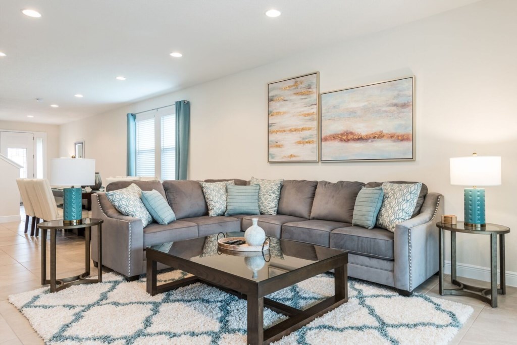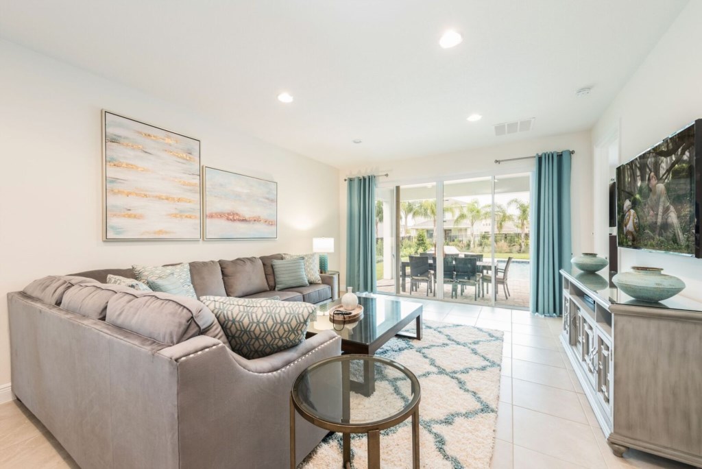 Spacious comfortable seating area with a large sectional overlooking the private pool deck through sliding glass doors