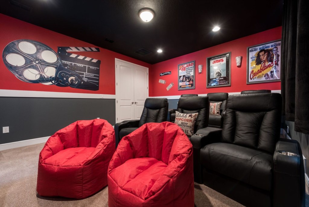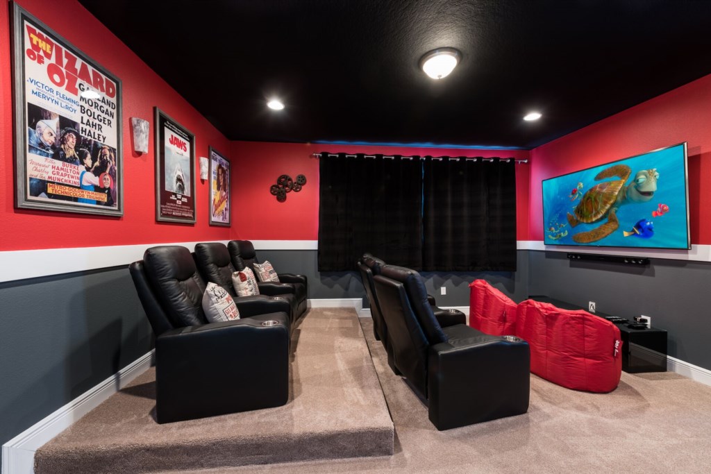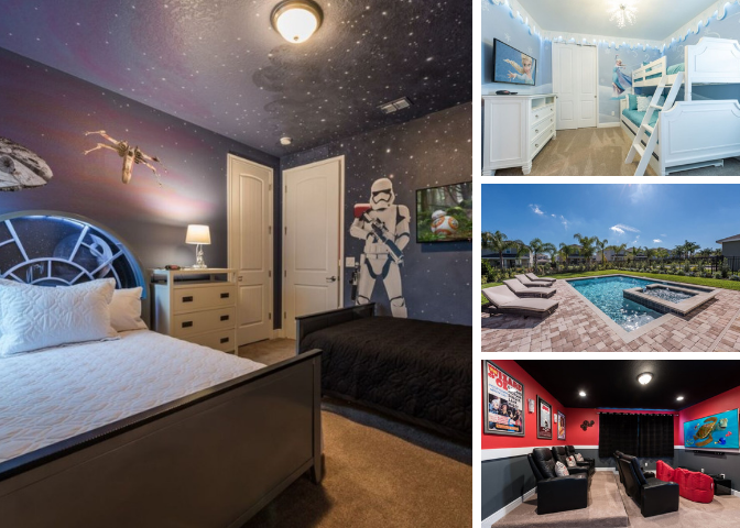 Sleeping up to 13 people, EC224 has bedrooms across both floors including 2 children's themed bedrooms such as 'Frozen' and 'Star Wars'! Your vacation home also has the added bonus of your very own private swimming pool and spa right outside your patio doors! The home theater is also the perfect place to gather the family and watch your favorite movies on a large flat screen TV with 6 leather recliners!