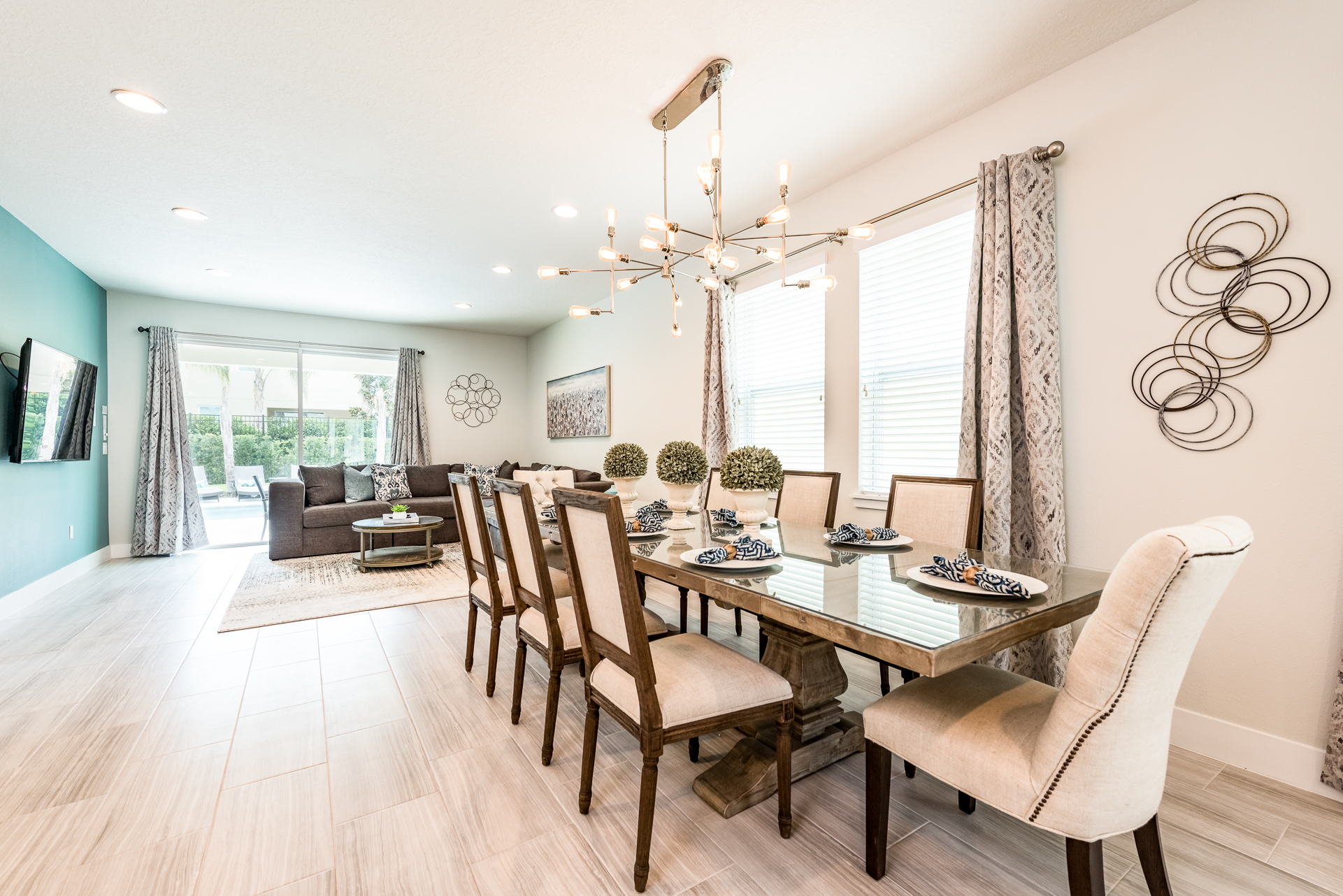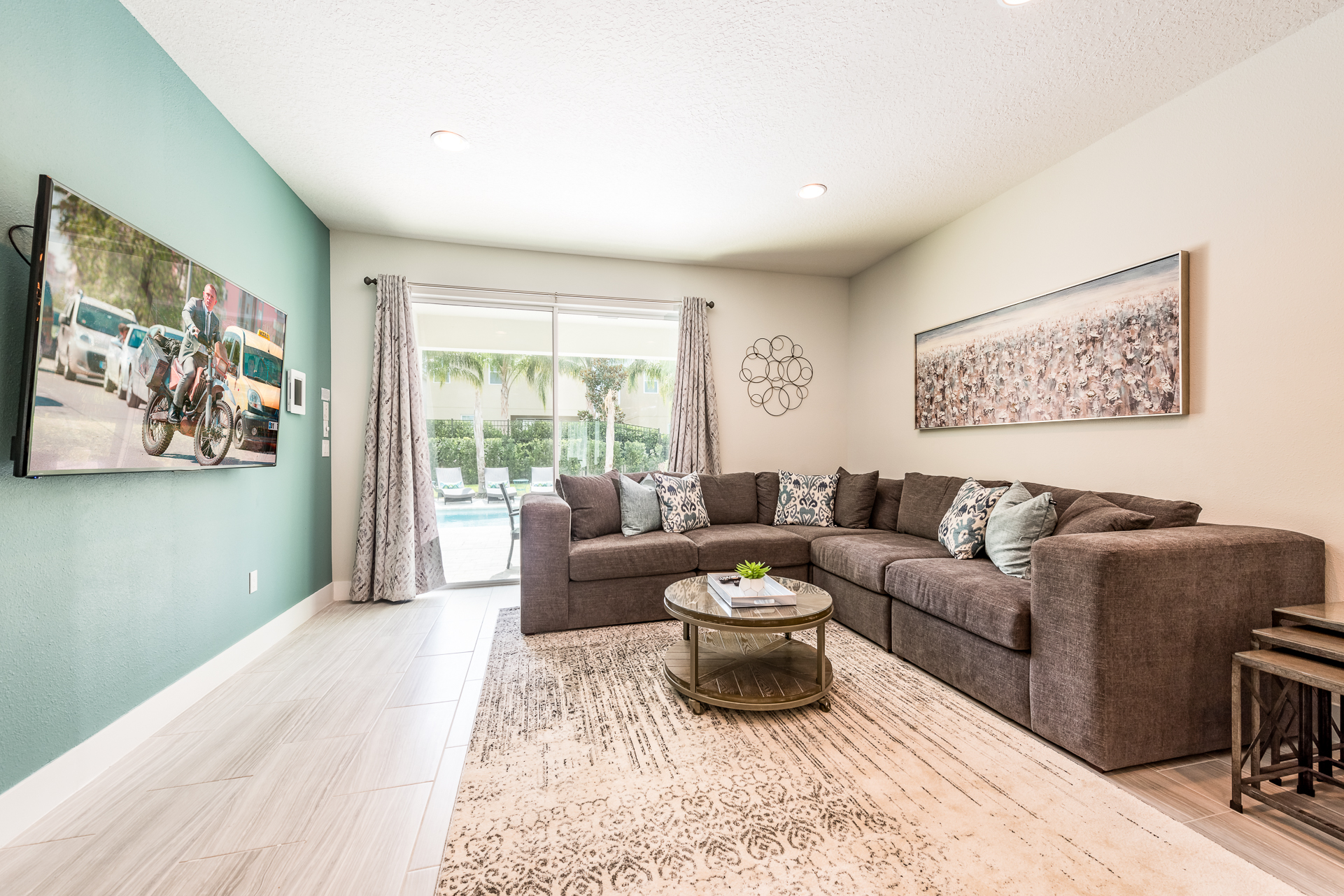 Spacious comfortable seating area with a large sectional overlooking the private pool deck through sliding glass doors