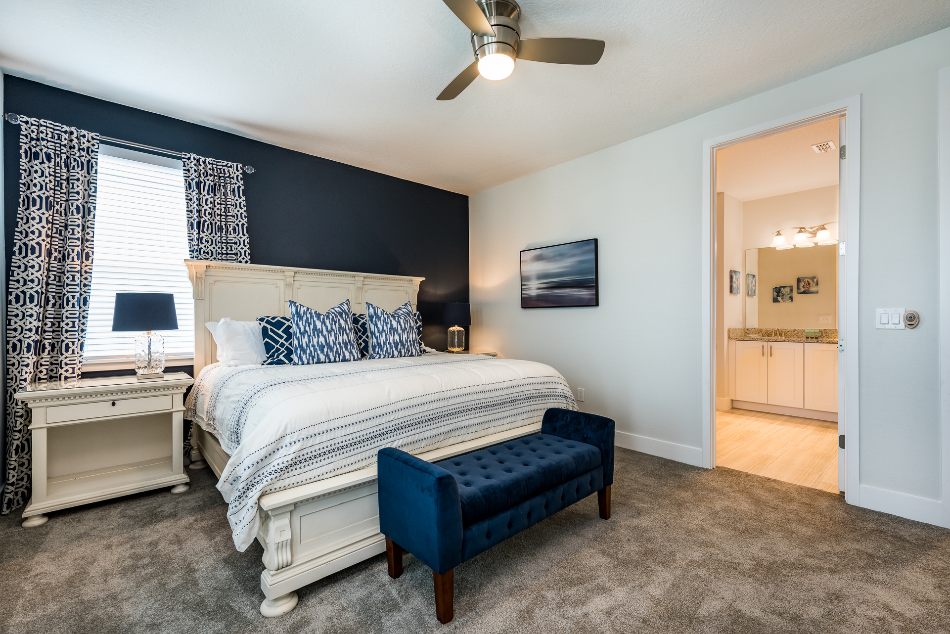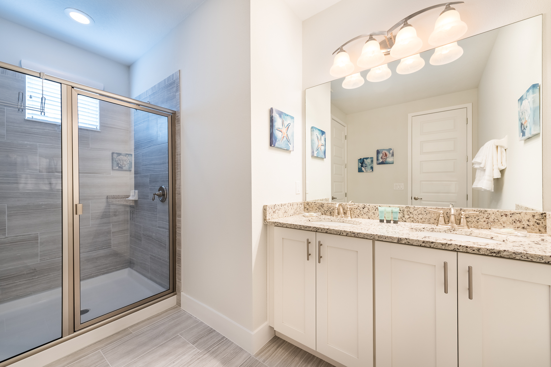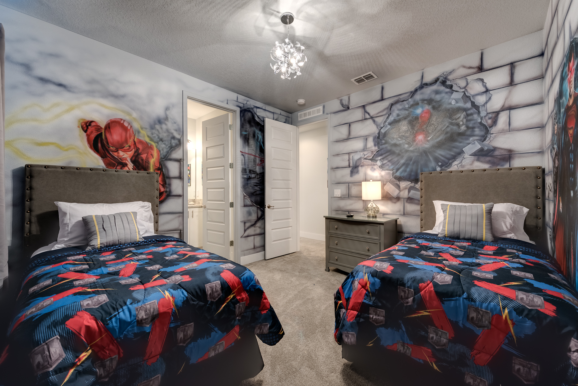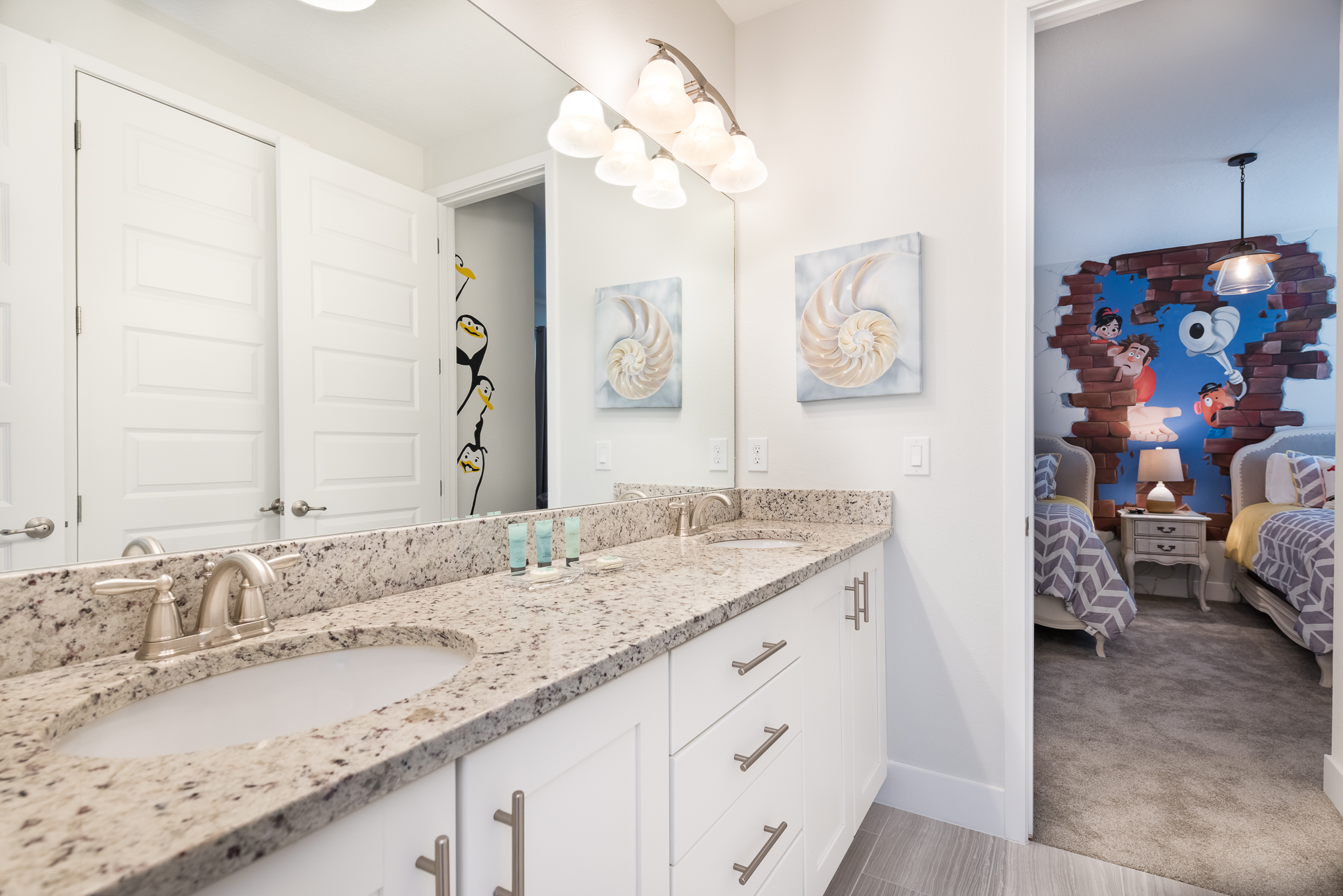 Themed bedroom with 2x Twin sized beds and an en suite (Jack/Jill style- shower, twin vanities) connecting to a Queen sized bedroom with a private balcony