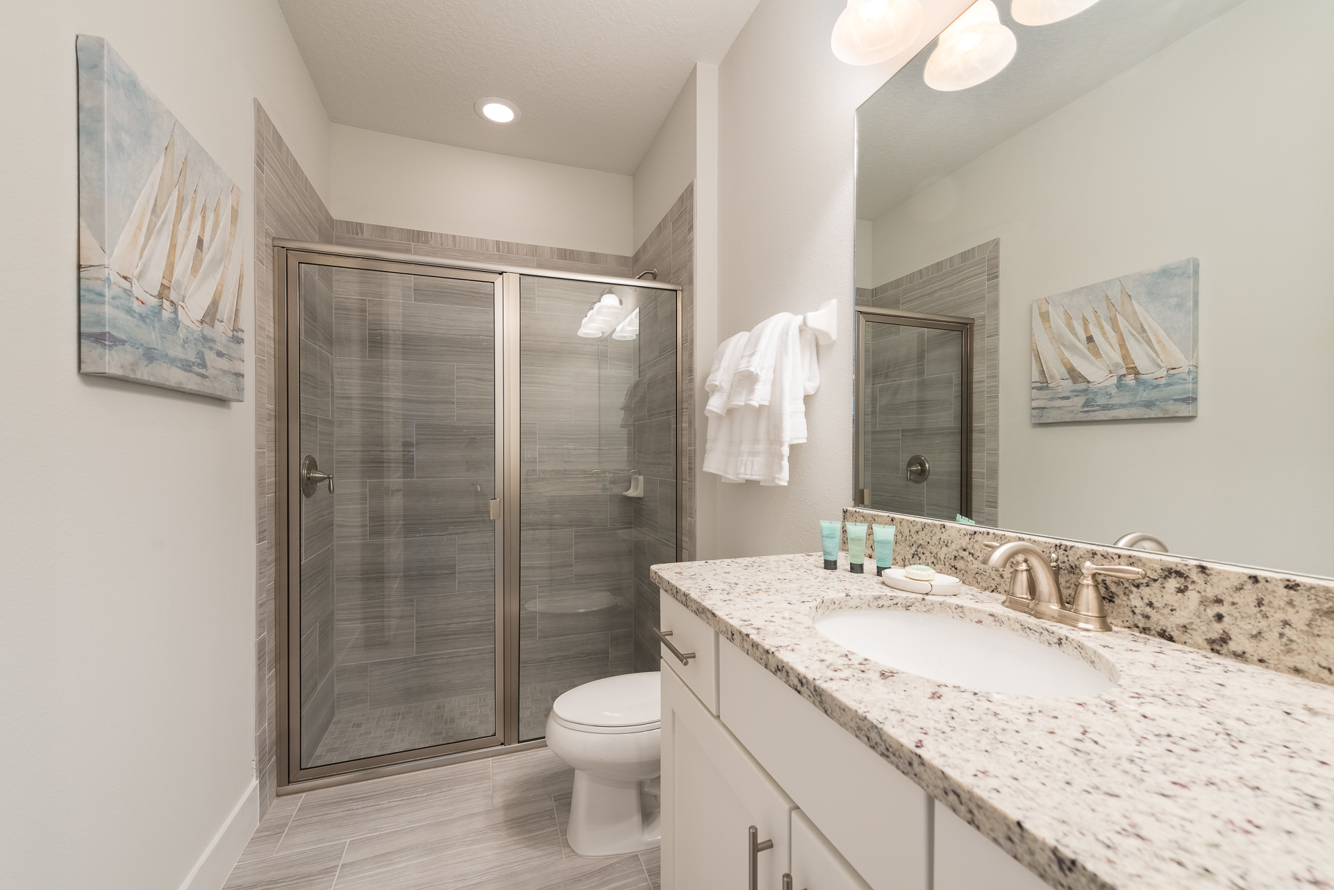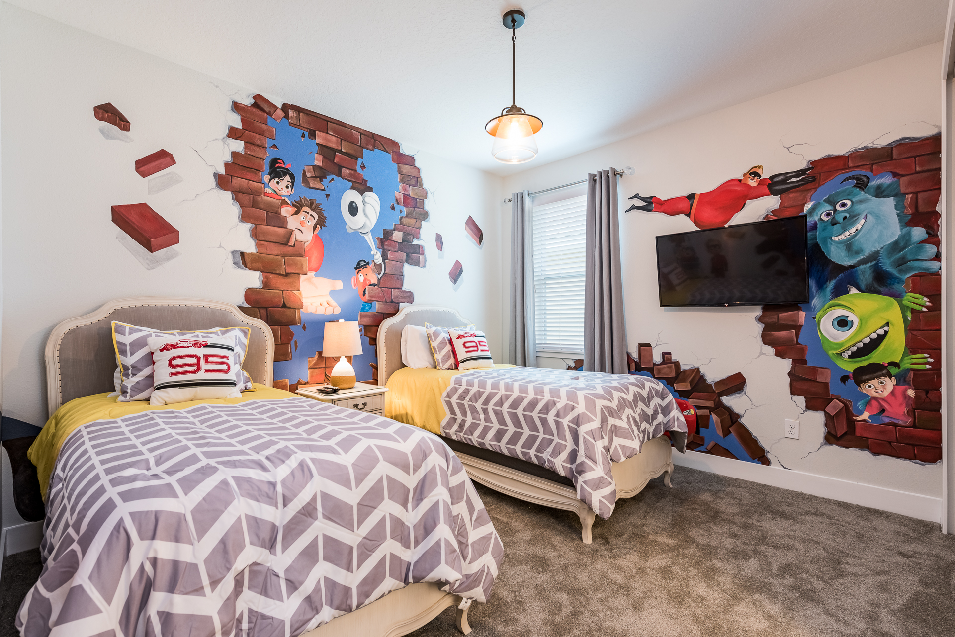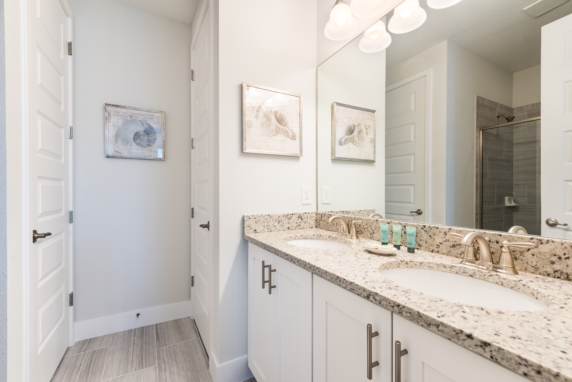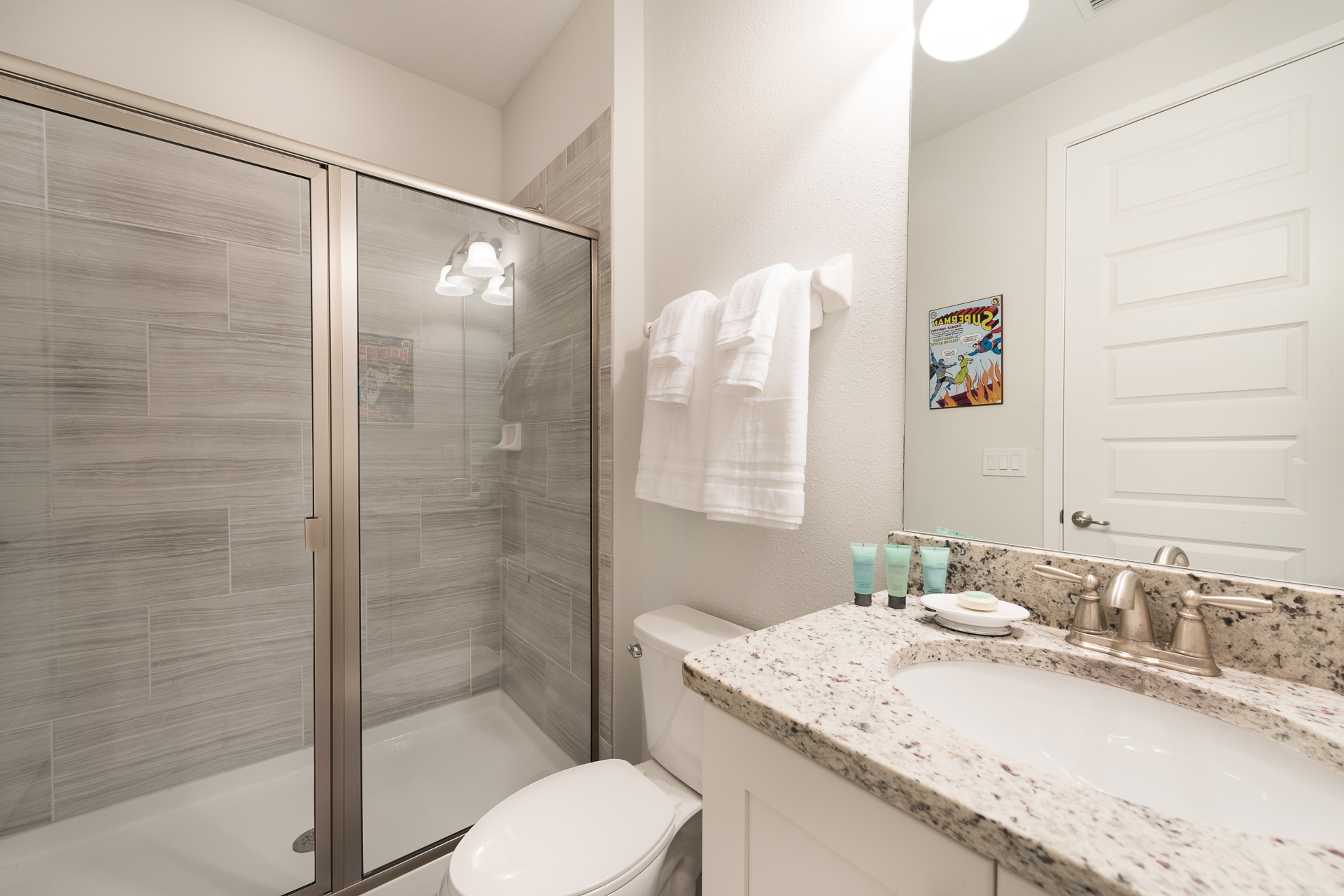 Themed bedroom with 2x Twin sized beds and an en suite (Jack/Jill style- shower, twin vanities) connecting to a Queen sized bedroom with a private balcony