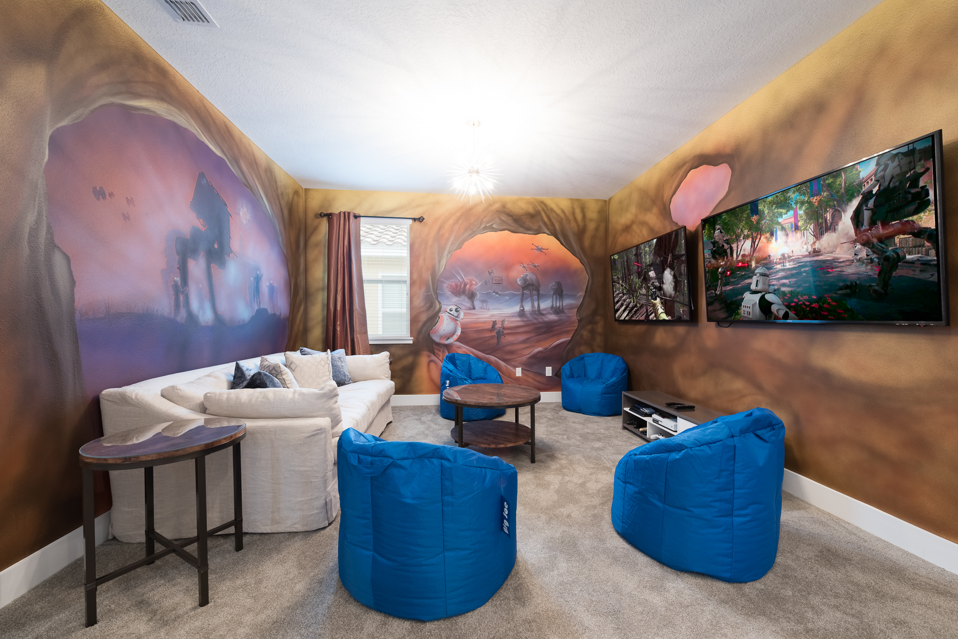 Themed upper floor loft area has a comfortable sofa, 2x large flat screen TVs with X-Box One and Sony Playstation video game consoles, 4x bean bag chairs