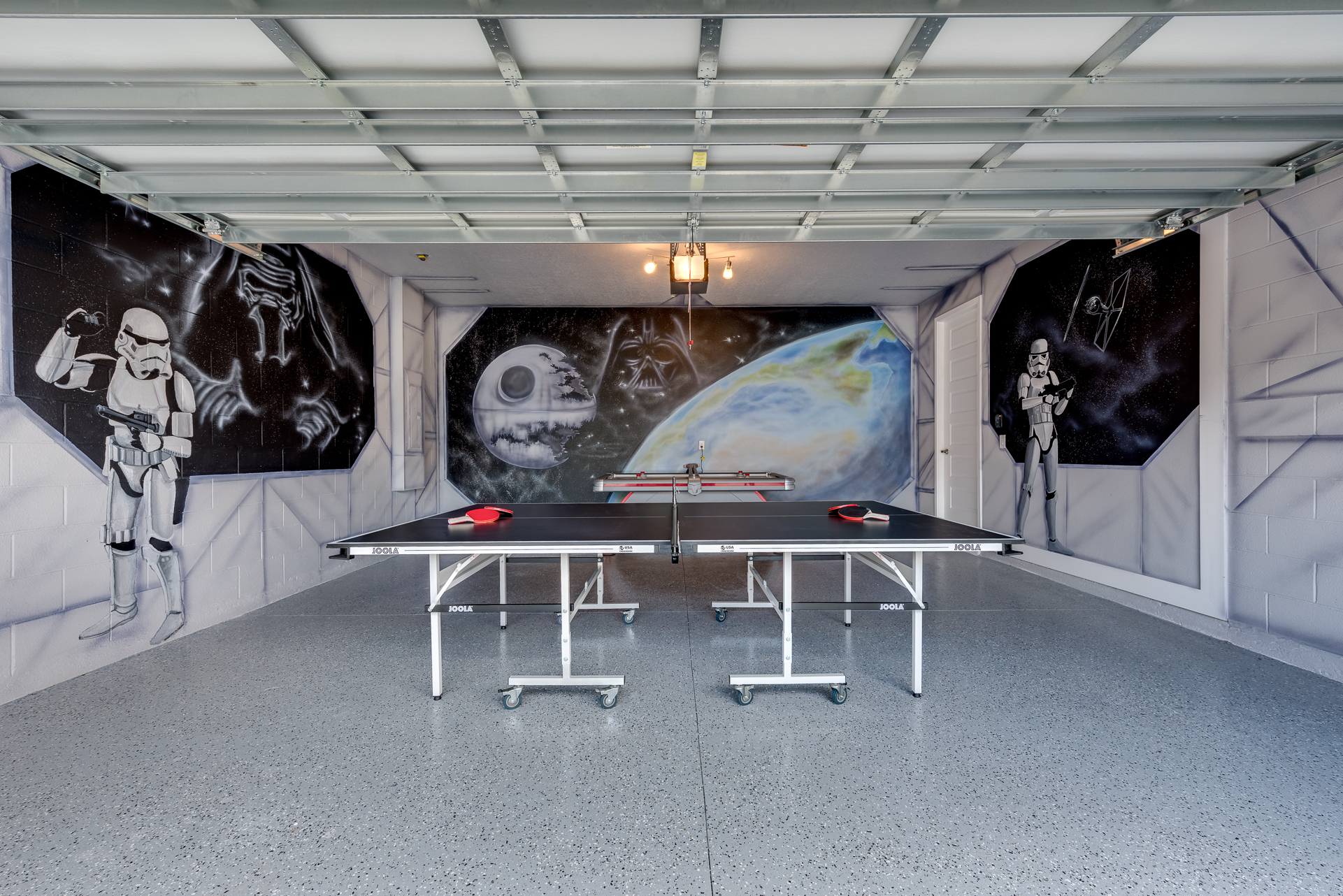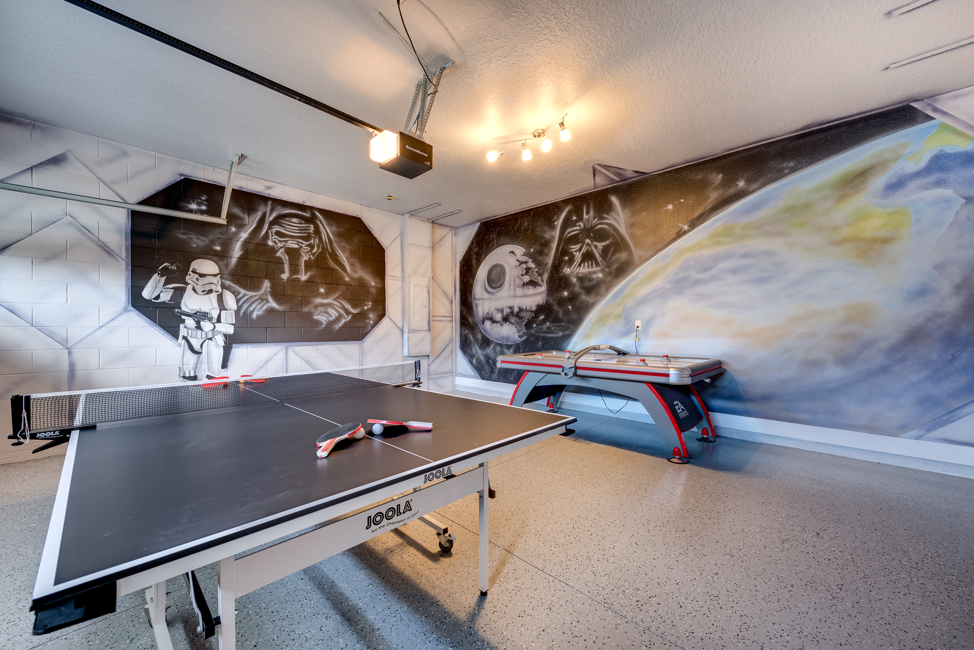 Themed games room has a ping pong and air hockey table