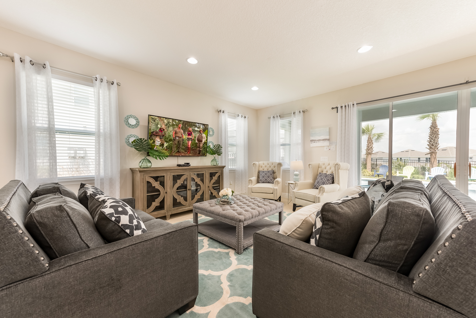 Spacious comfortable seating area with a sofa, love seat, and 2x accent chairs overlooking the private pool deck through sliding glass doors