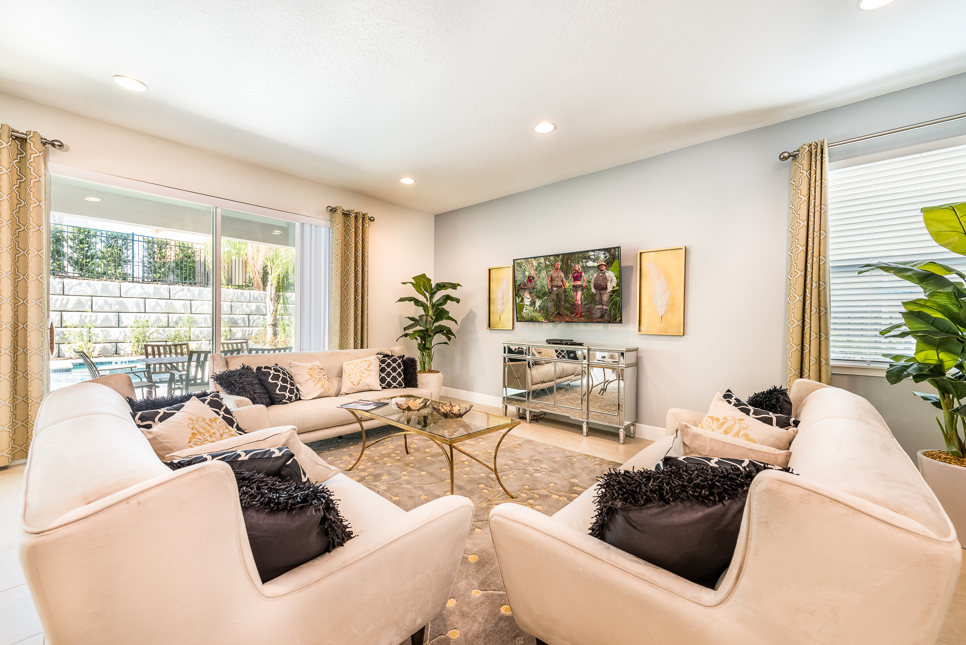 Spacious comfortable seating area with 3x sofas overlooking the private pool deck through sliding glass doors