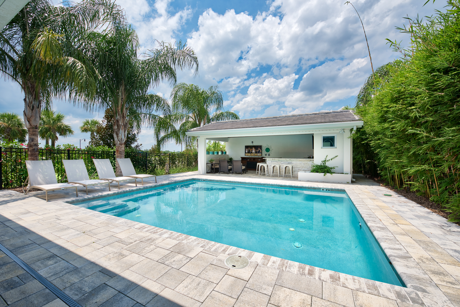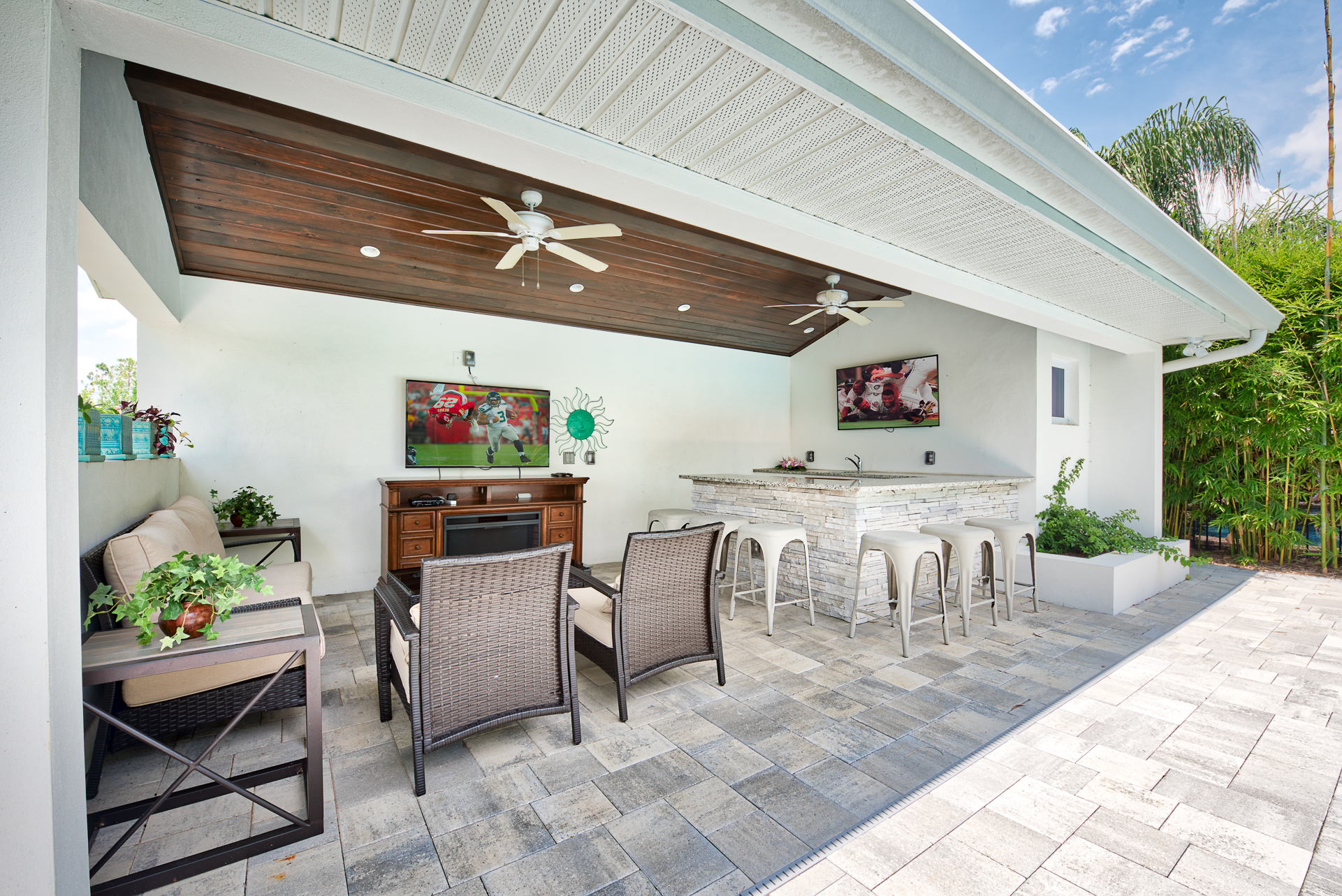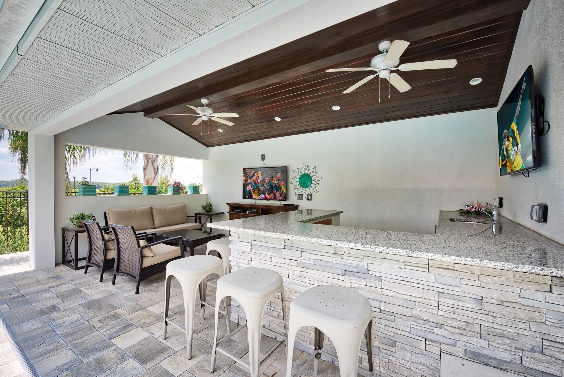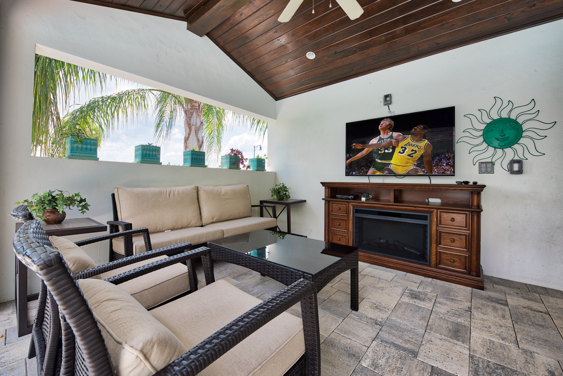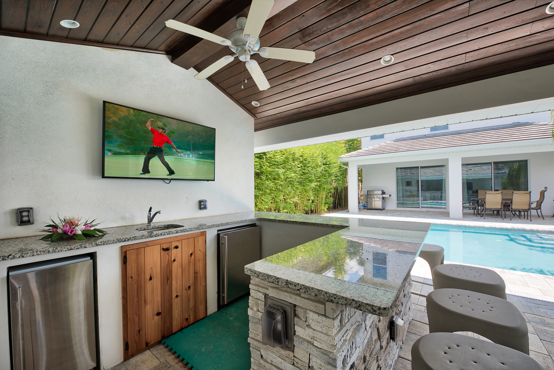 Outdoor cabana has 6x seat bar, 2x flat screen TVs, outdoor sofa and 2x patio chairs, feature fireplace, ice maker, fridge, and sink