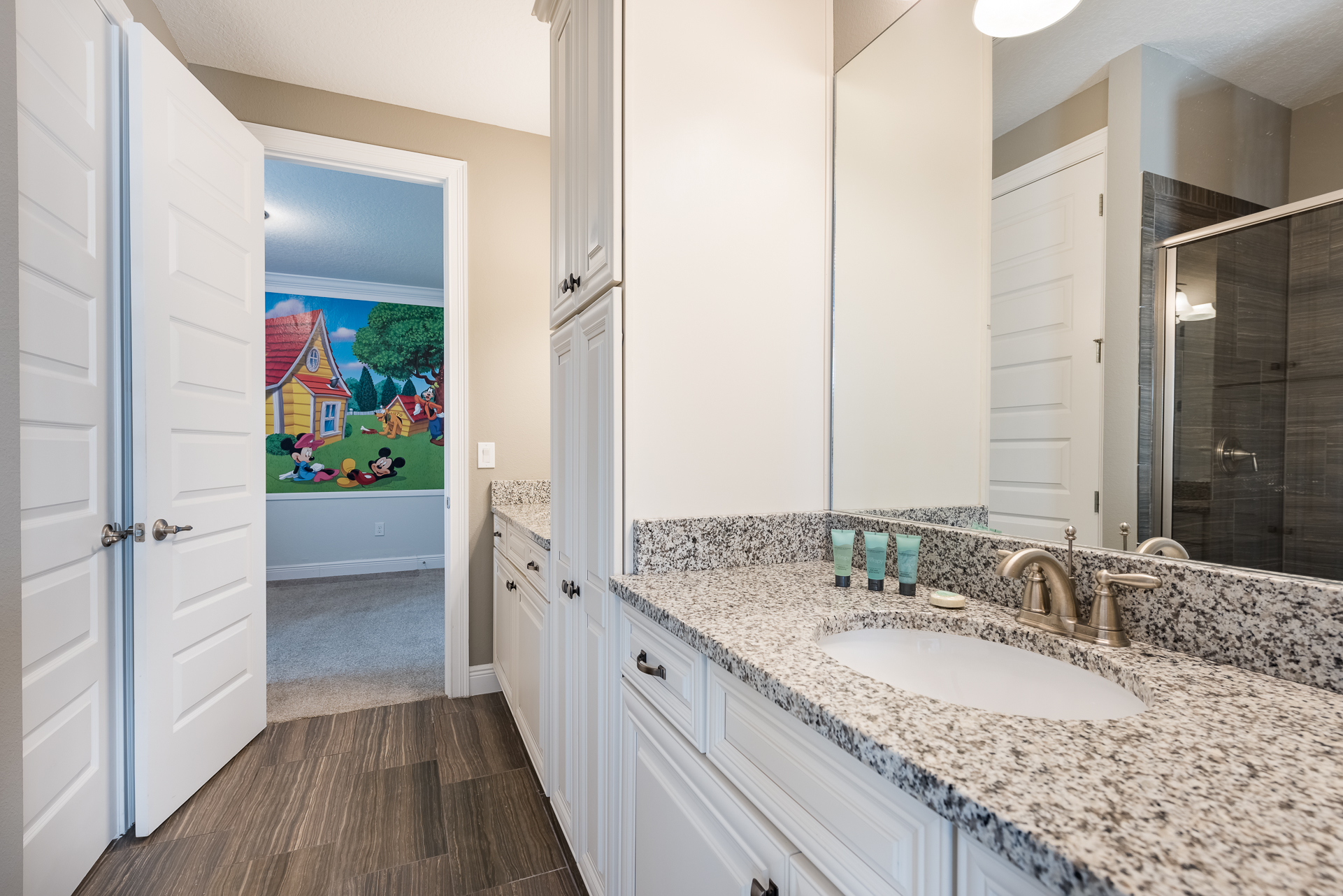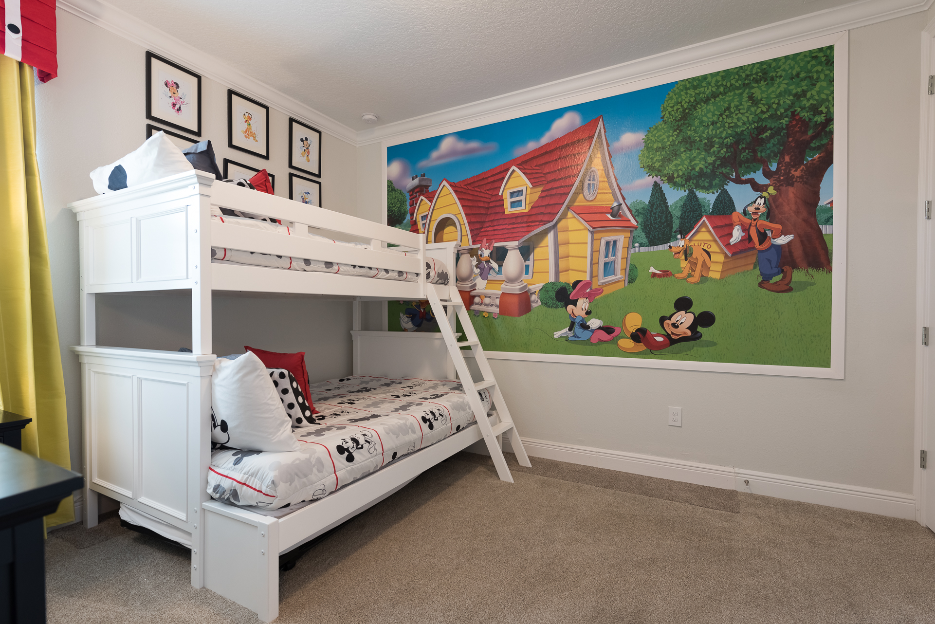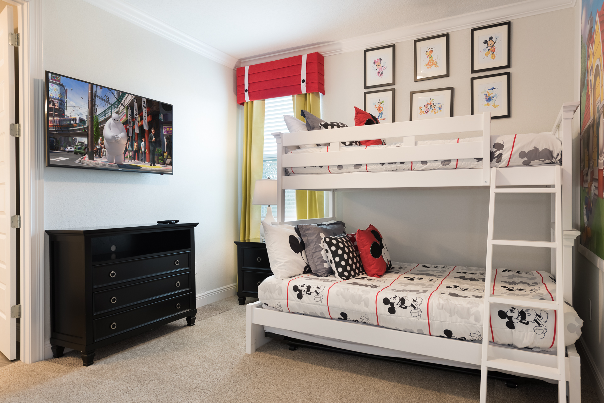 Themed bedroom with 2x Twin sized beds and an en suite (Jack/Jill style-shower, twin vanities) connecting to a themed bedroom with bunkbeds (Twin and Full sized bed, trundle bed underneath), this specific room is interconnected with the Master which has a locking facility on the master side, perfect for families with young children!