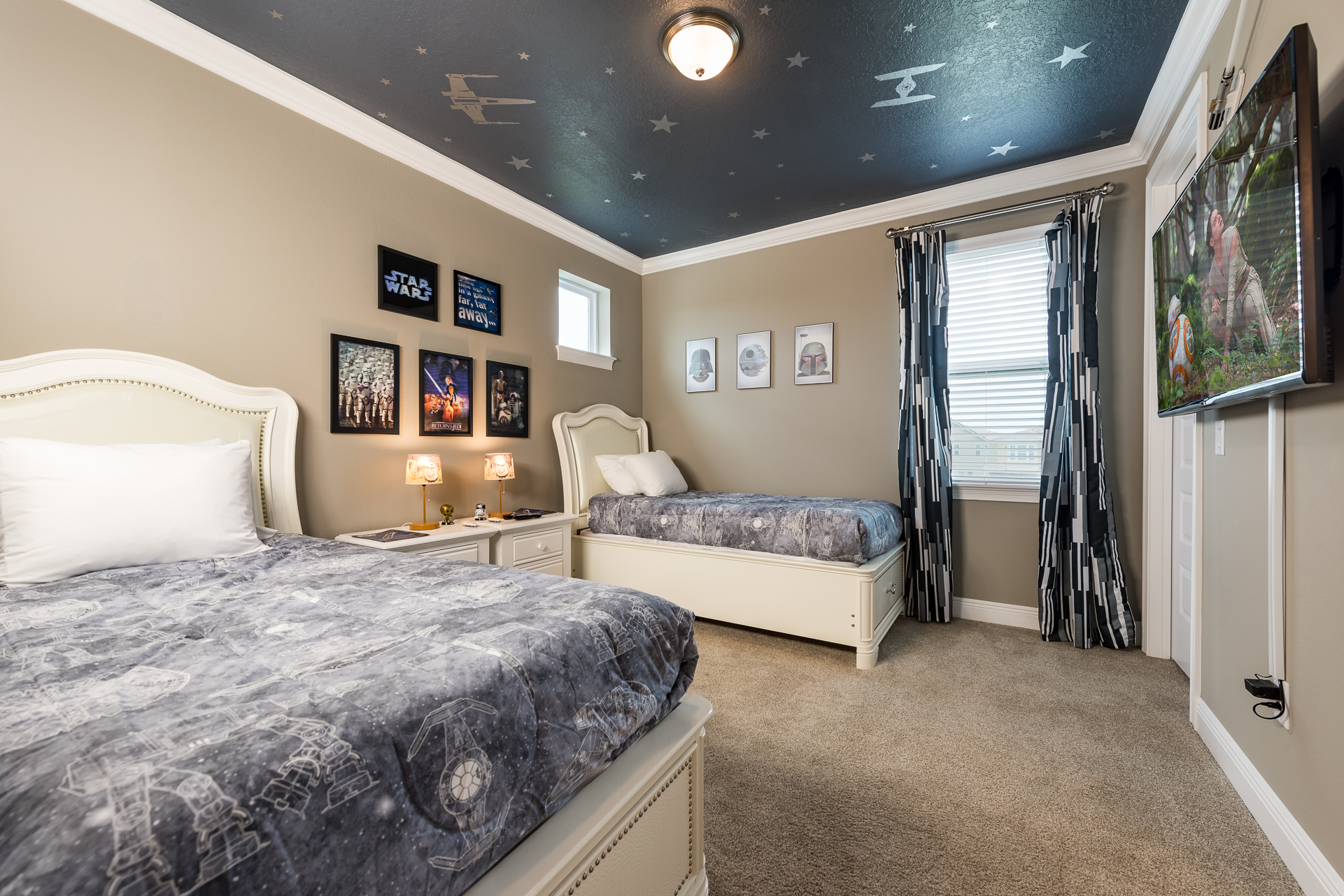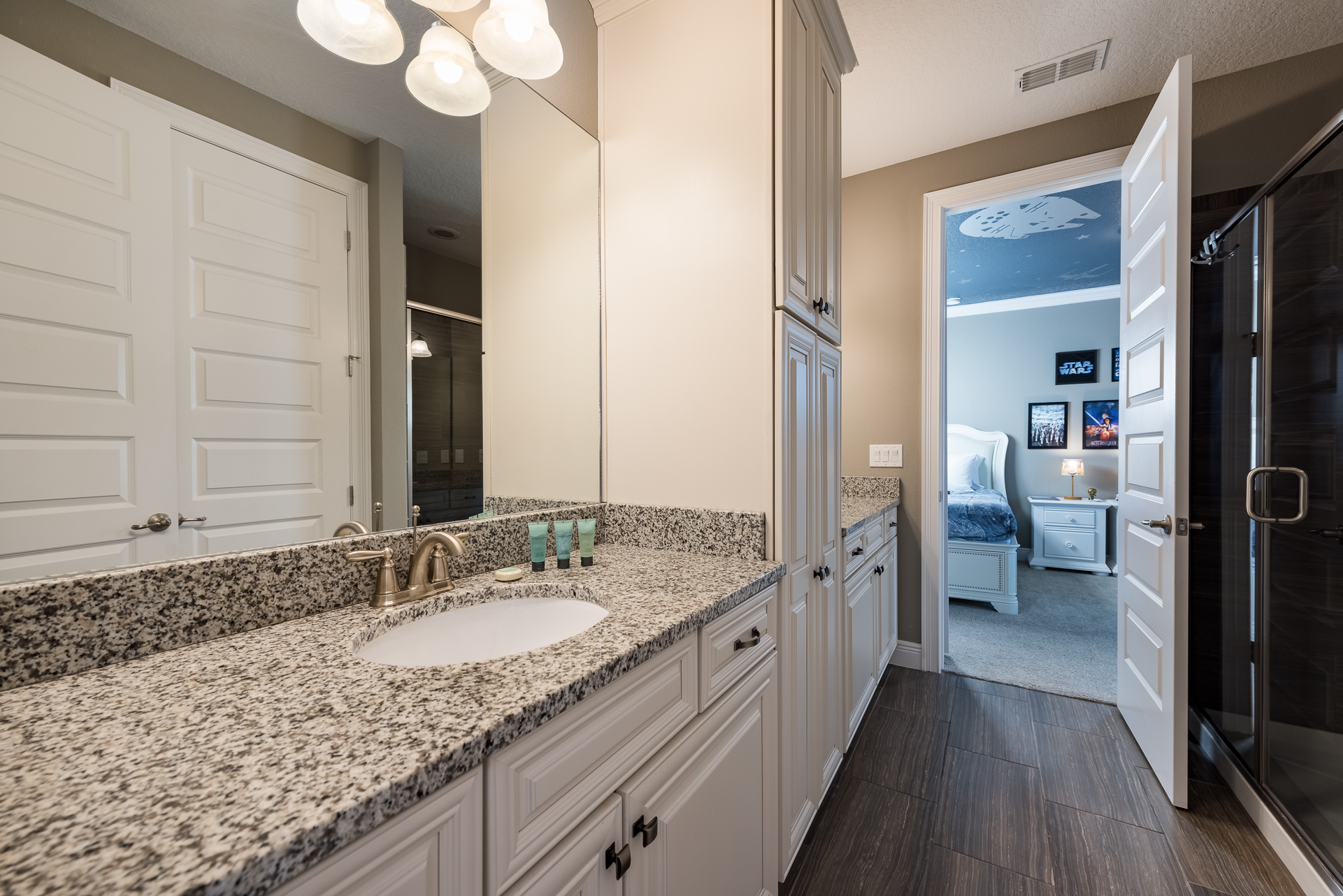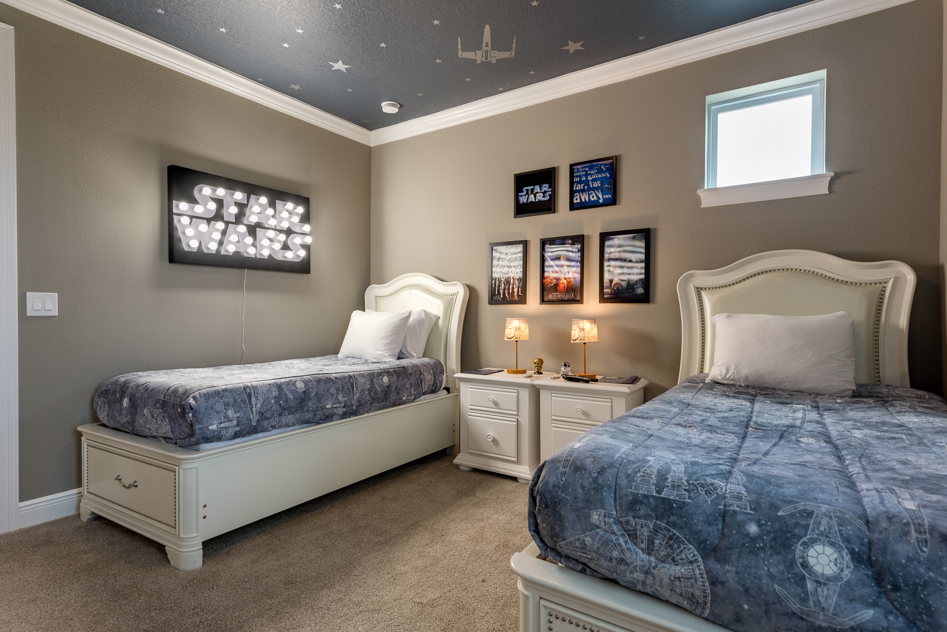 Themed bedroom with 2x Twin sized beds and an en suite (Jack/Jill style-shower, twin vanities) connecting to a themed bedroom with bunkbeds (Twin and Full sized bed, trundle bed underneath), this specific room is interconnected with the Master which has a locking facility on the master side, perfect for families with young children!