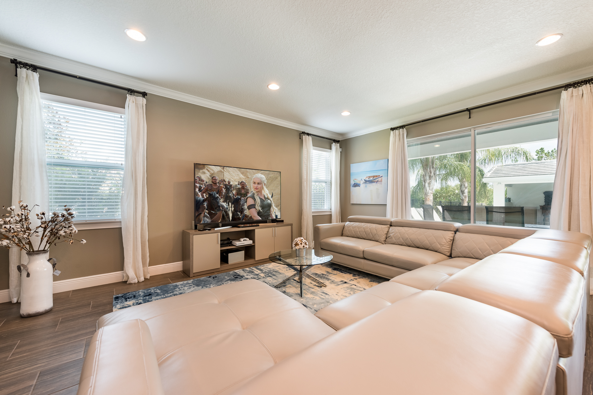 Spacious comfortable seating area with a large leather sectional overlooking the private pool deck through sliding glass doors