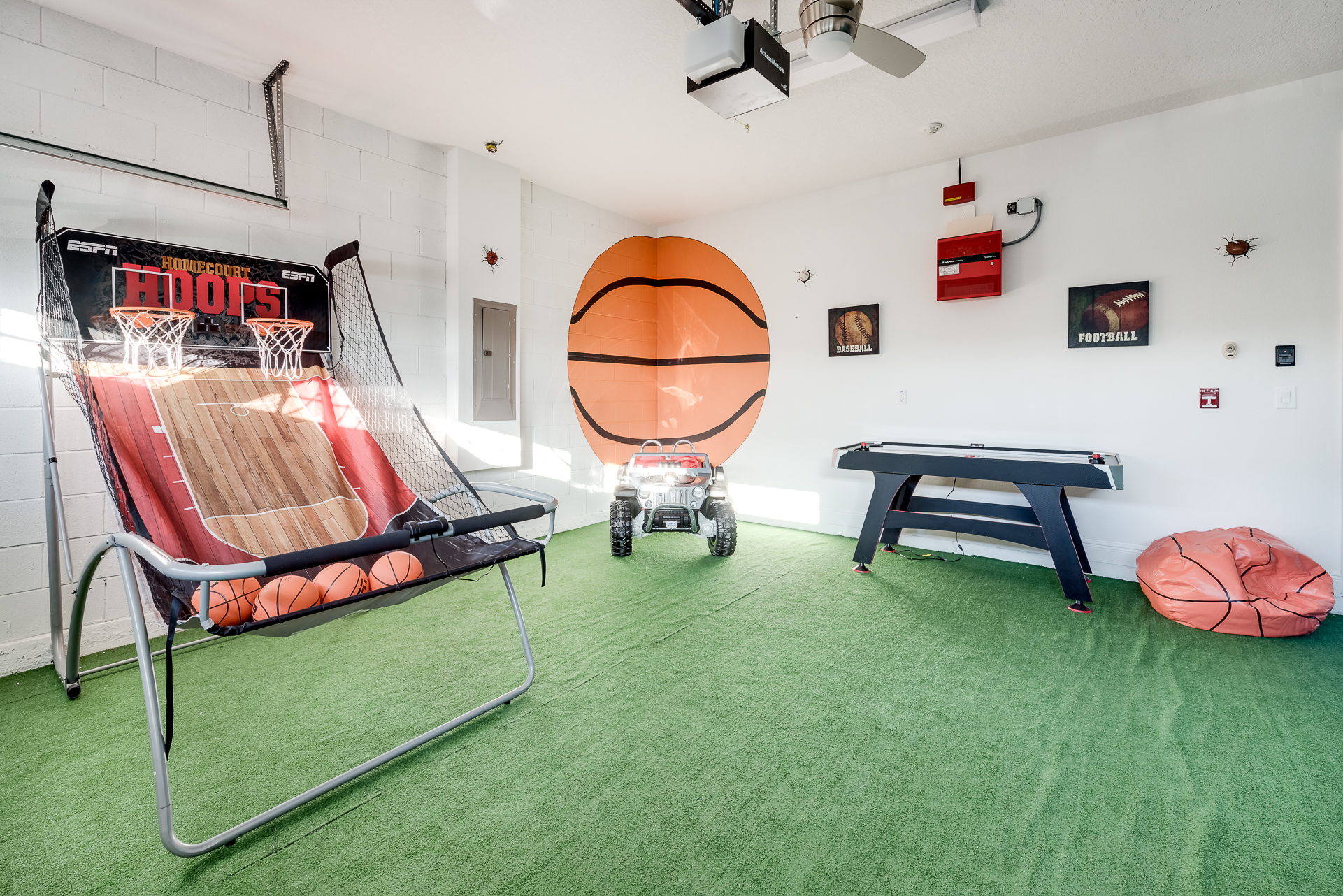 Games room has a foosball and air hockey table, basketball shooting game, 2x bean bag chairs