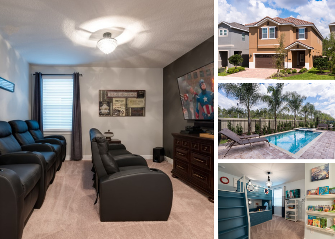 Your family will adore this beautifully presented vacation home, complete with private pool and spa, with a magnificent 7 seat home theater and Disney themed bunk room!