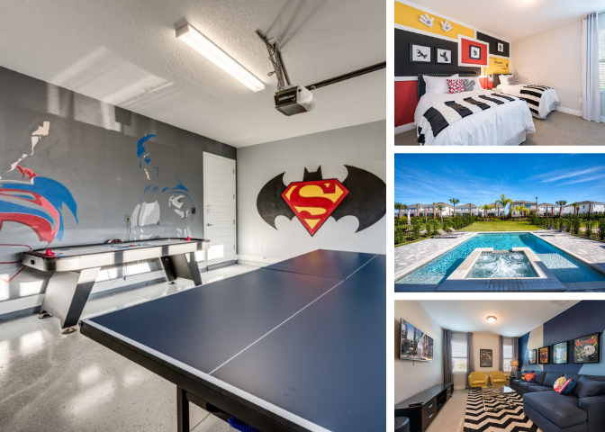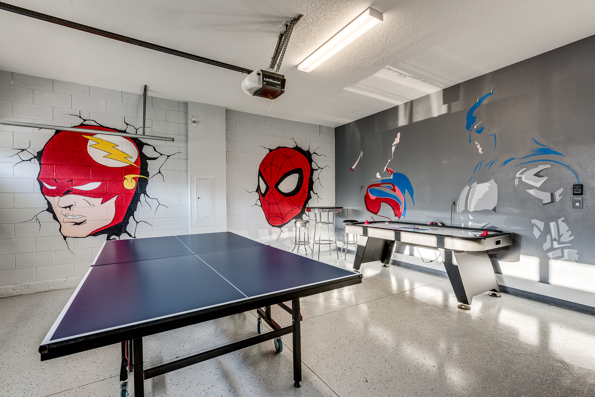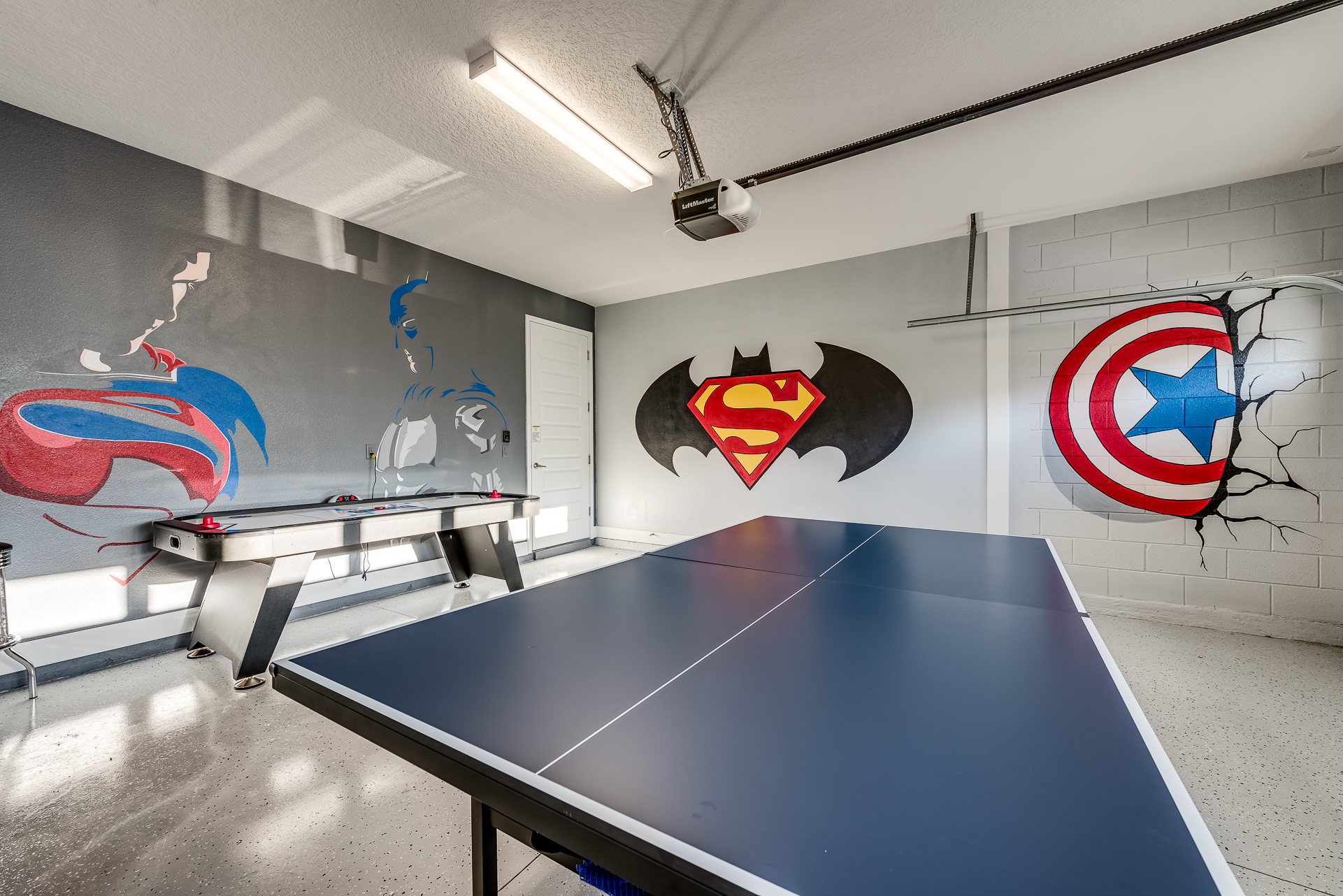 Superhero themed games room has a 2 seat high top table, ping pong and air hockey table