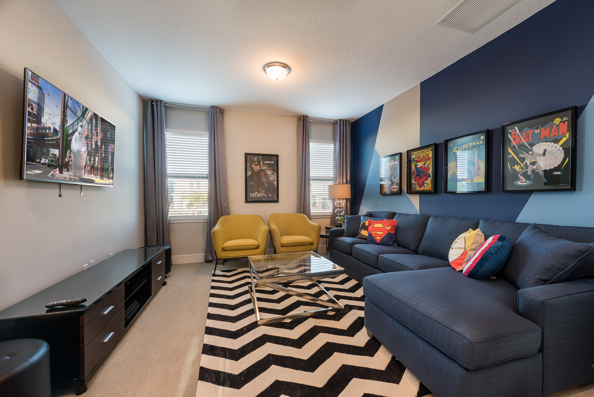 Upper floor loft area has a large flat screen TV with a PS4 video game console, comfortable sectional, 2x accent chairs