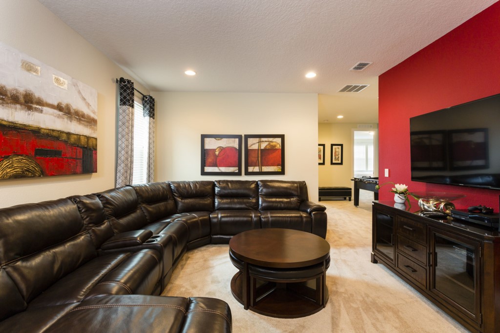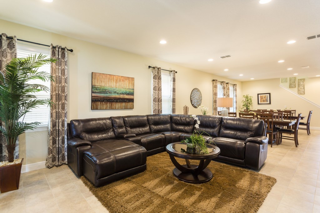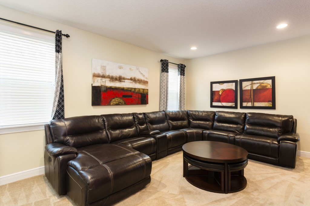 Spacious comfortable seating area with a large leather reclining sectional overlooking the pool deck