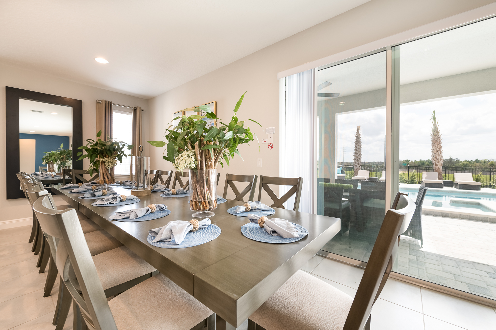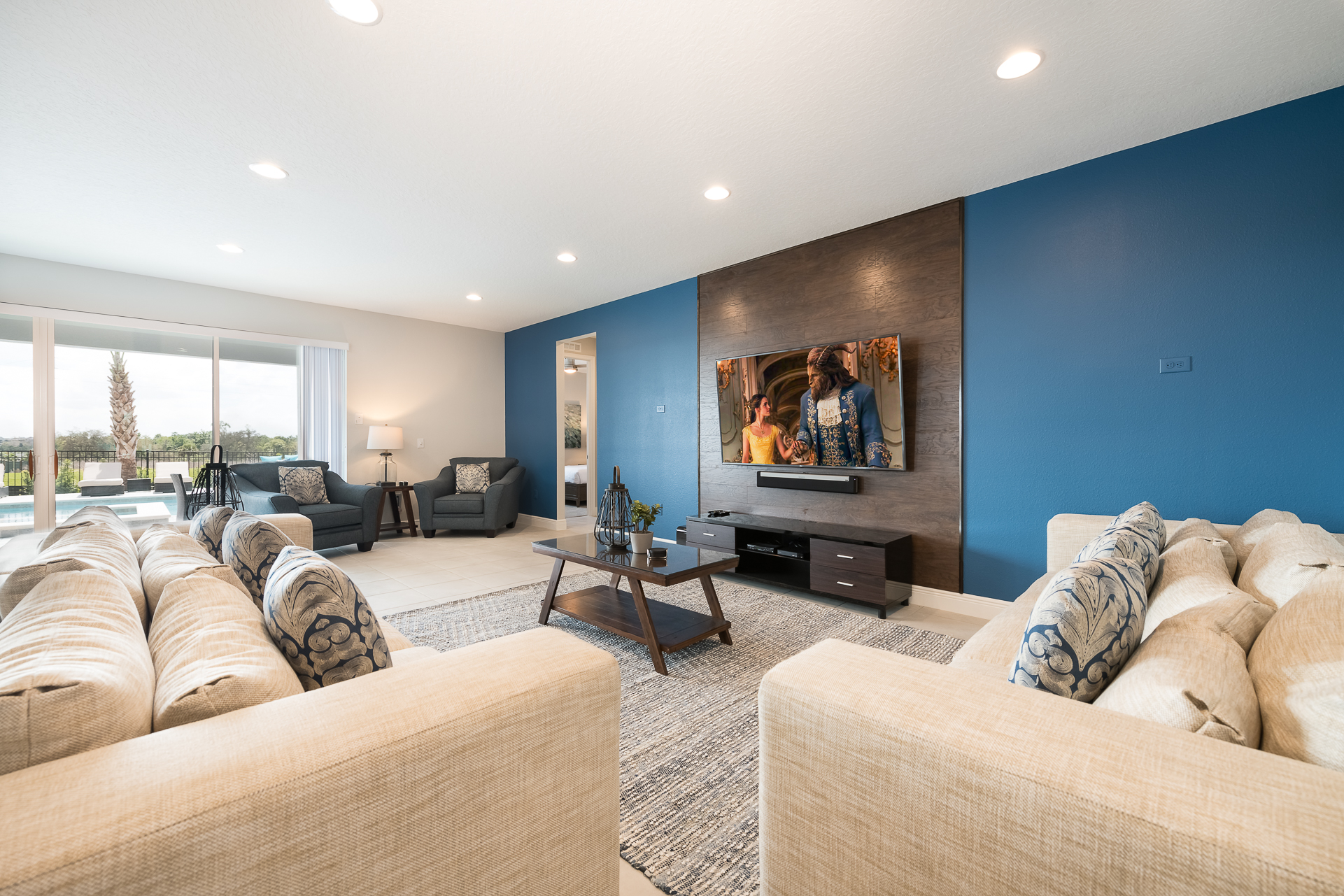 Spacious comfortable seating area with 2x sofas and 2x accent chairs overlooking the private pool deck through sliding glass doors