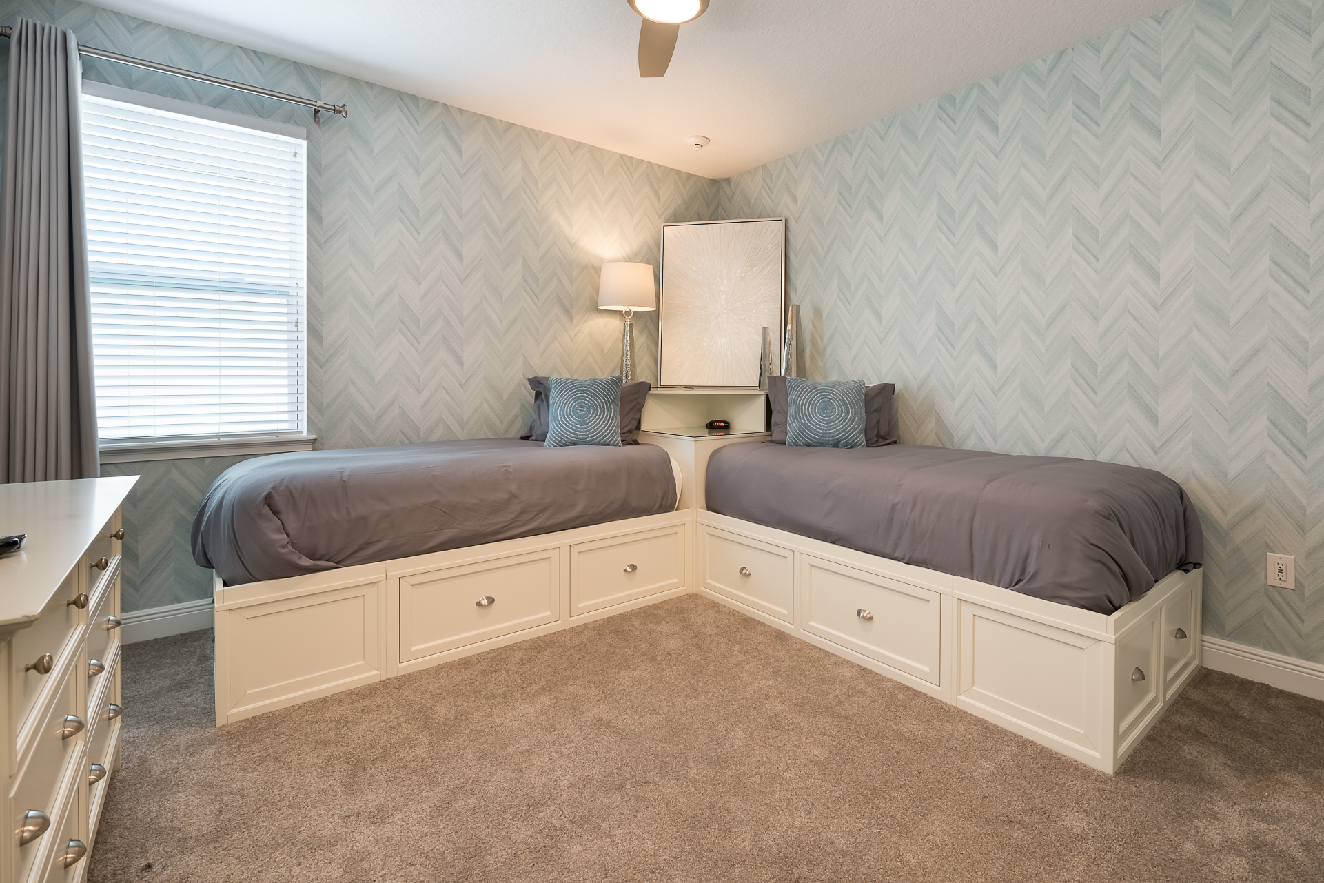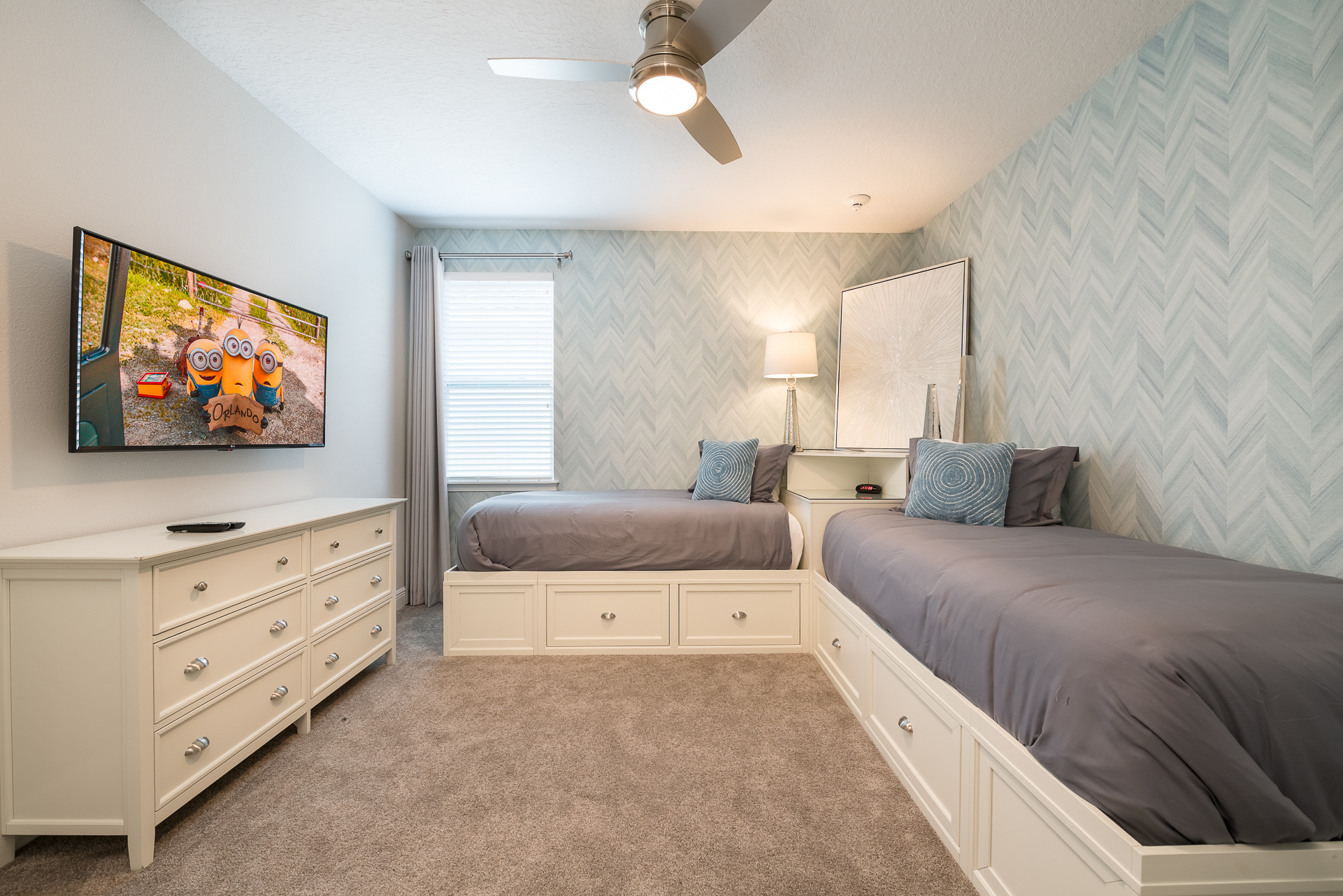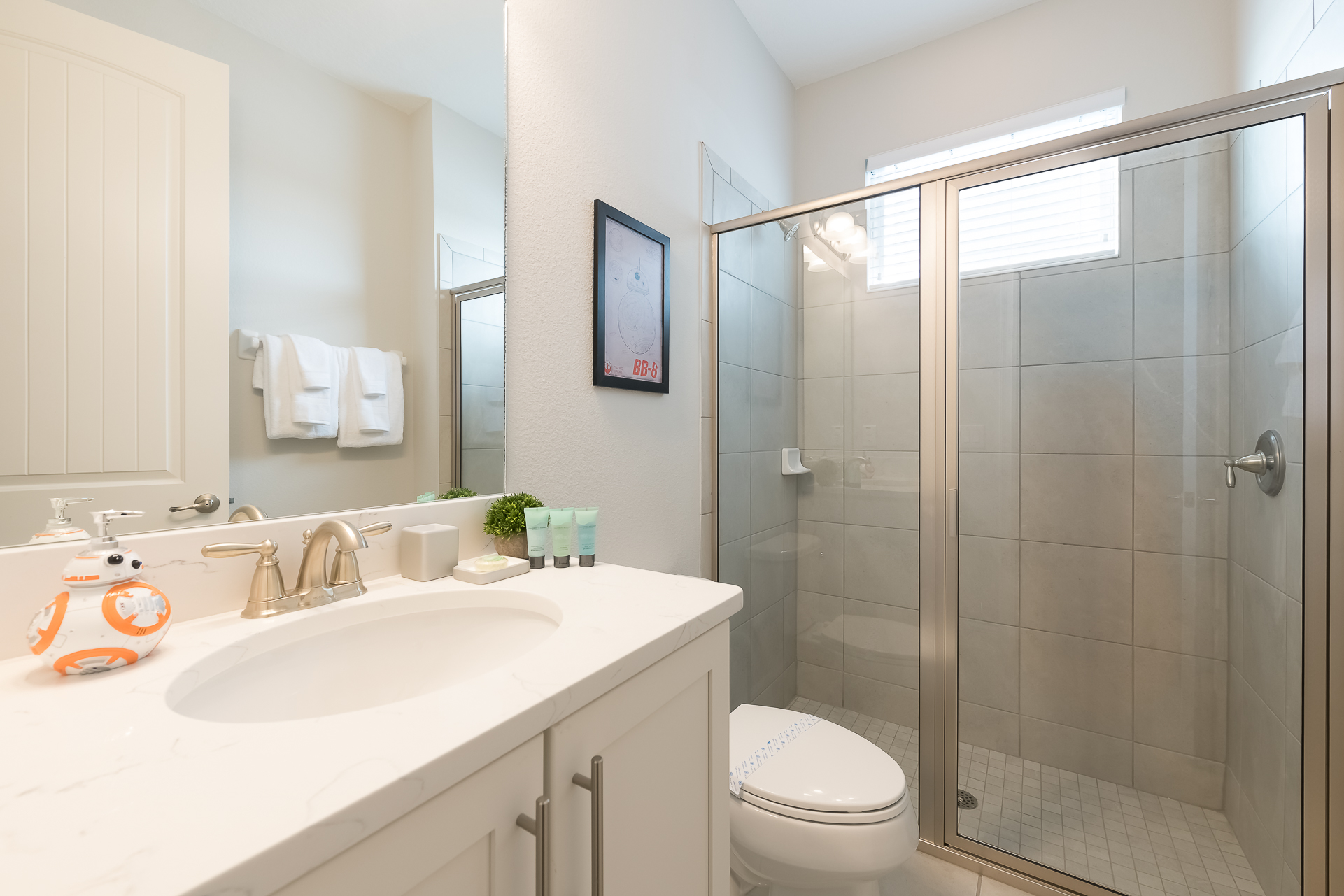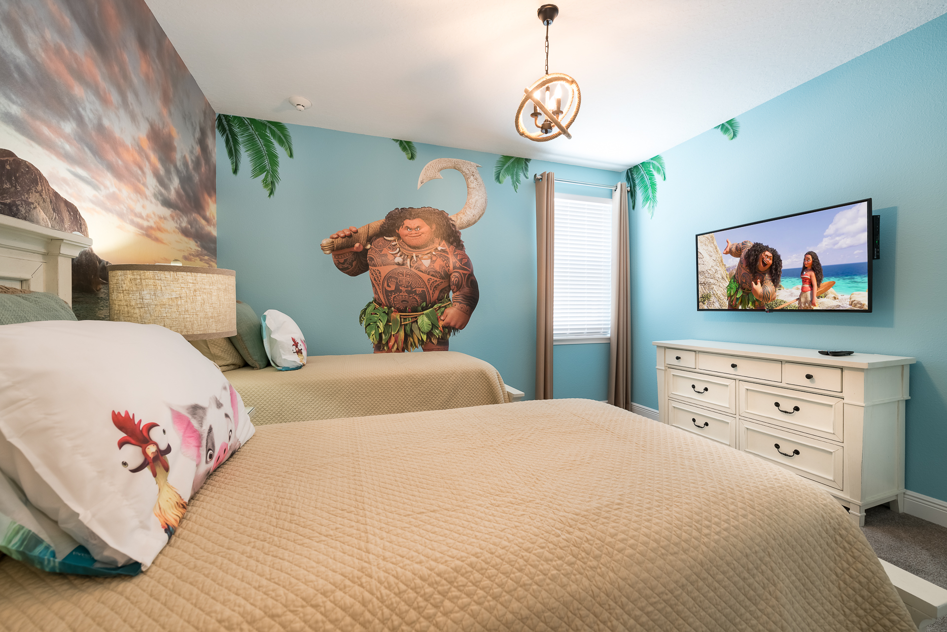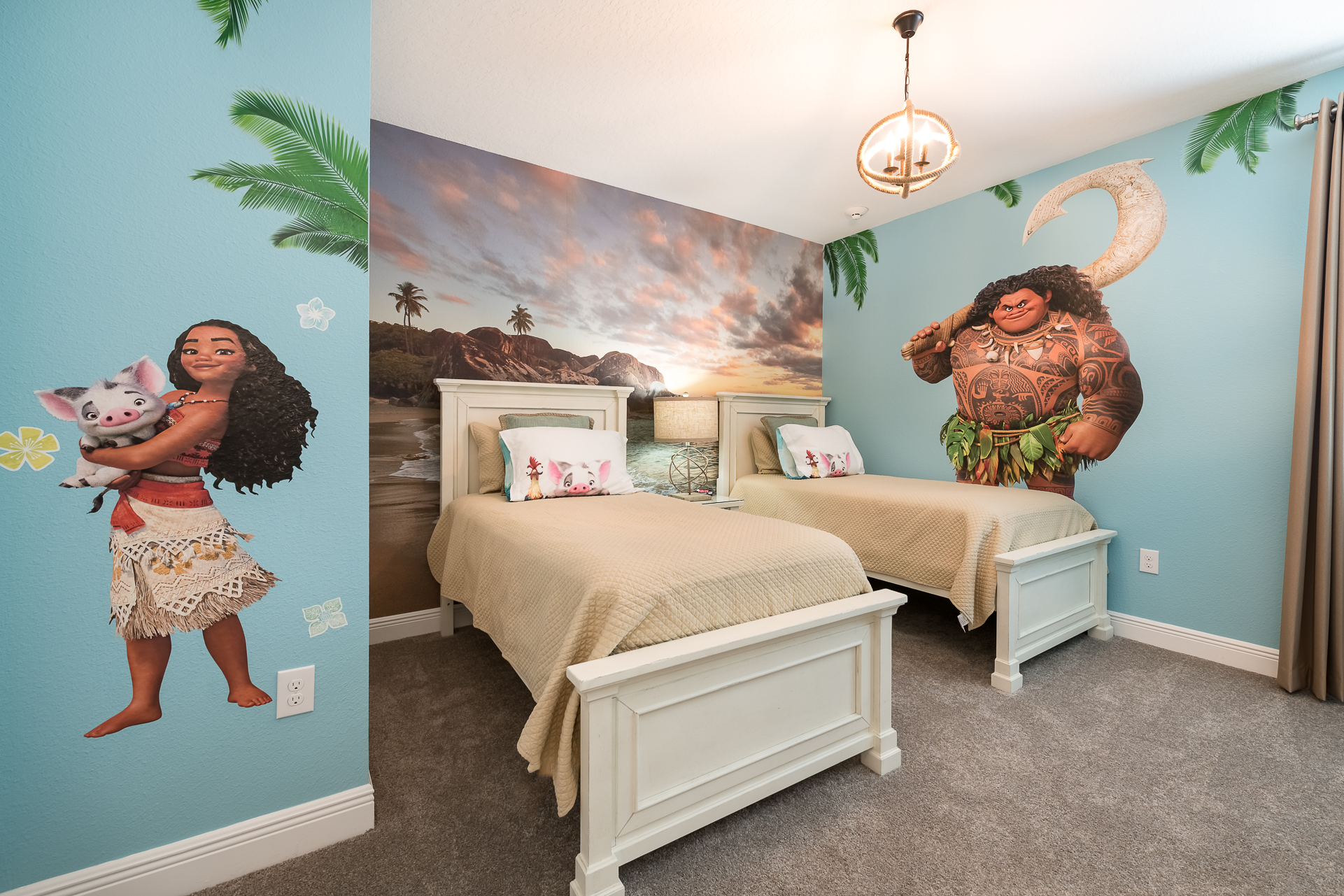 Themed bedroom with 2x Twin sized beds and an en suite/family bathroom (shower)