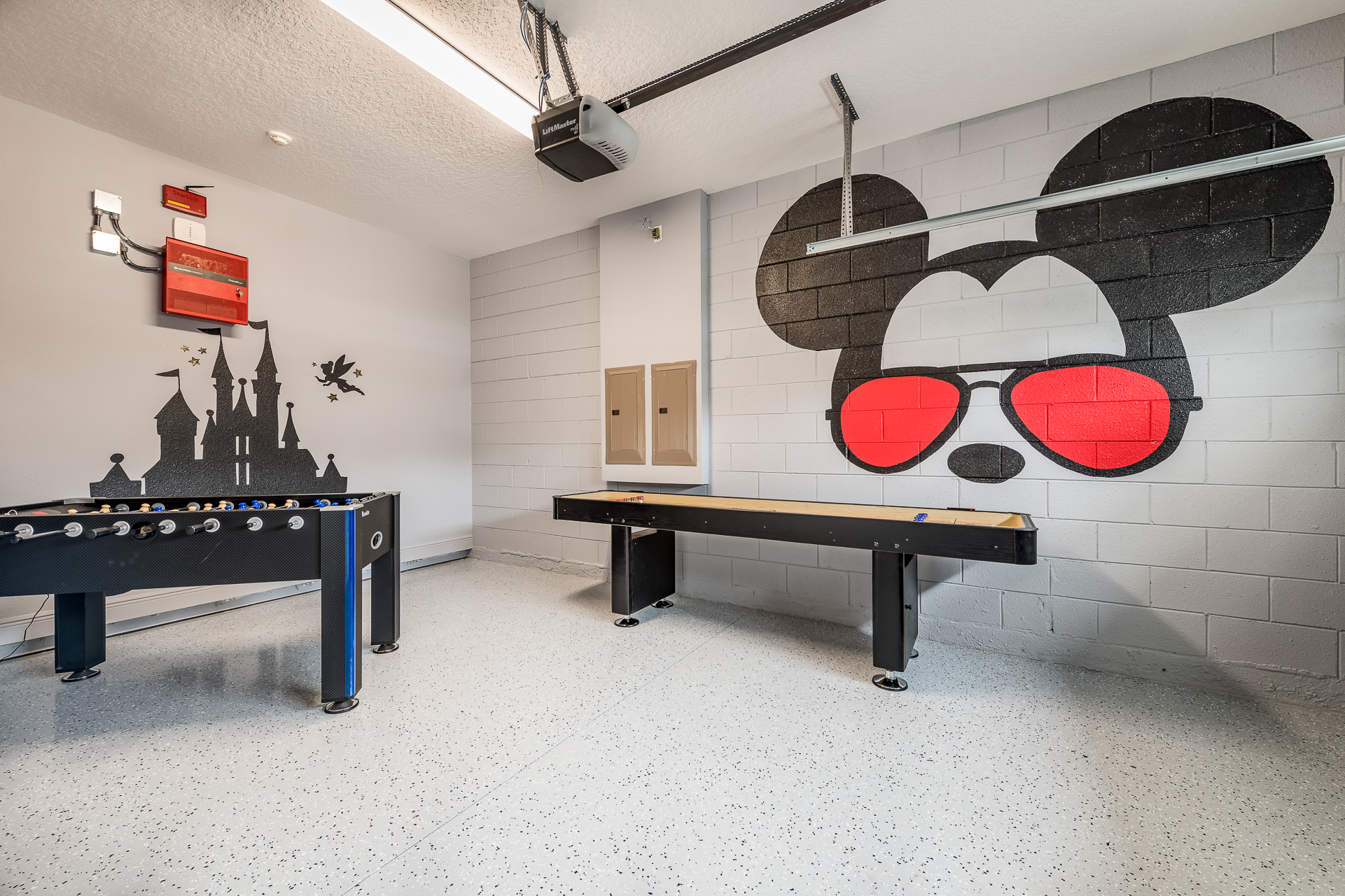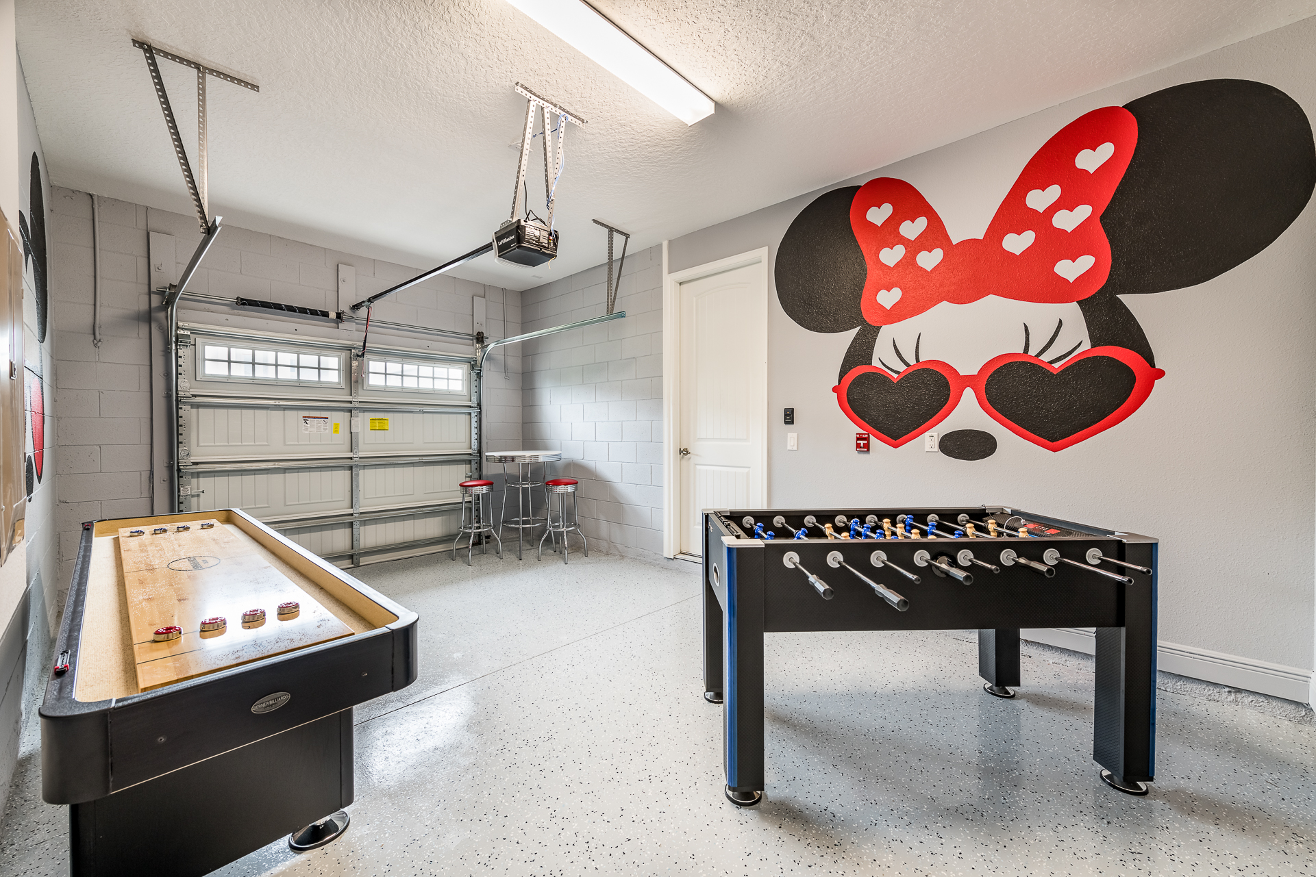 Themed games room has a 2 seat high top table, foosball and shuffleboard table