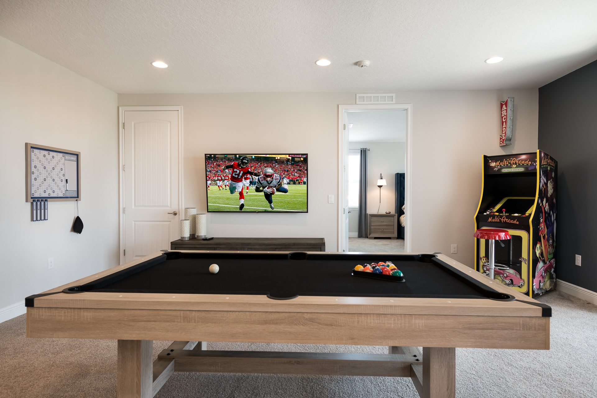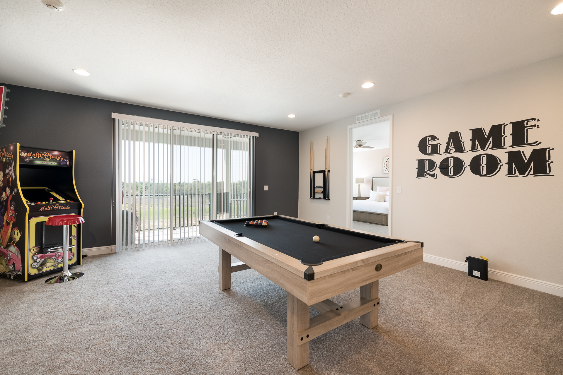Upper floor loft area has a wet bar, pool table, multi-arcade video game, flat screen TV, private balcony access over the pool deck (2x patio chairs, 2 seat high top table)