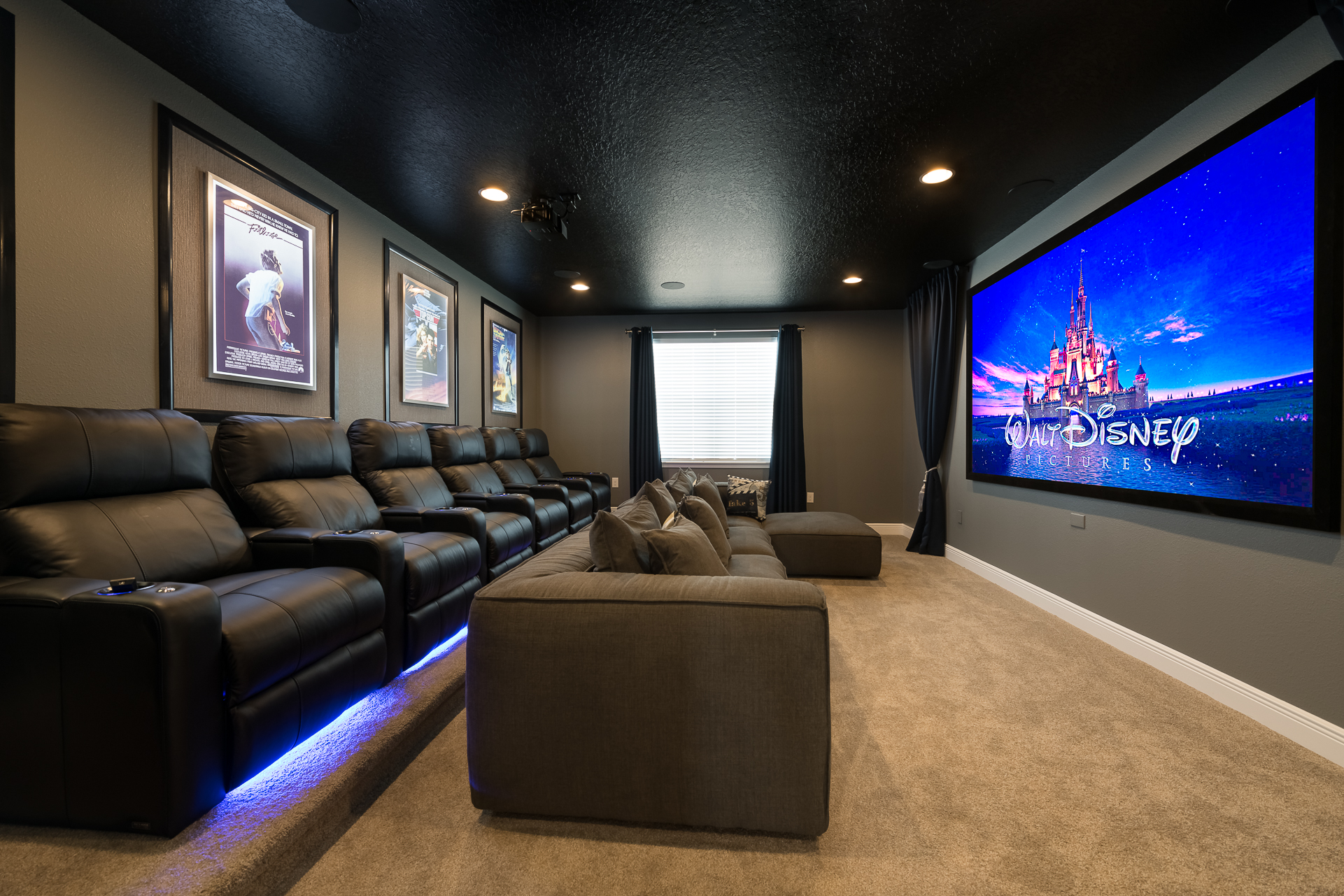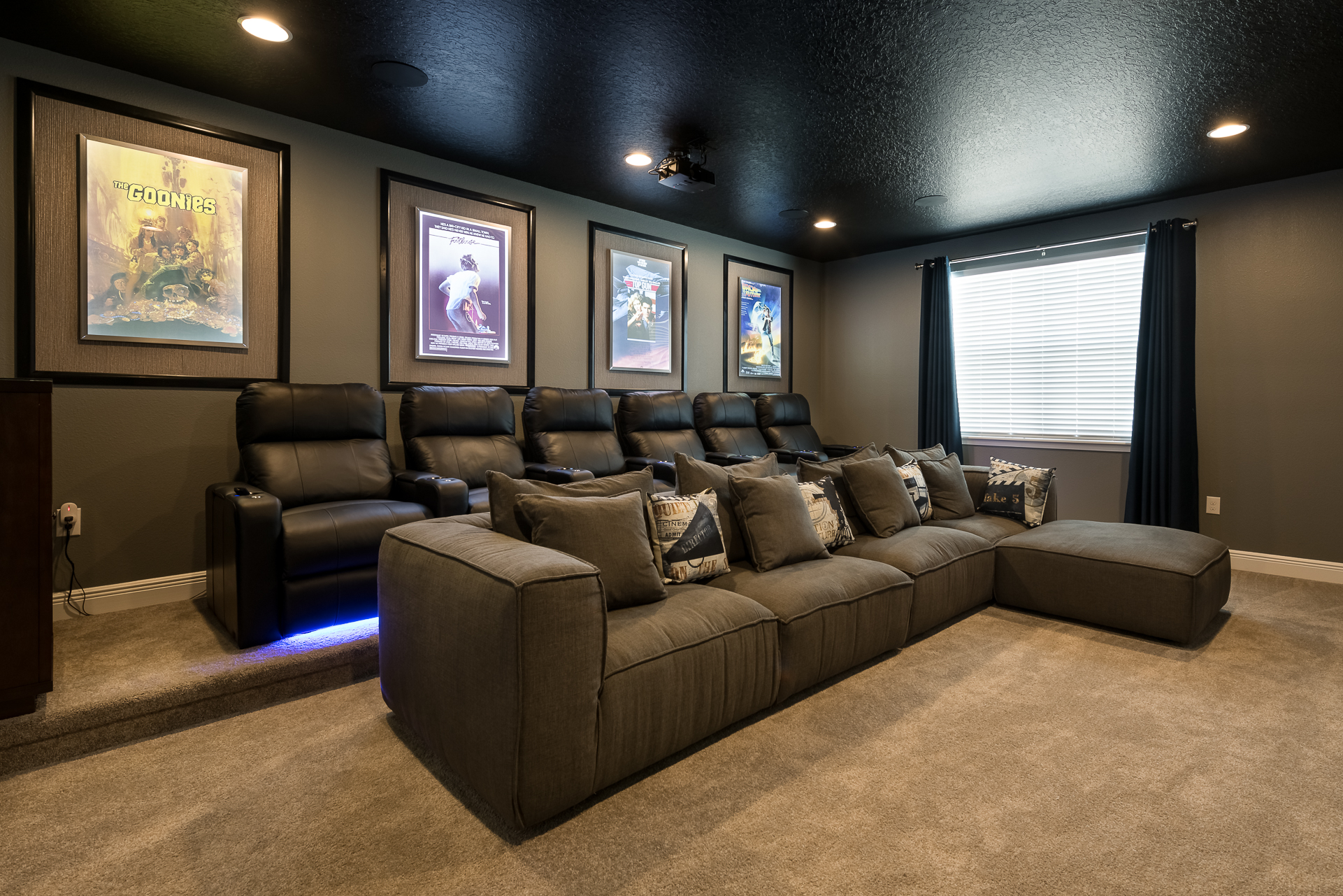 Home theater has a large projection screen, comfortable sectional, 6x leather recliners