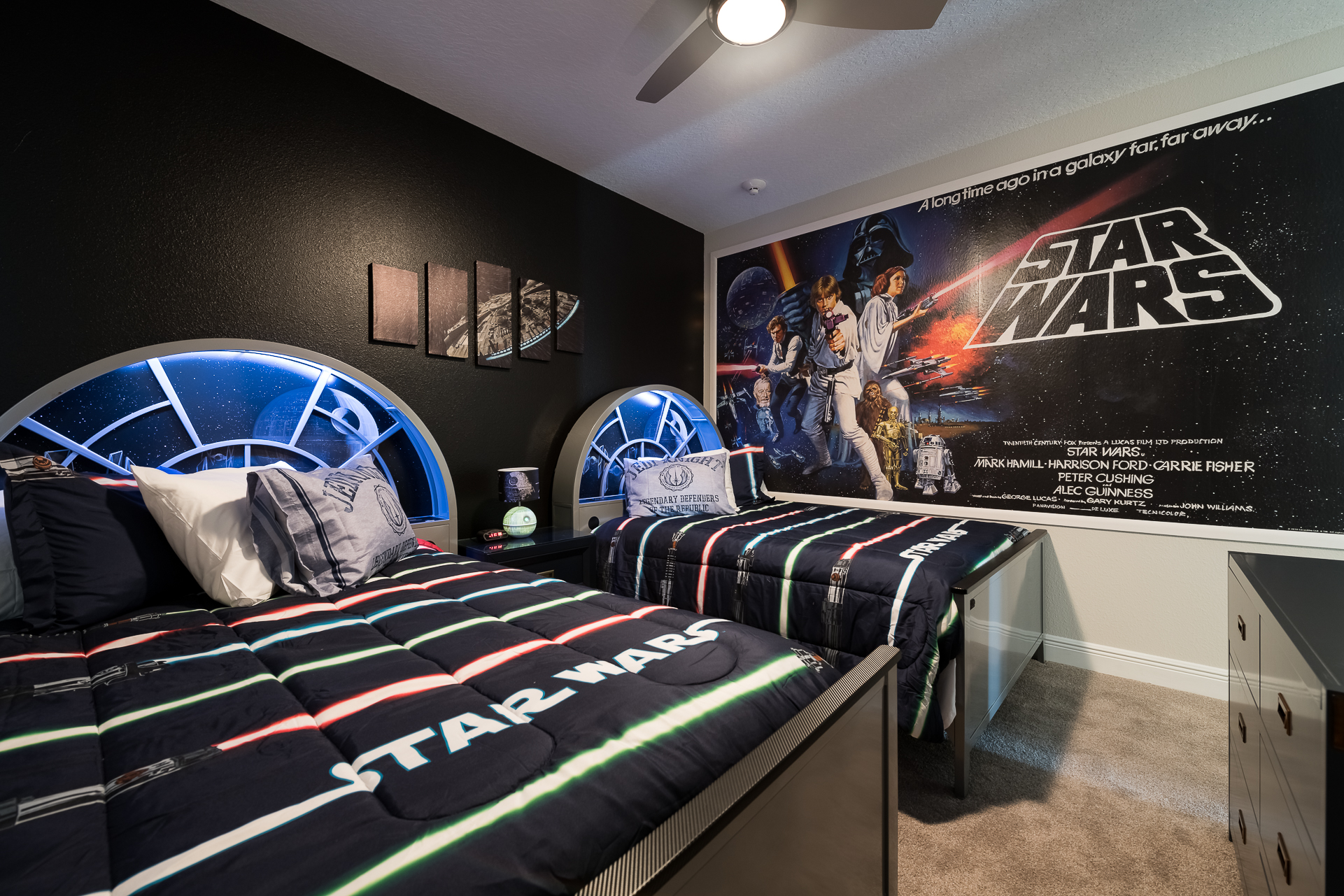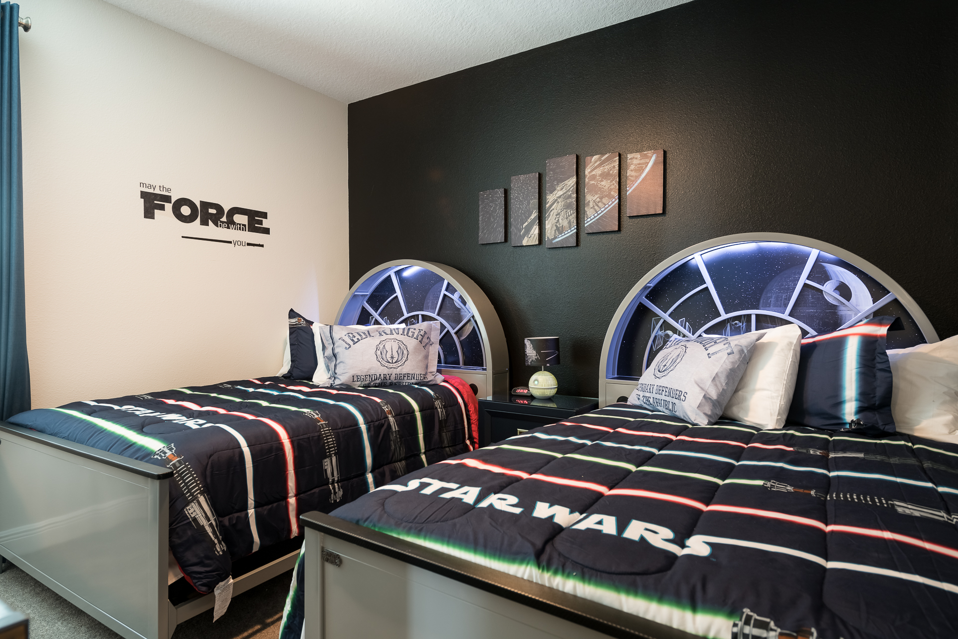 Galactic themed bedroom with 2x Full sized beds and an en suite (shower)